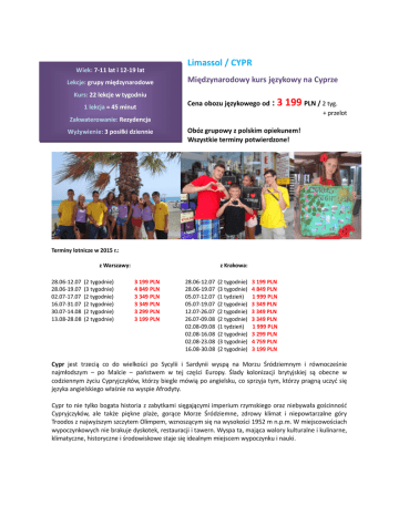Wiek: 7-11 lat i 12-19 lat Lekcje: grupy międzynarodowe Kurs: 22 lekcje w tygodniu 1 lekcja = 45 minut Limassol / CYPR Międzynarodowy kurs językowy na Cyprze Cena obozu językowego od : 3 199 PLN / 2 tyg. + przelot Zakwaterowanie: Rezydencja Wyżywienie: 3 posiłki dziennie Obóz grupowy z polskim opiekunem! Wszystkie terminy potwierdzone! Terminy lotnicze w 2015 r.: z Warszawy: 28.06-12.07 28.06-19.07 02.07-17.07 16.07-31.07 30.07-14.08 13.08-28.08 (2 tygodnie) (3 tygodnie) (2 tygodnie) (2 tygodnie) (2 tygodnie) (2 tygodnie) z Krakowa: 3 199 PLN 4 849 PLN 3 349 PLN 3 349 PLN 3 299 PLN 3 199 PLN 28.06-12.07 28.06-19.07 05.07-12.07 05.07-19.07 12.07-26.07 26.07-09.08 02.08-09.08 02.08-16.08 02.08-23.08 16.08-30.08 (2 tygodnie) (3 tygodnie) (1 tydzień) (2 tygodnie) (2 tygodnie) (2 tygodnie) (1 tydzień) (2 tygodnie) (3 tygodnie) (2 tygodnie) 3 199 PLN 4 849 PLN 1 999 PLN 3 349 PLN 3 349 PLN 3 349 PLN 1 999 PLN 3 299 PLN 4 759 PLN 3 199 PLN Cypr jest trzecią co do wielkości po Sycylii i Sardynii wyspą na Morzu Śródziemnym i równocześnie najmłodszym – po Malcie – państwem w tej części Europy. Ślady kolonizacji brytyjskiej są obecne w codziennym życiu Cypryjczyków, którzy biegle mówią po angielsku, co sprzyja tym, którzy pragną uczyć się języka angielskiego właśnie na wyspie Afrodyty. Cypr to nie tylko bogata historia z zabytkami sięgającymi imperium rzymskiego oraz niebywała gościnność Cypryjczyków, ale także piękne plaże, gorące Morze Śródziemne, zdrowy klimat i niepowtarzalne góry Troodos z najwyższym szczytem Olimpem, wznoszącym się na wysokości 1952 m n.p.m. W miejscowościach wypoczynkowych nie brakuje dyskotek, restauracji i tawern. Wyspa ta, mająca walory kulturalne i kulinarne, klimatyczne, historyczne i środowiskowe staje się idealnym miejscem wypoczynku i nauki. MIEJSCOWOŚĆ: Limassol to duże nadmorskie miasto z przepiękną starówką, będące drugim co do wielkości miastem na Cyprze. To także duży ośrodek wypoczynkowy o kosmopolitycznym charakterze, zwany często miastem zabawy i rozrywki. LOKALIZACJA: Kampus ESSC znajduje się w samym sercu turystycznej części Limassol, blisko plaży, kafejek, restauracji oraz sklepów. OPIS SZKOŁY: English Sunny School of Cyprus jest szkołą letnią, od 2000 roku organizującą kursy i obozy dla dzieci i młodzieży w wieku 7-19 lat oraz dorosłych. Nauka odbywa się w grupach międzynarodowych (uczestnicy pochodzą głównie z Francji, Rosji, Włoch, Hiszpanii, Słowacji, Polski i innych krajów). Nauczyciele to profesjonalna lokalna kadra głównie pochodzenia anglosaskiego z wieloletnim doświadczeniem w nauczaniu języków obcych. Budynek, w którym odbywają się zajęcia położony jest 5 minut piechotą od kampusu. Sale są odpowiednio wyposażone i dostosowane do prowadzenia zajęć. NAUKA W SZKOLE: Nasi uczestnicy odbędą kurs angielskiego składający się z 22 lekcji w tygodniu, każda po 45 minut. Nauka prowadzona jest na wszystkich poziomach zaawansowania, w grupach liczących maksymalnie 15 osób. Przydział do grup odbywa się na podstawie testu kwalifikacyjnego. Podczas zajęć nacisk położony jest na praktyczne wykorzystanie znajomości języka. Zapewniamy zestaw bezpłatnych materiałów do nauki. Kurs zakończony jest egzaminem i otrzymaniem certyfikatu. ZAKWATEROWANIE: Uczestnicy obozu będą mieszkać w hotelu 3*, położony tuż przy plaży, w samym sercu turystycznej części miasta Limassol. Na terenie obiektu uczniowie mają do dyspozycji przestronny basen z leżakami, kafeterię, restaurację i salę telewizyjną. W lobby hotelowym można korzystać z bezpłatnego dostępu do Wi-Fi. Uczniowie mieszkają w klimatyzowanych pokojach z łazienkami i balkonami. Uczestnicy zakwaterowani są w pokojach 4-osobowych. WYŻYWIENIE: Trzy posiłki dziennie: śniadanie w formie bufetu, ciepły lunch i obiadokolacja w formie bufetu. PROGRAM POPOŁUDNIOWY: Obowiązkowy dla młodzieży do 17. roku życia. Program obejmuje: • • • • • • • 1 całodniową wycieczkę w tygodniu (Waterpark, Pafos lub Nikozja) 1 półdniową wycieczkę w tygodniu (stare miasto Limassol lub plaża poza Limassol) 2 wejścia do dyskoteki kręgle zajęcia sportowe, gry i zabawy językowe, karaoke, wieczór cypryjski plażowanie, projekcje video w jęz. angielskim banana ride i rejs łódką DODATKOWE OPCJE: Kurs salsy – tylko w poniższych terminach: Kurs podstawowy: 10.08-14.08.2015 Kurs rozszerzony: 17.08-21.08.2015 Unikalna propozycja dla wszystkich tych, którzy chcieliby połączyć wypoczynek na cypryjskiej plaży z nauką gorącej salsy! To intensywny kurs dla początkujących oraz już znających podstawy. Doskonałe uzupełnienie zarówno obozu wypoczynkowego, jak i kursu językowego! Uczestnicy mogą zapisać się na 1 lub 2 tygodnie kursu. Zajęcia odbywają się 4 razy w tygodniu wieczorem po 2 godziny zegarowe. Kurs windsurfingu lub kitesurfingu Dla niepełnoletnich miłośników sportów wodnych proponowany jest kurs windsurfingu. Kurs świetnie nadaje się dla tych, którzy po raz pierwszy rozpoczynają przygodę z windsurfingiem. Dla osób pełnoletnich możliwy jest kurs kitesurfingu. Kursy te są dostępne w każdym terminie. Standardowe kursy to 6 godzin zajęć praktycznych plus zajęcia teoretyczne (zależne od poziomu zaawansowania uczestnika). Polecamy każdemu fanowi wodnych szaleństw! Kurs nurkowania PADI Scuba Diver (10 zajęć), PADI Open Water Dive (8 zajęć). Kursy w systemie PADI mogą być początkiem jednej z najbardziej fascynujących przygód sportowych naszych czasów! Niegdyś elitarne zajęcie, dziś dostępne dla wielu. Cypryjskie podwodne ogrody obfitują w ryby, bezkręgowce i formacje skalne, które możemy podziwiać już na głębokości od kilku do kilkunastu metrów. A zdobyte uprawnienia wykorzystać w czasie następnych wyjazdów wakacyjnych na całym świecie! PADI to najbardziej rozpowszechniony system certyfikacji umiejętności 