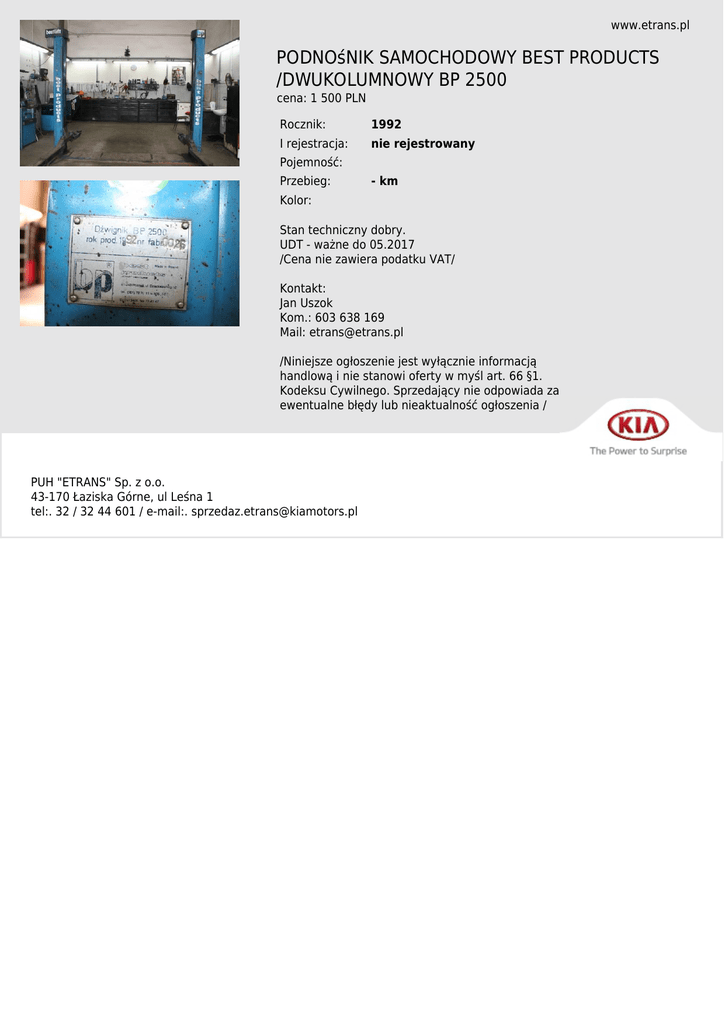 www.etrans.pl PODNOśNIK SAMOCHODOWY BEST PRODUCTS /DWUKOLUMNOWY BP 2500 cena: 1 500 PLN Rocznik: 1992 I rejestracja: nie rejestrowany Pojemność: Przebieg: - km Kolor: Stan techniczny dobry. UDT - ważne do 05.2017 /Cena nie zawiera podatku VAT/ Kontakt: Jan Uszok Kom.: 603 638 169 Mail: [email protected] /Niniejsze ogłoszenie jest wyłącznie informacją handlową i nie stanowi oferty w myśl art. 66 §1. Kodeksu Cywilnego. Sprzedający nie odpowiada za ewentualne błędy lub nieaktualność ogłoszenia / PUH "ETRANS" Sp. z o.o. 43-170 Łaziska Górne, ul Leśna 1 tel:. 32 / 32 44 601 / e-mail:. [email protected]