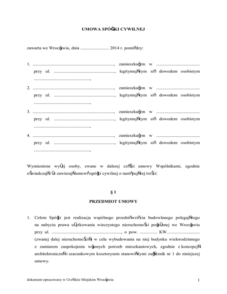 UMOWA SPÓŁKI CYWILNEJ zawarta we Wrocławiu, dnia ......................... 2014 r. pomiędzy: 1. ......................................................................., zamieszkałym w ...................................... przy ul. ....................................................., legitymującym się dowodem osobistym ................................................., 2. ......................................................................., zamieszkałym w ...................................... przy ul. ....................................................., legitymującym się dowodem osobistym ................................................., 3. ......................................................................., zamieszkałym w ...................................... przy ul. ....................................................., legitymującym się dowodem osobistym ................................................., 4. ......................................................................., zamieszkałym w ...................................... przy ul. ....................................................., legitymującym się dowodem osobistym ................................................., Wymienione wyżej osoby, zwane w dalszej części umowy Wspólnikami, zgodnie oświadczają, że zawierają umowę spółki cywilnej o następującej treści: §1 PRZEDMIOT UMOWY 1. Celem Spółki jest realizacja wspólnego przedsięwzięcia budowlanego polegającego na nabyciu prawa użytkowania wieczystego nieruchomości położonej we Wrocławiu przy ul. ............................................................., o pow. ............... KW............................. (zwanej dalej nieruchomością) w celu wybudowania na niej budynku wielorodzinnego z zamiarem zaspokojenia własnych potrzeb mieszkaniowych, zgodnie z koncepcją architektoniczną i szacunkowym kosztorysem stanowiącymi załącznik nr 1 do niniejszej umowy. dokument opracowany w Urzędzie Miejskim Wrocławia 1 2. Wspólnicy ustalają, że w budynku mieszkalnym wielorodzinnym: - lokal mieszkalny nr 1 wraz z udziałem w częściach wspólnych po ustanowieniu odrębnej własności lokalu będzie własnością ................................................................. - lokal mieszkalny nr 2 wraz z udziałem w częściach wspólnych po ustanowieniu odrębnej własności lokalu będzie własnością ................................................................. - lokal mieszkalny nr 3 wraz z udziałem w częściach wspólnych po ustanowieniu odrębnej własności lokalu będzie własnością ................................................................. - lokal mieszkalny nr 4 wraz z udziałem w częściach wspólnych po ustanowieniu odrębnej własności lokalu będzie własnością ................................................................. np. lokal mieszkalny nr 1 wraz z udziałem w częściach wspólnych po ustanowieniu odrębnej własności lokalu będzie własnością Jana Kowalskiego Jeżeli lokal usługowy będzie własnością jednego Wspólnika, również powinien być wymieniony w tym punkcie. 3. Wspólne przedsięwzięcie budowlane będzie obejmowało w szczególności: a. przygotowanie dokumentacji wymaganej w ogłoszeniu o przetargu na oddanie nieruchomości w użytkowanie wieczyste; b. przystąpienie do przetargu oraz, w przypadku jego wygrania, nabycie prawa użytkowania wieczystego nieruchomości w udziałach, które odpowiadają wielkości planowanowanych lokali mieszkalnych wraz z pomieszczeniami przynależnymi w stosunku do powierzchni wszystkich lokali mieszkalnych wraz z pomieszczeniami przynależnymi tzn.: - .........................- ....... udziału w nieruchomości, - .........................- ....... udziału w nieruchomości, - .........................- ....... udziału w nieruchomości, - .........................- ....... udziału w nieruchomości; np. Jan Kowalski – 1/4 udziału w nieruchomości (jako wielkość planowanego lokalu nr 1 wraz z powierzchnią przynależną do lokalu nr 1 w stosunku do powierzchni wszystkich lokali mieszkalnych wraz z powierzchnią do nich przynależną) dokument opracowany w Urzędzie Miejskim Wrocławia 2 c. opracowanie dokumentacji projektowo-kosztorysowej i uzyskanie pozwolenia na budowę, zgodnie z koncepcją architektoniczną, stanowiącą załącznik nr 1 do niniejszej umowy; d. realizację procesu budowlanego zgodnie z terminami określonymi w umowie o oddaniu gruntu w użytkowanie wieczyste oraz harmonogramem prac stanowiącym załącznik nr 2 do niniejszej umowy; e. uzyskanie pozwolenia na użytkowanie; f. ustalenie udziałów w częściach wspólnych budynku i prawie użytkowania wieczystego gruntu, dokonanie ostatecznych wzajemnych rozliczeń między Wspólnikami oraz wyodrębnienie własności poszczególnych lokali mieszkalnych (i użytkowych, jeśli takie przewidziano). §2 WKŁADY 1. Wspólnicy wnoszą do Spółki następujące wkłady pieniężne o wartości: - ........................ – wkład pieniężny w wysokości ................ zł, - ........................ – wkład pieniężny w wysokości ................ zł, - ........................ – wkład pieniężny w wysokości ................ zł, - ........................ – wkład pieniężny w wysokości ................ zł. np. Jan Kowalski – wkład pieniężny w wysokości 20.000 zł. Założenie powyższego zapisu jest takie, że wysokość wkładów pieniężnych będzie pozwalała na nabycie na współwłasność prawa wieczystego użytkowania nieruchomości. Jest to o tyle istotne, że pozwoli na wstępie określić, iż wszyscy Wspólnicy dysponują środkami na nabycie prawa wieczystego użytkowania nieruchomości w postępowaniu przetargowym. Wysokość wkładów powinna wynikać z udziałów określonych w §1 ust. 3 pkt b. Od wniesionych wkładów należy uiścić podatek od czynności cywilno-prawnych w wysokości 0,5% władów. doku