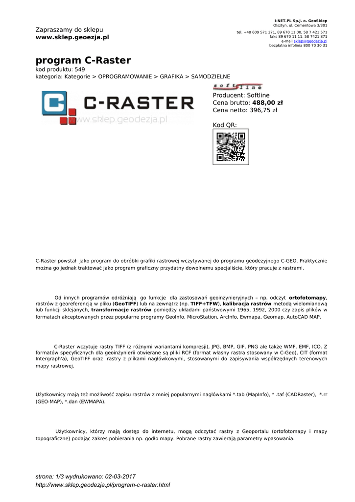 I-NET.PL Sp.J. o. GeoSklep Olsztyn, ul. Cementowa 3/301 Zapraszamy do sklepu www.sklep.geoezja.pl tel. +48 609 571 271, 89 670 11 00, 58 7 421 571 faks 89 670 11 11, 58 7421 871 e-mail [email protected] bezpłatna infolinia 800 70 30 31 program C-Raster kod produktu: 549 kategoria: Kategorie > OPROGRAMOWANIE > GRAFIKA > SAMODZIELNE Producent: Softline Cena brutto: 488,00 zł Cena netto: 396,75 zł Kod QR: C-Raster powstał jako program do obróbki grafiki rastrowej wczytywanej do programu geodezyjnego C-GEO. Praktycznie można go jednak traktować jako program graficzny przydatny dowolnemu specjaliście, który pracuje z rastrami. Od innych programów odróżniają go funkcje dla zastosowań geoinżynieryjnych – np. odczyt ortofotomapy, rastrów z georeferencją w pliku (GeoTIFF) lub na zewnątrz (np. TIFF+TFW), kalibracja rastrów metodą wielomianową lub funkcji sklejanych, transformacje rastrów pomiędzy układami państwowymi 1965, 1992, 2000 czy zapis plików w formatach akceptowanych przez popularne programy GeoInfo, MicroStation, ArcInfo, Ewmapa, Geomap, AutoCAD MAP. C-Raster wczytuje rastry TIFF (z różnymi wariantami kompresji), JPG, BMP, GIF, PNG ale także WMF, EMF, ICO. Z formatów specyficznych dla geoinżynierii otwierane są pliki RCF (format własny rastra stosowany w C-Geo), CIT (format Intergraph'a), GeoTIFF oraz rastry z plikami nagłówkowymi, stosowanymi do zapisywania współrzędnych terenowych mapy rastrowej. Użytkownicy mają też możliwość zapisu rastrów z mniej popularnymi nagłówkami *.tab (MapInfo), * .taf (CADRaster), *.rr (GEO-MAP), *.dan (EWMAPA). Użytkownicy, którzy mają dostęp do internetu, mogą odczytać rastry z Geoportalu (ortofotomapy i mapy topograficzne) podając zakres pobierania np. godło mapy. Pobrane rastry zawierają parametry wpasowania. strona: 1/3 wydrukowano: 02-03-2017 http://www.sklep.geodezja.pl/program-c-raster.html C-Raster posiada też bezpośrednią obsługę skanera z możliwością ustawienia rozdzielczości i systemu kolorów. Program umożliwia kalibrację rastrów metodami: wielomianową i metodą funkcji sklejanych. Obie metody stosuje się gdy rastry są mocno zniekształcone nieliniowo. Poprzez użycie tych metod, gdy wskazane zostaną punkty rastra do wpasowania, uzyska się w efekcie raster przekształcony tak aby punkty dostosowania miały współrzędne po kalibracji takie jak zadane współrzędne w układzie globalnym. Dodatkowo są wyznaczane wartości odchyłek dX i dY na punktach dostosowania wyznaczone metodą transformacji Helmerta - pozwala to ocenić stopień zniekształcenia rastra przed wykonaniem kalibracji. Punkty wpasowania z błędami przekraczającymi zadane kryteria mogą być podświetlane na czerwono. Ponadto działają funkcje wskazywania kolejnych punktów siatki kwadratów na kalibrowanej mapie oraz wyliczające ich współrzędne globalne. Można też wyznaczyć parametry wpasowania bez kalibracji, należy znać i wpisać do okna Parametry wartości: rozmiar piksela po osi X,Y, współrzędne X i Y wpięcia rastra. Ponieważ powyższe parametry nie są najczęściej znane, wprowadzono ich wyznaczanie na podstawie: rozdzielczości skanu w DPI, skali oryginalnego ,,papierowego" rysunku/mapy, która została zeskanowana, określenia narożnika rastra dla którego podamy współrzędne wpięcia rastra (lewy dolny, lewy górny, prawy górny, prawy dolny), współrzędnych wpięcia rastra X, Y, które zostaną przyporządkowane narożnikowi rastra. W menu "Efekty" narzędzia polepszania jakości rastra: usuwanie pojedynczych odseparowanych pikseli, usuwanie szumu. Dodawanie do rysunku clipartu z biblioteki symboli. Edycja i rysowanie obiektów wektorowych: linii łamanych, wielokątów, okręgów, elips. "Dokładne rysowanie" - możliwość rysowania obiektów poprzez wpisywanie z klawiatury: - przyrostów współrzędnych X, Y w układzie ortogonalnym, - odległości i kąta w układzie biegunowym. Opcje przyciągania do istniejących obiektów wektorowych podczas rysowania: strona: 2/3 wydrukowano: 02-03-2017 http://www.sklep.geodezja.pl/program-c-raster.html - do punktów węzłowych, punktu środkowego (np. linii), do środka (np. okręgu), - do punktu początkowego obiektu - punktu, który w danym obiekcie został narysowany jako pierwszy, do punktu najbliższego, do punktów końcowych, - do środka obiektu ( wskazuje jeden środkowy punkt całej linii łamanej, natomiast ,,,do punktu środkowego" wskazuje środek każdego z odcinków łamanej), - do przecięcia (dwu obiektów), do stycznej (np. rysowanie prostej stycznej do okręgu), - prostopadle - do wskazanego boku obiektu, równolegle - do wskazanego boku obiektu. Ustawianie wzoru wypełnienia zamkniętych obiektów rysunku, oraz stylu linii obiektów, ustalanie które obiekty przysłaniają lub nie przysłaniają pozostałe. Możliwość cofania i ponowienia operacji wykonanych na obiektach wektorowych. Dodane na rastrze obiekty wektorowe mogą być przekształcone w raster i zapisane jako całość z plikiem rastrowym. Funkcje umożliwiające pomiar odległości, kąta, pola powierzchni dla punktów wskazywanych na rysunku – wyniki są podawane w jednostkach terenowych – wymaga wcześniej wpasowanego rastra lub rastra z georeferencją. strona: 3/3 wydrukowano: 02-03-2017 http://www.sklep.geodezja.pl/program-c-raster.html