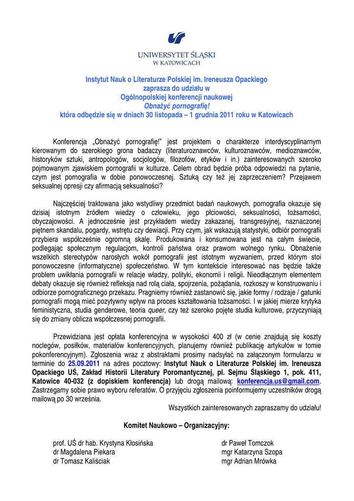 Instytut Nauk o Literaturze Polskiej im. Ireneusza Opackiego zaprasza do udziału w Ogólnopolskiej konferencji naukowej Obnażyć pornografię! która odbędzie się w dniach 30 listopada – 1 grudnia 2011 roku w Katowicach Konferencja „Obnażyć pornografię!” jest projektem o charakterze interdyscyplinarnym kierowanym do szerokiego grona badaczy (literaturoznawców, kulturoznawców, medioznawców, historyków sztuki, antropologów, socjologów, filozofów, etyków i in.) zainteresowanych szeroko pojmowanym zjawiskiem pornografii w kulturze. Celem obrad będzie próba odpowiedzi na pytanie, czym jest pornografia w dobie ponowoczesnej. Sztuką czy też jej zaprzeczeniem? Przejawem seksualnej opresji czy afirmacją seksualności? Najczęściej traktowana jako wstydliwy przedmiot badań naukowych, pornografia okazuje się dzisiaj istotnym źródłem wiedzy o człowieku, jego płciowości, seksualności, tożsamości, obyczajowości. A jednocześnie jest przykładem wiedzy zakazanej, transgresyjnej, naznaczonej piętnem skandalu, pogardy, wstrętu czy dewiacji. Przy czym, jak wskazują statystyki, odbiór pornografii przybiera współcześnie ogromną skalę. Produkowana i konsumowana jest na całym świecie, podlegając społecznym regulacjom, kontroli państwa oraz prawom wolnego rynku. Obnażenie wszelkich stereotypów narosłych wokół pornografii jest istotnym wyzwaniem, przed którym stoi ponowoczesne (informatyczne) społeczeństwo. W tym kontekście interesować nas będzie także problem uwikłania pornografii w relacje władzy, polityki, ekonomii i religii. Nieodłącznym elementem debaty okazuje się również refleksja nad rolą ciała, spojrzenia, pożądania, rozkoszy w konstruowaniu i odbiorze pornograficznego przekazu. Pragniemy również zastanowić się, jakie formy / rodzaje / gatunki pornografii mogą mieć pozytywny wpływ na proces kształtowania tożsamości. I w jakiej mierze krytyka feministyczna, studia genderowe, teoria queer, czy też szeroko pojęte studia kulturowe, przyczyniają się do zmiany oblicza współczesnej pornografii. Przewidziana jest opłata konferencyjna w wysokości 400 zł (w cenie znajdują się koszty noclegów, posiłków, materiałów konferencyjnych, planujemy również publikację artykułów w tomie pokonferencyjnym). Zgłoszenia wraz z abstraktami prosimy nadsyłać na załączonym formularzu w terminie do 25.09.2011 na adres pocztowy: Instytut Nauk o Literaturze Polskiej im. Ireneusza Opackiego UŚ, Zakład Historii Literatury Poromantycznej, pl. Sejmu Śląskiego 1, pok. 411, Katowice 40-032 (z dopiskiem konferencja) lub drogą mailową: [email protected]. Zastrzegamy sobie prawo wyboru referatów. O przyjęciu zgłoszenia poinformujemy uczestników drogą mailową po 30 września. Wszystkich zainteresowanych zapraszamy do udziału! Komitet Naukowo – Organizacyjny: prof. UŚ dr hab. Krystyna Kłosińska dr Magdalena Piekara dr Tomasz Kaliściak dr Paweł Tomczok mgr Katarzyna Szopa mgr Adrian Mrówka FORMULARZ ZGŁOSZENIA DO UDZIAŁU W OGÓLNOPOLSKIEJ KONFERENCJI NAUKOWEJ „OBNAŻYĆ PORNOGRAFIĘ!” Katowice, 30 listopada – 1 grudnia 2011 Tytuł / stopień naukowy, imię i nazwisko: Instytucja: Temat wystąpienia: Abstrakt (do 2000 znaków): Adres korespondencyjny: Adres mailowy: