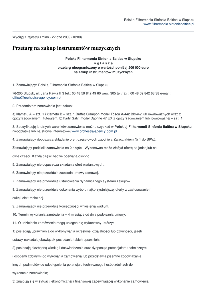 Polska Filharmonia Sinfonia Baltica w Słupsku www.filharmonia.sinfoniabaltica.pl Wyciąg z rejestru zmian - 22 cze 2009 (10:00) Przetarg na zakup instrumentów muzycznych Polska Filharmonia Sinfonia Baltica w Słupsku ogłasza przetarg nieograniczony o wartości poniżej 206 000 euro na zakup instrumentów muzycznych 1. Zamawiający: Polska Filharmonia Sinfonia Baltica w Słupsku 76-200 Słupsk, ul: Jana Pawła II 3 tel.: 00 48 59 842 49 60 wew. 305 tel./fax : 00 48 59 842 63 38 e-mail : [email protected] 2. Przedmiotem zamówienia jest zakup: a) klarnetu A – szt. 1 i klarnetu B – szt. 1 Buffet Crampon model Tosca A/442 Bb/442 lub równoważnych wraz z oprzyrządowaniem i futerałem, b) harfy Salvi model Daphne 47 EX z oprzyrządowaniem lub równoważnej – szt. 1 3. Specyfikację istotnych warunków zamówienia można uzyskać w Polskiej Filharmonii Sinfonia Baltica w Słupsku nieodpłatnie lub na stronie internetowej www.orchestra-agency.com.pl 4. Zamawiający dopuszcza składanie ofert częściowych zgodnie z Załącznikiem Nr 1 do SIWZ. Zamawiający podzielił zamówienie na 2 części. Wykonawca może złożyć ofertę na jedną lub na dwie części. Każda część będzie oceniana osobno. 5. Zamawiający nie dopuszcza składania ofert wariantowych. 6. Zamawiający nie przewiduje zawarcia umowy ramowej. 7. Zamawiający nie przewiduje ustanowienia dynamicznego systemu zakupów. 8. Zamawiający nie przewiduje dokonania wyboru najkorzystniejszej oferty z zastosowaniem aukcji elektronicznej. 9. Zamawiający nie przewiduje konieczności wniesienia wadium. 10. Termin wykonania zamówienia – 4 miesiące od dnia podpisania umowy. 11. O udzielenie zamówienia mogą ubiegać się wykonawcy, którzy: 1) posiadają uprawnienia do wykonywania określonej działalności lub czynności, jeżeli ustawy nakładają obowiązek posiadania takich uprawnień; 2) posiadają niezbędną wiedzę i doświadczenie oraz dysponują potencjałem technicznym i osobami zdolnymi do wykonania zamówienia lub przedstawią pisemne zobowiązanie innych podmiotów do udostępnienia potencjału technicznego i osób zdolnych do wykonania zamówienia; 3) znajdują się w sytuacji ekonomicznej i finansowej zapewniającej wykonanie zamówienia; 4) nie podlegają wykluczeniu z postępowania o udzielenie zamówienia. oraz załączą następujące dokumenty i oświadczenia potwierdzające spełnienie tych warunków: a) oświadczenie z art. 22 ust. 1 ustawy Pzp zgodnie z Zał. Nr 3 do SIWZ, b) aktualny odpis z właściwego rejestru albo aktualne zaświadczenie o wpisie do ewidencji działalności gospodarczej, jeżeli odrębne przepisy wymagają wpisu do rejestru lub zgłoszenia do ewidencji działalności gospodarczej, wystawiony nie wcześniej niż 6 miesięcy przed upływem terminu składania wniosku o dopuszczenie do udziału w postępowaniu o udzielenie zamówienia, Uwaga: Jeżeli Wykonawca prowadzi działalność gospodarczą w formie spółki cywilnej do oferty należy dołączyć umowę spółki cywilnej, c) aktualne zaświadczenia właściwego naczelnika urzędu skarbowego oraz właściwego oddziału Zakładu Ubezpieczeń Społecznych lub Kasy Rolniczego Ubezpieczenia Społecznego potwierdzających odpowiednio, że wykonawca nie zalega z opłacaniem podatków, opłat oraz składek na ubezpieczenie zdrowotne i społeczne lub zaświadczenie bądź zaświadczenia, że uzyskał przewidziane prawem zwolnienie, odroczenie lub rozłożenie na raty zaległych płatności lub wstrzymanie w całości wykonania decyzji właściwego organu - wystawione nie wcześniej niż 3 miesiące przed upływem terminu składania wniosków o dopuszczenie do udziału w postępowaniu, d) aktualną informację z Krajowego Rejestru Karnego (KRK) w zakresie określonym w art. 24 ust. 1 pkt 4-8 ustawy Pzp wystawioną nie wcześniej niż 6 miesięcy przed upływem terminu składania wniosków o dopuszczenie do udziału w niniejszym postępowaniu, e) aktualną informację z KRK dla podmiotów zbiorowych w zakresie wskazanym w art. 24 ust. 1 pkt 9 ustawy, wystawioną nie wcześniej niż 6 miesięcy przed upływem terminu składania wniosków o dopuszczenie do udziału w niniejszym postępowaniu, Pozostałe wymagane dokumenty: a) opis przedmiotu zamówienia uwzględniający wymagane parametry techniczne zawarte w pkt.II SIWZ, b) wypełniony formularz oferty (zgodny z załącznikiem nr 2 do SIWZ) zawierający oferowaną cenę sporządzony wg załączonego wzoru, c) oświadczenie o zgodności przedmiotu oferty z przedmiotem zamówienia złożone na druku zgodnym z formularzem oferty (załącznik nr 2 do SIWZ), d) oświadczenie_o przyjęciu projektu umowy stanowiącej integralną część SIWZ bez zastrzeżeń, złożone na druku zgodnym z formularzem oferty (załącznik nr 2 do SIWZ), Ocena spełniania powyższych warunków dokonana zostanie na podstawie przedłożonych przez Wykonawcę dokumentów określonych w SIWZ. 12. Kryteria oceny ofert - cena - 100% 13.Termin związania ofertą: 30 dni od terminu składania ofert. 14.Uprawnieni do kontaktów z wykonawcami : Jerzy Mazurek tel. - 059 8426338 Tadeusz Szemryk - 059 8488440 15. Ogłoszenie opublikowano w Biuletynie Zamówień Publicznych oraz na tablicy ogłoszeń i stronie internetowej Zamawiającego www.orchestra-agency.com.pl w dniu 19 czerwca 2009r. 16.CPV– 36310000-7 Instrumenty muzyczne 36320000-0 Części i akcesoria do instrumentów muzycznych Termin składania ofert: 30 czerwca 2009r. do godz.11.00 w siedzibie Zamawiającego, pok. Nr 5 (Sekretariat) Otwarcie ofert nastąpi w dniu 30 czerwca 2009r. o godz. 11.15 w siedzibie Zamawiającego, pok. Nr 5 (Sekretariat) Słupsk, dnia, 18 czerwca 2009r. Specyfikacja SIWZ - doc Data publikacji: 22.06.2009 (09:58) Data aktualizacji: 22.06.2009 (10:00) 41.22 kB 186 kB Osoba publikująca: Joanna Kubacka Osoba modyfikująca: Jerzy Mazurek Autor: Joanna Kubacka Polska Filharmonia Sinfonia Baltica w Słupsku Jana Pawła II 3, 76-200 Słupsk, 59 842