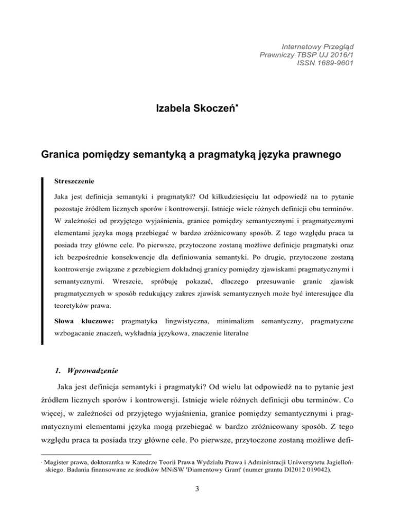 Internetowy Przegląd Prawniczy TBSP UJ 2016/1 ISSN 1689-9601 Izabela Skoczeń∗ Granica pomiędzy semantyką a pragmatyką języka prawnego Streszczenie Jaka jest definicja semantyki i pragmatyki? Od kilkudziesięciu lat odpowiedź na to pytanie pozostaje źródłem licznych sporów i kontrowersji. Istnieje wiele różnych definicji obu terminów. W zależności od przyjętego wyjaśnienia, granice pomiędzy semantycznymi i pragmatycznymi elementami języka mogą przebiegać w bardzo zróżnicowany sposób. Z tego względu praca ta posiada trzy główne cele. Po pierwsze, przytoczone zostaną możliwe definicje pragmatyki oraz ich bezpośrednie konsekwencje dla definiowania semantyki. Po drugie, przytoczone zostaną kontrowersje związane z przebiegiem dokładnej granicy pomiędzy zjawiskami pragmatycznymi i semantycznymi. Wreszcie, spróbuję pokazać, dlaczego przesuwanie granic zjawisk pragmatycznych w sposób redukujący zakres zjawisk semantycznych może być interesujące dla teoretyków prawa. Słowa kluczowe: pragmatyka lingwistyczna, minimalizm semantyczny, pragmatyczne wzbogacanie znaczeń, wykładnia językowa, znaczenie literalne 1. Wprowadzenie Jaka jest definicja semantyki i pragmatyki? Od wielu lat odpowiedź na to pytanie jest źródłem licznych sporów i kontrowersji. Istnieje wiele różnych definicji obu terminów. Co więcej, w zależności od przyjętego wyjaśnienia, granice pomiędzy semantycznymi i pragmatycznymi elementami języka mogą przebiegać w bardzo zróżnicowany sposób. Z tego względu praca ta posiada trzy główne cele. Po pierwsze, przytoczone zostaną możliwe defi∗ Magister prawa, doktorantka w Katedrze Teorii Prawa Wydziału Prawa i Administracji Uniwersytetu Jagiellońskiego. Badania finansowane ze środków MNiSW 'Diamentowy Grant' (numer grantu DI2012 019042). 3 nicje pragmatyki oraz ich bezpośrednie konsekwencje dla definiowania semantyki. Z uwagi na ograniczoną objętość niniejszej pracy, nie podejmę wątku dorobku amerykańskiego filozofa Wilfrida Sellarsa dotyczącego tej tematyki. Po drugie, przytoczone zostaną kontrowersje związane z przebiegiem dokładnej granicy pomiędzy zjawiskami pragmatycznymi i semantycznymi. Wreszcie spróbuję pokazać, dlaczego przesuwanie granic zjawisk pragmatycznych w sposób redukujący zakres zjawisk semantycznych może być interesujące dla teoretyków prawa. 2. Definicje pragmatyki – rys historyczny W leksykonie pojęć filozofii analitycznej znajduje się następujące określenie pragmatyki: aspekt języka ważny w analizach dotyczących teorii czynności mowy, zależności od kontekstu, znaczenia mówiącego czy struktury mowy dyskursywnej1. Aby zrozumieć poszczególne człony tej enumeracji, prześledźmy historyczny rozwój pojęcia. Termin pragmatyka został ukuty i po raz pierwszy użyty przez Charlesa Morrisa w 1938 roku w tekście pt. Podstawy teorii znaczenia2. Jego celem pozostawało zakreślenie granic semiotyki, poprzez którą rozumiał naukę o znakach, dzielącą się na trzy działy. Po pierwsze, „syntaktykę (lub składnię), która miała obejmować „formalne badania nad wzajemnymi relacjami między znakami”, semantykę, czyli badanie „relacji znaków do przedmiotów, do których znaki mogą by zastosowane” (ich desygnatów), oraz pragmatykę, zajmującą się badaniem „relacji znaków do ich interpretatorów”3. Morris pozostawał zdeklarowanym behawiorystą, dlatego postulował poszerzenie pola badawczego pragmatyki na takie dziedziny jak psycholingwistykę, socjolingwistykę czy neurolingwistykę4. W niniejszej pracy pozostaniemy jednak na filozoficznym poziomie deskrypcji, bez zajmowania stanowiska wobec np. kwestii przekaźników neuronalnych czy szerzej – funkcjonowania mózgu ludzkiego. Dużo węziej pragmatykę pojmował filozof analityczny Rudolf Carnap. Jego zdaniem są to rozważania dotyczące bezpośrednio użytkownika języka5. Dodatkowo sformułował on 1 P. Prechtl, Leksykon pojęć filozofii analitycznej, Kraków 2009, s. 96. C.W. Morris, Foundations of the Theory of Signs, [w:] O. Neurath, R. Carnap, C. Morris C. (red.), International Encyclopedia of Unified Science, Chicago 1938. 3 S.C. Lewinson, Pragmatyka [polski przekład Pragmatics 1983], Warszawa 2010, s. 2. 4 Ibidem. 5 R. Carnap, Pisma semantyczne, Warszawa 2007, s. 17. 2 4 pojęcie ‘czystej pragmatyki’ jako zajmującej się pojęciami „takimi jak przekonanie, wypowiedź lub intensja, i ich wzajemnymi relacjami logicznymi”6. W słynnym podręczniku pt. Pragmatics z 1983 roku Stephen Levinson podkreśla, że dla takich filozofów, jak Bar-Hilel, Kalish czy Montague centralnym pojęciem dla definiowania pragmatyki była ‘deiktyczność’ (od gr. deixis) czyli występowanie różnego rodzaju wyrażeń okazjonalnych. Wyrażenia okazjonalne to w pewnym uproszczeniu zwroty, których znaczenie jest silnie kontekstowo uwarunkowane, np. zależne od nadawcy. Są to takie zwroty jak: ja, ty, tam, tenże, tutaj, dzisiaj, jutro itd. Zatem dla wspomnianej grupy filozofów każdy język, sztuczny czy naturalny, jeśli tylko posiadał takie zwroty, to znajdował się w polu badawczym pragmatyki7. Podążając tropem chronologicznym, kolejnym nurtem badawczym wartym wspomnienia jest gramatyka generatywna. Nurt ten przejął Carnapowskie rozumienie pragmatyki jako dziedziny związanej z użytkownikami języka i jednocześnie go zmodyfikował. W efekcie otrzymano następującą definicję: są to „badania lingwistyczne, które w odpowiedni sposób zajmują się aspektami kontekstu”8. Z kolei przez kontekst rozumiano „wszystko to, co obejmuje tożsamość uczestników sytuacji komunikacyjnej, temporalne i związane z miejscem aspekty znaczenia mownego i (…) przekonania, wiedzę oraz intencje osób uczestniczących w danym zdarzeniu mownym (oraz wiele innych czynników)”9. Do problemu definiowania kontekstu jako centralnego pojęcia pragmatyki powrócimy w dalszej części tekstu.