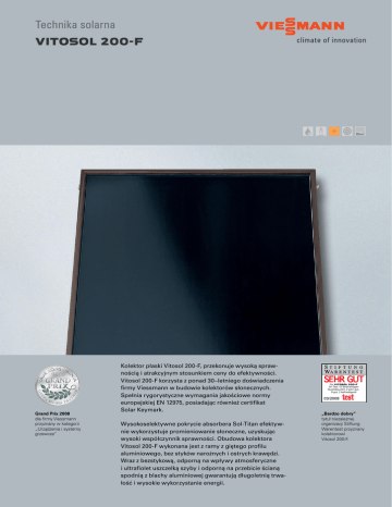 Technika solarna VITOSOL 200-F Grand Prix 2008 dla firmy Viessmann przyznany w kategorii „Urządzenia i systemy grzewcze” Kolektor płaski Vitosol 200-F, przekonuje wysoką sprawnością i atrakcyjnym stosunkiem ceny do efektywności. Vitosol 200-F korzysta z ponad 30–letniego doświadczenia firmy Viessmann w budowie kolektorów słonecznych. Spełnia rygorystyczne wymagania jakościowe normy europejskiej EN 12975, posiadając również certifikat Solar Keymark. Wysokoselektywne pokrycie absorbera Sol-Titan efektywnie wykorzystuje promieniowanie słoneczne, uzyskując wysoki współczynnik sprawności. Obudowa kolektora Vitosol 200-F wykonana jest z ramy z giętego profilu aluminiowego, bez styków narożnych i ostrych krawędzi. Wraz z bezstykową, odporną na wpływy atmosferyczne i ultrafiolet uszczelką szyby i odporną na przebicie ścianą spodnią z blachy aluminiowej gwarantują długoletnią trwałość i wysokie wykorzystanie energii. für VITOSOL 200-F Im Test: 12 Solaranlagen Qualitätsurteil: 2 sehr gut, 8 gut, 2 befriedigend 03/2008 „Bardzo dobry” tytuł niezależnej organizacji Stiftung Warentest przyznany kolektorowi Vitosol 200-F. Technika solarna Kolektory płaskie Vitosol 200-F Viessmann sp. z o.o. ul. Karkonoska 65 53-015 Wrocław tel. 071/ 36 07 100 Infolinia: 0801 0801 24 www.viessmann.pl Powierzchnia absorbera 2,3 m2 pozwala na optymalnie dopasowanie wielkości pola kolektorów płaskich Vitosol 200-F do istniejącego zapotrzebowania na energię. Kolektory dostępne są w wariantach pionowym lub poziomym. Przegląd zalet: Wysokie bezpieczeństwo eksploatacji i duża trwałość dzięki wysokojakościowym, odpornym na korozję materiałom, takim jak stal szlachetna, aluminium, miedź, specjalne szkło solarne odporne na gradobicie oraz rama z jednolitą taśmą uszczelniającą. Absorber miedziany w wykonaniu meandrowym, ze zintegrowanym przewodem zbiorczym – możliwość połączenia równoległego maksymalnie 10 kolektorów. Maskownice kolektorów dostępne w kolorach z palety RAL zapewniają estetyczną integrację z dachem. Wysoki współczynnik sprawności dzięki pokryciu absorbera powłoką selektywną Sol-Titan, zintegrowanemu orurowaniu i wysoce skutecznej izolacji cieplnej. Łatwy transport na dach budynku dzięki niewielkiej masie i gabarytom. Uniwersalne zastosowanie – montaż pochyły na dachu, integracja z dachem a także montaż wolnostojący na dachach płaskich. Kolektory łatwo łączy się dzięki systemowi połączeń wtykowych ze stali nierdzewnej Vitosol 200-F Typ Wielkość kolektora: 2,3 m2. Jest ona przewidziana do montażu poziomego i pionowego. Powierzchnia brutto Znak CE i test jakościowy Instytutu ISFH Hameln oraz certyfikat Solar Keymark. Spełnia wymagania znaku ekologicznego „Błękitny Anioł”. Wymiary Spełnia jakościowe i sprawnościowe wymagania normy EN 12975 i PN-EN 12975. Wysoka sprawność i odporność na uszkodzenia dzięki zastosowaniu przykrycia z odpornego na grad hartowanego szkła solarnego Dostępny w atrakcyjnych cenowo pakietach solarnych z biwalentymi podgrzewaczami ciepłej wody użytkowej Vitocell (od 250 do 500 l). Nowy biwalentny podgrzewacz c.w.u. ze zintegrowanym zespołem Solar–Divicon Vitohome 300 – pełne zarządzanie ciepłem w pomieszczeniach Państwa domu m2 SV2 SH2 2,51 2,51 Powierzchnia absorbera m2 2,30 2,30 Powierzchnia czynna m2 2,33 2,33 mm mm mm 1 056 2 380 90 2 380 1 056 90 52 52 długość szerokość wysokość Ciężar kg Twój Fachowy Doradca: Zmiany techniczne zastrzeżone 9449 538 PL 04/2009 Krótki czas montażu poprzez spraw dzony system wtykowy do szeregowego połączenia kilku kolektorów w jedno pole.