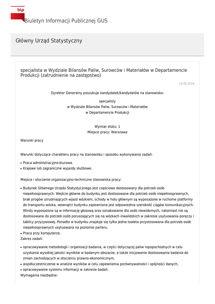 Biuletyn Informacji Publicznej GUS Główny Urząd Statystyczny specjalista w Wydziale Bilansów Paliw, Surowców i Materiałów w Departamencie Produkcji (zatrudnienie na zastępstwo) 16.06.2016 Dyrektor Generalny poszukuje kandydatek/kandydatów na stanowisko: specjalisty w Wydziale Bilansów Paliw, Surowców i Materiałów w Departamencie Produkcji Wymiar etatu: 1 Miejsce pracy: Warszawa Warunki pracy Warunki dotyczące charakteru pracy na stanowisku i sposobu wykonywania zadań: ● Praca administracyjno-biurowa. ● Krajowe lub zagraniczne wyjazdy służbowe. Miejsce i otoczenie organizacyjno-techniczne stanowiska pracy: ● Budynek Głównego Urzędu Statystycznego jest częściowo dostosowany dla potrzeb osób niepełnosprawnych. Wejście główne do budynku jest dostosowane dla potrzeb osób niepełnosprawnych, brak progów utrudniających wjazd wózkiem, schody w holu głównym są wyposażone w ruchome platformy do transportu wózka, wewnątrz budynku zapewniona jest odpowiednia szerokość ciągów komunikacyjnych. Windy wyposażone są w informację głosową oraz oznakowanie dla osób niewidomych, natomiast nie są dostosowane do potrzeb osób poruszających się na wózkach inwalidzkich w zakresie usytuowania poręczy i tablicy przyzywowej. Ponadto w budynku znajduje się tylko jedna toaleta przystosowana dla potrzeb osób niepełnosprawnych usytuowana na poziomie parteru. ● Praca przy komputerze. Zakres zadań: ● opracowywanie metodologii i organizacji badania, w części dotyczącej paliw ropopochodnych w celu uzyskania wysokiej jakości wyników w badanym obszarze, a także inicjowanie dostosowania badania do zmian zachodzących w otoczeniu prawno-ekonomicznym, ● współuczestniczenie w analizie wyników w celu zapewnienia porównywalności i spójności danych, ● opracowywanie systemu informacji w zakresie badań. Wymagania niezbędne: ● wykształcenie: wyższe, ● wiedza z obszaru rynku paliwowo- energetycznego, ● znajomość ustawy o statystyce publicznej, ● znajomość ustawy o służbie cywilnej, ● umiejętność obsługi komputera (MS Office), ● znajomość języka angielskiego na poziomie komunikatywnym, ● wykorzystywanie wiedzy i doskonalenie zawodowe, ● poszukiwanie informacji, ● rzetelność, ● organizacja pracy i orientacja na osiąganie celów, ● komunikacja interpersonalna, komunikacja pisemna, ● współpraca, kreatywność, ● myślenie analityczne, ● posiadanie obywatelstwa polskiego, ● korzystanie z pełni praw publicznych, ● nieskazanie prawomocnym wyrokiem za umyślne przestępstwo lub umyślne przestępstwo skarbowe. Wymagania dodatkowe: ● wykształcenie: wyższe ekonomiczne lub techniczne, ● znajomość narzędzi informatycznych do prowadzenia badań statystycznych. Dokumenty i oświadczenia niezbędne : ● życiorys/CV i list motywacyjny, ● kopie dokumentów potwierdzających spełnianie wymagania niezbędnego w zakresie wykształcenia, ● kopia dokumentu potwierdzającego posiadanie polskiego obywatelstwa lub oświadczenie o posiadaniu obywatelstwa polskiego, ● oświadczenie kandydata o korzystaniu z pełni praw publicznych, ● oświadczenie kandydata o nieskazaniu prawomocnym wyrokiem za umyślne przestępstwo lub umyślne przestępstwo skarbowe, ● oświadczenie kandydata o wyrażeniu zgody na przetwarzanie danych osobowych do celów naboru, ● kopia dokumentu potwierdzającego znajomość języka angielskiego na wymaganym poziomie lub oświadczenie o znajomości języka angielskiego na wymaganym poziomie. Dokumenty i oświadczenia dodatkowe: ● kopia dokumentu potwierdzającego niepełnosprawność - w przypadku kandydatek/kandydatów, zamierzających skorzystać z pierwszeństwa w zatrudnieniu w przypadku, gdy znajdą się w gronie najlepszych kandydatek/kandydatów, ● kopie dokumentów potwierdzających spełnienie wymagania dodatkowego w zakresie wykształcenia. TERMINY I MIEJSCE SKŁADANIA DOKUMENTÓW: Dokumenty należy złożyć do: 29-06-2016 r. Decyduje data: wpływu oferty do urzędu Miejsce składania dokumentów: Główny Urząd Statystyczny Biuro Organizacji i Kadr pok. 234 lub 251 al. Niepodległości 208 00-925 Warszawa (w godz. 815-1615) koniecznie z dopiskiem: oferta nr 58/DP/2016 Inne informacje: W miesiącu poprzedzającym datę upublicznienia ogłoszenia wskaźnik zatrudnienia osób niepełnosprawnych w urzędzie, w rozumieniu przepisów o rehabilitacji zawodowej i społecznej oraz zatrudnianiu osób niepełnosprawnych, nie wynosi co najmniej 6%. Zatrudnienie na zastępstwo. Proponowane wynagrodzenie brutto ok. 2 304 zł +dodatek stażowy. Po upływie terminu składania dokumentów w Biuletynie Informacji Publicznej GUS zostanie upowszechniona lista kandydatek/kandydatów, spełniających wymagania formalne określone w ogłoszeniu o naborze. Kandydatki/kandydaci spełniający wymagania formalne o kolejnych etapach naboru zostaną poinformowani telefonicznie lub e-mailem. Oferty złożone po terminie oraz oferty rozpatrzone negatywnie zostaną komisyjnie zniszczone po zakończeniu procedury naboru. Oświadczenia prosimy składać zgodnie ze wzorem zamieszczonym na stronie: http://bip.stat.gov.pl/ogloszenia/wolne-stanowiska-pracy/glowny-urzad-statystyczny/. Wymagane oświadczenia muszą być podpisane własnoręcznie. W przypadku przedstawienia dokumentów w języku obcym należy dołączyć również ich tłumaczenie na język polski dokonane przez tłumacza przysięgłego. Dodatkowe informacje można uzyskać pod nr tel. (22) 608 30 42, 608 30 95, 608 33 29. Nasz urząd jest pracodawcą równych szans i wszystkie aplikacje są rozważane z równą uwagą bez względu na płeć, wiek, niepełnosprawność, rasę, narodowość, przekonania polityczne, przynależność związkową, pochodzenie etniczne, wyznanie, orientacje seksualną czy też jakąkolwiek inną cechę prawnie chronioną. Pobierz darmowe oprogramowanie do przeglądania plików: Pliki do pobrania Oświadczenia d