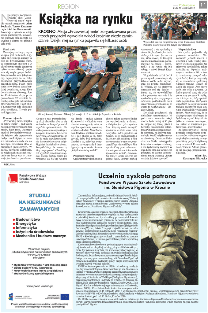 REGION a pomysł zorganizowania akcji „Przewertuj mnie” wpadło trzech przyjaciół: Alan Bochnak, Tomek Kaczmarczyk i Adrian Krzanowski. Promocja czytania w miejscach publicznych, ożywienie starówki oraz zachęta do wyjścia z domu, to główne cele akcji. N Flash mob Zacznijmy od tego, czym w ogóle jest flash mob. Z języka angielskiego znaczy to tyle co: błyskawiczny tłum. W określonym miejscu i w określonym czasie (znanym tylko uczestnikom) pojawia się nagle grupa ludzi. Przeprowadza ona jakąś akcję, najczęściej po to, żeby zaskoczyć przypadkowych przechodniów. Flash mob staje się w Polsce coraz bardziej popularny, a jego idea dotarła do nas z Nowego Jorku. Krośnieńska akcja, przeprowadzona 12 września br. trochę odbiegała od założeń amerykańskiego flash mob’a, ponieważ cała akcja nie była chwilowa. Trwała ponad 3 godziny. Przewertuj mnie „Przewertuj mnie. Książka to dobry wabik” – pod takim hasłem przeprowadzano ten mądry flash mob. Dlaczego mądry? Bo chodziło o czytanie książek. Ale czytanie nie będąc zamkniętym w swoich czterech ścianach, ale na świeżym powietrzu albo w miejscach publicznych. W parku, kawiarni, autobusie. W większych miastach czytanie na ławce czy w tramwaju jest bardzo popularne. Nowe Podkarpacie środa, 19 września 2012 11 Książka na rynku KROSNO. Akcja „Przewertuj mnie” zorganizowana przez trzech przyjaciół wywołała wśród krośnian niezłe zamieszanie. Dzięki niej na rynku pojawiło się kilkaset osób Michał, Konrad, Mateusz i Mikołaj (od lewej) z I LO im. Mikołaja Kopernika w Krośnie Ale nie u nas. Pomysłodawcy akcji chcieliby, aby to się zmieniło. – Pomysł powstał zupełnie spontanicznie. Na wakacjach często czytaliśmy z kolegami książki w kawiarni na rynku. Stwierdziliśmy, że jest to mało popularne zjawisko i że mało kto czyta książki gdzieś indziej niż w domu. Pomyśleliśmy, że warto tę ideę propagować. Chcieliśmy też wypełnić przestrzeń miejską. Mamy piękny rynek po remoncie, ale nic się na nim nie działo – mówi Adrian Krzanowski. – Chodziło nam również o integrację ludzi, o wspólne spotkania, wymianę wrażeń – dodaje Alan Bochnak. Czytanie jest teraz modne. I nie chodzi o to, żeby czytać, żeby być modnym. Chodzi o to, żeby być oczytanym, bo oczytanie i inteligencja są w cenie. Zatem „książka to dobry wabik”. Pospolite ruszenie Organizatorzy flash mob’a chcieli także zachęcić ludzi do wychodzenia z domu. – Książka jest tylko symbolem. Książkę może zastąpić spotkanie w kinie, albo tutaj na rynku - jutro, pojutrze, za tydzień. W tej akcji chodziło o to, że my nie mieliśmy z kim porozmawiać o tym co przeczytaliśmy, nie mieliśmy z kim wymienić się spostrzeżeniami. A może pozostanie taka mała społeczność wokół „Przewertuj mnie”. Może zbierze się grupa ludzi, którzy zechcą Wyprzedaż książek zorganizowany przez Krośnieńską Biblioteką Publiczną cieszył się bardzo dużym powodzeniem rozmawiać, a nie wychodzą z domu. Na facebooku jest dużo zielonych kropek (oznaczenie, które mówi, że ktoś jest on-line i można z nim porozmawiać na czacie – przyp. red.), a na rynku nie ma nikogo – mówi Tomek Kaczmarczyk. W godzinach od 16 do 19 przez rynek przewinęło się kilkaset osób. Jedni czytali, inni po prostu rozmawiali. Ważne, że na starówce wreszcie coś się działo. – Samo to, że wywołaliśmy takie pospolite ruszenie i że spotkaliśmy się z pozytywnym odzewem, podbudowało nas i utwierdziło w przekonaniu, że warto to kontynuować – dodaje Adrian. Do akcji przyłączyli się niektórzy restauratorzy. W godzinach trwania akcji można było taniej zjeść pizze, napić się taniej piwa i herbaty. Krośnieńska Biblioteka Publiczna zorganizowała kiermasz, na którym można było kupić książkę nawet za złotówkę. Centrum Dziedzictwa Szkła udostępniło książki o tematyce szklanej, a dla tych którzy zechcieli w jego holu albo na tarasie coś poczytać, za darmo udostępniono nową wystawę „Sport w szkle. Szkło w sporcie”. Wspaniała idea Na rynku pojawiła się głównie młodzież. Nie zabrakło jednak matek z dziećmi i tych trochę starszych wielbicieli książek. Na starówce spotkaliśmy także Arkadiusza Oponia, radnego z ramienia PO. – Jest to znakomity pomysł młodych ludzi, którzy angażują się w działalność społeczną naszego miasta. Widać, że akcja się udała. Jest sporo osób, nie tylko z Krosna. Ci ludzie przyszli tutaj nie tylko po to, aby poczytać książkę, ale także po to, żeby spędzić miło popołudnie. Zachęcam wszystkich do organizowania takich i podobnych akcji, aby nasz krośnieński rynek tętnił życiem. Mam nadzieję, że ta akcja przyczyni się do tego, że będziemy czytać książki nie tylko w zaciszu domowym, ale także w miejscach publicznych – mówił radny. Zainteresowanie akcją przeszło oczekiwania organizatorów. – Podczas organizacji akcji okazało się, że wypełniliśmy jakąś książkową niszę – mówił Krzanowski. Alan, Tomek i Adrian planują już kolejną, przyszłoroczną akcję. tekst i fot. Katarzyna Miarecka REKLAMA Uczelnia zyskała patrona Państwowa Wyższa Szkoła Zawodowa im. Stanisława Pigonia w Krośnie Z satysfakcją informujemy, że Pani Minister Nauki i Szkolnictwa przychyliła się do wniosku Senatu Państwowej Wyższej Szkoły Zawodowej w Krośnie o zmianę nazwy uczelni. Oficjalna aktualna nazwa uczelni brzmi: „Państwowa Wyższa Szkoła Zawodowa im. Stanisława Pigonia w Krośnie”. Krośnieńska uczelnia pragnęła mieć Prof. Stanisława Pigonia za patrona przede wszystkim ze względu na Jego pochodzenie z pobliskiej Komborni i podkreślany przezeń wielokrotnie żywy związek z rodzinnym gniazdem. Region krośnieński nie miał wybitniejszego człowieka nauki w swojej historii. Prof. Stanisław Pigoń przekazał rok przed śmiercią swój księgozbi
