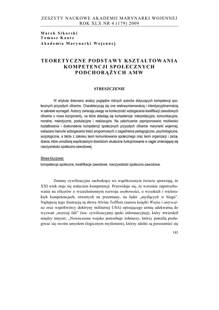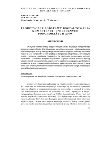 ZESZYTY NAUKOWE AKADEMII MARYNARKI WOJENNEJ ROK XLX NR 4 (179) 2009 Marek Sikorski Tomasz Kautz Akademia Marynarki Wojennej TEORETYCZNE PODSTAWY KSZTAŁTOWANIA KOMPETENCJI SPOŁECZNYCH PODCHORĄŻYCH AMW STRESZCZENIE W artykule dokonano analizy poglądów różnych autorów dotyczących kompetencji społecznych przyszłych oficerów. Charakteryzują się one wielowymiarowością i interdyscyplinarnością w zakresie wymagań. Autorzy zwracają uwagę na konieczność wzbogacania kwalifikacji zawodowych oficerów o nowe komponenty, na które składają się kompetencje: interpretacyjne, komunikacyjne, moralne, metodyczne, postulacyjne i realizacyjne. Na zakończenie zaproponowano możliwości kształtowania i doskonalenia kompetencji społecznych przyszłych oficerów marynarki wojennej, wskazano kierunki wzbogacania treści programowych o zagadnienia pedagogiczne, psychologiczne, socjologiczne, a także z zakresu teorii komunikowania społecznego oraz teorii organizacji i zarządzania, które umożliwią współczesnym dowódcom skuteczne funkcjonowanie w ciągle zmieniającej się rzeczywistości społeczno-zawodowej. Słowa kluczowe: kompetencje społeczne, kwalifikacje zawodowe, rzeczywistość społeczno-zawodowa. Zmiany cywilizacyjne zachodzące we współczesnym świecie sprawiają, że XXI wiek staje się stuleciem kompetencji. Przewiduje się, że wzrośnie zapotrzebowanie na oficerów o wszechstronnym rozwoju osobowości, o wysokich i wielorakich kompetencjach, otwartych na przemiany, na ludzi „myślących w biegu”. Najlepszą tego ilustracją są słowa Alvina Tofflera (autora książki Wojna i antywojna oraz współtwórcy doktryny militarnej USA) opisującego armię adekwatną do wyzwań „trzeciej fali” (tzn. cywilizacyjnej epoki informacyjnej), który stwierdził między innymi: „Nowoczesne wojsko potrzebuje żołnierzy, którzy potrafią posługiwać się swoim umysłem (logicznym myśleniem), którzy zdolni są porozumieć się 185 Marek Sikorski, Tomasz Kautz z przedstawicielami różnych narodów i kultur, którzy tolerują dwuznaczność, przejmują inicjatywę i zadają pytania, nawet wówczas, gdy prowadzą one do kwestionowania autorytetu. Zmieniona natura wojny oraz działania w czasie stanowienia pokoju przypisują coraz większą wartość wykształceniu i znajomości przedmiotu, a coraz mniejszą staromodnemu machismo i brutalnej sile”1. Społeczna istota armii i społeczny charakter jej funkcji stawiają przed przyszłymi oficerami wysokie wymagania w zakresie kompetencji społecznych. Każdy oficer pełni różne funkcje społeczne: dowódcy, wychowawcy, instruktora, musi zarządzać sprawami innych ludzi, przewodzić im, musi się z nimi komunikować i umieć kształtować właściwe z nimi relacje. Kompetencje społeczne stają się więc bardzo ważną częścią kwalifikacji zawodowych. W tym miejscu należy postawić następujące pytania: Jaka jest zależność między kwalifikacjami a kompetencjami? Co będziemy rozumieć pod pojęciem kompetencje społeczne? Jakie elementy tworzą strukturę kompetencji społecznych oficera? Jakimi kluczowymi kompetencjami społecznymi powinien charakteryzować się współczesny oficer marynarki wojennej? Zdaniem E. Perzyckiej kwalifikacje i kompetencje występują w zależności dwojakiego rodzaju. Bez kwalifikacji nie można być kompetentnym, tzn. lider może mieć kwalifikacje równe kompetencjom lub też wyższe kwalifikacje niż kompetencje. W takim ujęciu pojęcie kwalifikacji jest pojęciem szerszym od pojęcia kompetencje, gdyż lider może posiadać więcej wiedzy i umiejętności niż wykorzystuje w swojej pracy. Zatem w tym przypadku kwalifikacje mogą być synonimem kompetencji. Jeżeli jednak przyjmiemy, że osoba kompetentna jest uprawniona do działania i decydowania, ma podstawy i kwalifikacje do wydawania opinii i sądów, wówczas lider bez kompetencji nie może wykorzystywać swoich kwalifikacji. Zatem w odniesieniu do osoby kwalifikacje są pojęciem szerszym niż kompetencje, natomiast z punktu widzenia konkretnego działania są one pojęciem węższym2. Syntetyzując dotychczasowe rozważania, należy przytoczyć definicję J. Sztumskiego, który uważa, że kwalifikacje zawodowe to udokumentowane prawnie kompetencje do wykonywania określonego zawodu ze względu na posiadaną wiedzę i osiągnięte umiejętności praktyczne3. Z kolei według M. Dudzikowej kompetencje to zdolności do czegoś, zależące zarówno od znajomości stosowania umiejętności czy sprawności, jak i od przekonania do posługiwania się tą zdolnością. Chodzi tu o wykorzystanie 1 A. i H. Toffler, Wojna i antywojna, Warszawa 1997, s. 108. E. Perzycka, Kompetencje moralne lidera wojskowego, [w:] Lider wojskowy u progu XXI wieku, red. M. Kaliński, Warszawa 2003, s. 153. 3 J. Sztumski, Opiniowanie pracowników, Radom 1997, s. 30. 2 186 Zeszyty Naukowe AMW Teoretyczne podstawy kształtowania kompetencji społecznych podchorążych AMW zdolności do posługiwania się wyuczonymi umiejętnościami dla efektywnego radzenia sobie w otaczającym świecie4. Kompetencje społeczne nie są jednoznacznie ujmowane ani w języku naukowym, ani potocznym. M. Agryle rozumie je jako opanowanie niezbędnych umiejętności pozwalających uzyskać u innych ludzi pożądane efekty w sytuacjach społecznych5. W związku z tym przez kompetencje społeczne oficera będziemy rozumieć te jego sprawności, które umożliwiają wywieranie skutecznego wpływu na podwładnych i obejmują ich poznawanie, motywowanie, komunikowanie się, udzielanie pomocy, rozwiązywanie konfliktów, kreowanie właściwej atmosfery współdziałania. Struktura kompetencji rozpatrywanych w niniejszym opracowaniu opiera się na wiedzy, umiejętnościach, doświadczeniu i postawach6. Wiedzę stanowią treści utrwalone w umyśle ludzkim w rezultacie uczenia się i gromadzenia doświadczeń. Szczególne znaczenie w życiu człowieka mają dwie kategorie wied
