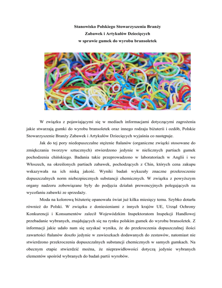 Stanowisko Polskiego Stowarzyszenia Branży Zabawek i Artykułów Dziecięcych w sprawie gumek do wyrobu bransoletek W związku z pojawiającymi się w mediach informacjami dotyczącymi zagrożenia jakie stwarzają gumki do wyrobu bransoletek oraz innego rodzaju biżuterii i ozdób, Polskie Stowarzyszenie Branży Zabawek i Artykułów Dziecięcych wyjaśnia co następuje. Jak do tej pory niedopuszczalne stężenie ftalanów (organiczne związki stosowane do zmiękczania tworzyw sztucznych) stwierdzono jedynie w nielicznych partiach gumek pochodzenia chińskiego. Badania takie przeprowadzono w laboratoriach w Anglii i we Włoszech, na określonych partiach zabawek, pochodzących z Chin, których cena zakupu wskazywała na ich niską jakość. Wyniki badań wykazały znaczne przekroczenie dopuszczalnych norm niebezpiecznych substancji chemicznych. W związku z powyższym organy nadzoru zobowiązane były do podjęcia działań prewencyjnych polegających na wycofaniu zabawki ze sprzedaży. Moda na kolorową biżuterię opanowała świat już kilka miesięcy temu. Szybko dotarła również do Polski. W związku z doniesieniami z innych krajów UE, Urząd Ochrony Konkurencji i Konsumentów zalecił Wojewódzkim Inspektoratom Inspekcji Handlowej przebadanie wybranych, znajdujących się na rynku polskim gumek do wyrobu bransoletek. Z informacji jakie udało nam się uzyskać wynika, że do przekroczenia dopuszczalnej ilości zawartości ftalanów doszło jedynie w zawieszkach dodawanych do zestawów, natomiast nie stwierdzono przekroczenia dopuszczalnych substancji chemicznych w samych gumkach. Na obecnym etapie stwierdzić można, że nieprawidłowości dotyczą jedynie wybranych elementów spośród wybranych do badań partii wyrobów. Polskie Stowarzyszenie Branży Zabawek i Artykułów Dziecięcych przypomina, że przed zakupem zabawki należy upewnić się, że znajdują się na niej niezbędne informacje i ostrzeżenia. Pierwszą rzeczą na jaką należy zwrócić uwagę to znak CE. Jedynie zabawki które zostały poddane odpowiednim badaniom (w tym również na zawartość substancji chemicznych), dla których przeprowadzona została procedura oceny zgodności z zasadniczymi wymaganiami dotyczącymi bezpieczeństwa (wspólnymi dla całej Unii Europejskiej) mogą zostać wprowadzone do obrotu po uprzednim oznakowaniu ich symbolem CE. Znak ten, zastosowany zgodnie z jego przeznaczeniem, stanowi gwarancję bezpieczeństwa danej zabawki. Należy w tym miejscu zauważyć, że co do zasady producenci oraz importerzy gumek (w tym także z Chin) posiadają odpowiednie certyfikaty oraz deklaracje zgodności wystawione przez producenta, stanowiące materialne potwierdzenie właściwej jakości wprowadzanych przez nich do obrotu zabawek. Wzór znaku CE został ściśle określony i nie może być mylony z żadnym innym symbolem. Na opakowaniu zabawki powinny znajdować się dane producenta oraz importera. Producent ma obowiązek umieścić swoje nazwisko, zarejestrowaną nazwę towarową lub zarejestrowany znak towarowy oraz adres kontaktowy na zabawce, a jeżeli nie jest to możliwe – na opakowaniu lub w dokumencie dołączonym do zabawki. Podobnie sytuacja przedstawia się w odniesieniu do importera wprowadzającego produkt na obszar Unii Europejskiej. Brak informacji o których mowa powyżej, może świadczyć o tym, że żaden z podmiotów wprowadzających zabawkę do sprzedaży nie jest gotowy wziąć na siebie odpowiedzialności za jej jakość. Unikać należy, w każdym przypadku, zakupu zabawek których cena wskazuje jednoznacznie na ich niską jakość. Koszty związane z produkcją zabawek oraz przeprowadzeniem rzetelnych badań potwierdzających ich bezpieczeństwo dla dzieci muszą mieć wpływ na ich cenę. Zarówno w przypadku gumek jak i innych zabawek, rynki europejskie zalewane są tanimi podróbkami firmowych, markowych zabawek, których jakość i bezpieczeństwo nierzadko pozostawiają wiele do życzenia. W celu szybkiego informowania konsumentów o potencjalnym ryzyku związanym między innymi z niebezpiecznymi zabawkami, utworzony został ogólnoeuropejski system Rapex. Zauważyć należy, że jak do tej pory nie umieszczono w nim żadnej notyfikacji dotyczącej przedmiotowych gumek.