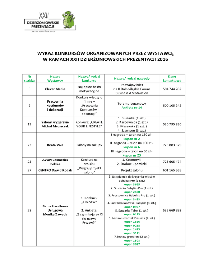 WYKAZ KONKURSÓW ORGANIZOWANYCH PRZEZ WYSTAWCĘ W RAMACH XXII DZIERŻONIOWSKICH PREZENTACJI 2016 Nr stoiska Nazwa Wystawcy Nazwa/ rodzaj konkursu Nazwa/ rodzaj nagrody Dane kontaktowe 5 Clever Media Najlepsze hasło motywacyjne Podwójny bilet na II Dolnośląskie Forum Business &Motivation 504 744 282 9 Pracownia Kostiumów i dekoracji Konkurs wiedzy o firmie – „Pracownia Kostiumów i dekoracji” Tort marcepanowy Ankieta nr 14 500 105 242 19 Salony Fryzjerskie Michał Mroszczak Konkurs: „CREATE YOUR LIFESTYLE” 23 Beata Viva Talony na zakupy 25 AVON Cosmetics Polska 27 CENTRO Dawid Rodak Konkurs na stoisku „Wygraj projekt salonu” 1. Suszarka (1 szt.) 2. Karbownica (1 szt.) 3. Maszynka (1 szt. ) 4. Szampon (3 szt.) I nagroda – talon na 150 zł kupon nr 2 II nagroda – talon na 100 zł kupon nr 6 III nagroda – talon na 50 zł kupon nr 23 1. Kosmetyki 2. Drobne upominki Projekt salonu 530 795 930 725 883 379 723 605 474 601 165 665 1. Urządzenie do kręcenia włosów 1. Konkurs: „FRYZAW” 28 Firma Handlowo Usługowa Monika Zawada 2. Ankieta: „Z czym kojarzy Ci się nazwa Fryzaw?” Babyliss Pro (1 szt.) kupon 3665 2. Suszarka Babyliss Pro (1 szt.) kupon 2420 3. Prostownica Babyliss Pro (1 szt.) kupon 3483 4. Suszarko lokówka Babyliss (1 szt.) kupon 0937 5. Suszarka Tahe (1 szt.) kupon 0193 6. Zestaw szczotek Dessata (4 szt.) kupon 1666 kupon 0218 kupon 1413 kupon 3111 7.Zestaw grzebieni (2 szt.) kupon 1508 kupon 3027 535 669 993 29 31 LOVE FASHION Optyk na Świdnickiej 37 Rainbow Tours Świdnica 38 Agroturystyka „Stajnia Czerkies” 39 Esencja Natury Salon Kosmetyczny Która znana piosenkarka zaprojektowała ubrania, które są dostępne w butiku LOVE FASHION? Bon upominkowy o wartości: 50 zł , 100 zł , 150 zł do wykorzystania w butiku LOVE FASHION 781 840 525 Konkurs na najciekawsze hasło reklamo-we Karta podarunkowa o wartości 500 zł - kupon nr 5 2 karty prezentowe z rabatem 30% do wykorzystania w Optyku na Świdnickiej+ koszulki z logo Ray- Ban – kupony nr 38 i 52 609 525 058 Wycieczka dla 2 osób w hotelu 4gwiazdkowym Maj/Czerwiec 2017 696 059 620 Karnet na 3 jazdy konne w Stajni Czerkies w Owieśnie 665 819 865 Loteria: „Jakie jest najlepsze hasło dla biura Rainbow Tours Świdnica?” Quiz wiedzy o koniach Pytania konkursowe: „Jak wyobrażasz sobie wystrój naturalnego salonu kosmetycznego i czym powinien się wyróżniać”? Konkurs układania koparki LEGO na czas 40 GRYF Prace Ziemne 48 Myjniadzierzoniow.pl Losowanie 50 Centrum TMT „Auto na weekend” 53 58 Komitet Społeczny „KOD” Koraliki Sanji 1. Co Pan/i rozumie pod słowem „Demokracja” 2. W którym roku powstał KOD? 3. Kto założył Ruch KOD? Wymyśl hasło reklamowe dla naszej firmy 1.Mikrodermabrazja diamentowa (1 miejsce) 2. Pedicure SPA (2 miejsce) 661 237 671 Manicure 3. hybrydowy (3 miejsce) Koparko-ładowarka Zestaw kosmetyków samochodowych o wartości 100 zł 1. Jedna sztuka Opel Astra Sedan 2. Jedna sztuka Skoda Fabia 3 hatchback 1. Wianek – stroik z logo KOD + książka „Siwy dym” (nr 15) 2. Książka Siwy dym” + gadżety KOD (nr 6) Kolejowa 5/2 58-200 Dzierżoniów 504 504 184 748 323 916 667 67 45 25 3. Książka „Siwy dym” + gadżety KOD (nr 16) Bon o wartości 30 zł na zakupy w moim sklepie (3) 880 828 040