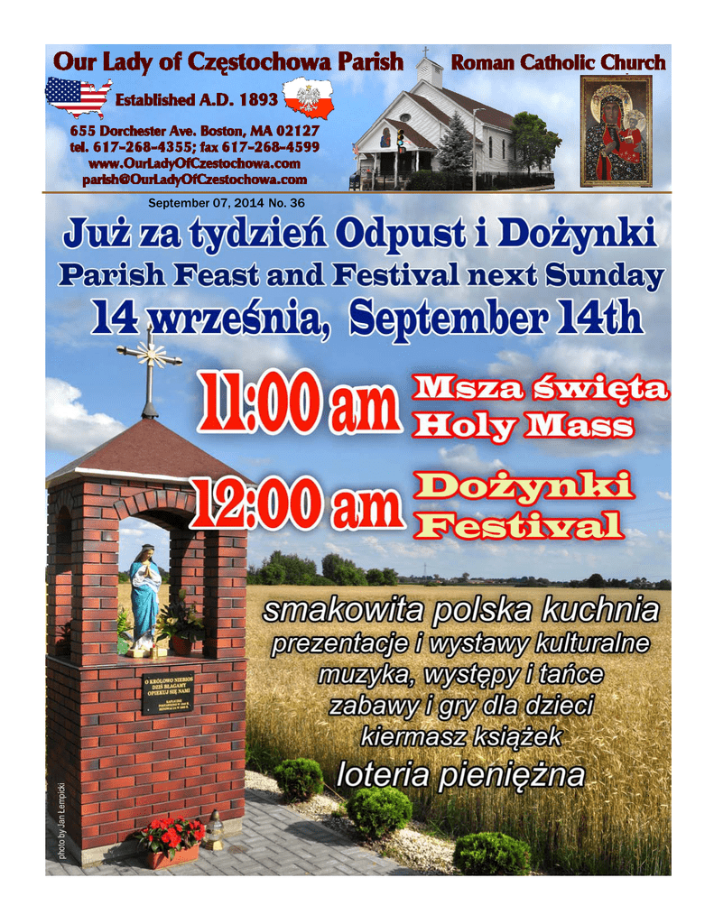 August 24, 2014 No. 34 Parish Choir & Children Choir - Mrs. Marta Saletnik, tel. 617-265-8132 ♦ Stowarzyszenie Weteranów Armii Polskiej - SWAP #37 Mr. Wincenty Wiktorowski - tel. 617-288-1649 ♦ Grupa AA - Sala pod kościo...