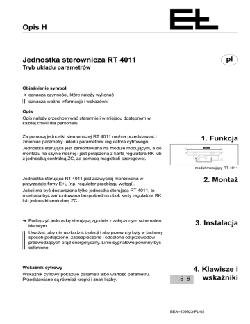 Opis H pl Jednostka sterownicza RT 4011 Tryb uk³adu parametrów Objanienie symboli ➜ oznacza czynnoci, które nale¿y wykonaæ oznacza wa¿ne informacje i wskazówki Opis Opis nale¿y przechowywaæ starannie i w miejscu dostêpnym w ka¿dej chwili dla personelu. Za pomoc¹ jednostki sterowniczej RT 4011 mo¿na przedstawiaæ i zmieniaæ parametry uk³adu parametrów regulatora cyfrowego. 1. Funkcja Jednostka steruj¹ca jest zamontowana na module mocuj¹cym, a do monta¿u na szynie nonej i jest po³¹czona z kart¹ regulatora RK lub z jednostk¹ centraln¹ ZC, za pomoc¹ magistrali szeregowej. modu³ mocuj¹cy RT 4011 Jednostka steruj¹ca RT 4011 jest zazwyczaj montowana w przyrz¹dzie firmy E+L (np. regulator przebiegu wstêgi). 2. Monta¿ Je¿eli ma byæ dostarczona tylko jednostka steruj¹ca RT 4011, to musi ona byæ zamontowana bezporednio obok karty regulatora RK lub jednostki centralnej ZC. ➜ Pod³¹czyæ jednostkê steruj¹c¹ zgodnie z za³¹czonym schematem ideowym. 3. Instalacja Uwa¿aæ, aby nie uszkodziæ izolacji i aby przewody by³y w fachowy sposób pod³¹czone, zabezpieczone i oddalone od przewodów przewodz¹cych pr¹d energetyczny. Linie sygna³owe powinny byæ os³onione. Wskanik cyfrowy Wskanik cyfrowy pokazuje parametr albo wartoæ parametru. Przedstawiane s¹ równie¿ kropki i znak liczby. 4. Klawisze i wskaniki 1.8.8. BEA--209923-PL-02 Jednostka sterownicza RT 4011 wskanik cyfrowy x 1 magistrala szeregowa In klawisz Zmniejszyæ wartoæ X 2 magistrala szeregowa Out klawisz Zwiêkszyæ watroæ dioda wiec¹ca H 60 uk³adu parametrów klawisz Uk³ad parametrów Klawisz Zmniejszyæ wartoæ Za pomoc¹ tego klawisza s¹ zmniejszane parametry trybu systemu parametrów lub wartoci parametrów. Klawisz Zwiêkszyæ watroæ Za pomoc¹ tego klawisza s¹ zwiêkszane parametry trybu systemu parametrów lub wartoci parametrów. Klawisz Uk³ad parametrów Za pomoc¹ klawisza Uk³ad parametrów mog¹ byæ wybrane dwa tryby uk³adu parametrów: - Tryb uk³adu parametrów (uk³ad parametrów DEL miga) W trybie uk³adu parametrów mog¹ byæ pokazane wszystkie wartoci parametrów, a czêæ wartoci parametrów mo¿e zostaæ zmieniona. - Rozszerzony tryb uk³adu parametrów (uk³ad parametrów DEL wieci siê) Sposób postêpowania przy zmianie parametrów jest podany w opisie Szyna CAN, szyna szeregowa i edytor uk³adu parametrów oraz na rysunku na stronie 3. 5. Dane techniczne H strona 2 Po³¹czenie szeregowe interfejsy Rodzaj zabezpieczenia IP 00 Temperatura otoczenia 0 °C do 40 °C Zastrzega siê prawo do zmian technicznych Jednostka sterownicza RT 4011 Zasadnicza obs³uga w trybie uk³adu parametrów: Uruchomienie trybu uk³adu parametrów: Nacisn¹æ klawisz Uk³ad parametrów i dodatkowo nacisn¹æ klawisz Podwy¿szyæ wartoæ (najpierw przycisn¹æ klawisz Uk³ad parametrów). Zielona dioda wiec¹ca przy klawiszu Uk³ad parametrów migocze. Podanie numeru przyrz¹du: Nacisn¹æ klawisz Uk³ad parametrów, wciniêty trzymaæ, a za pomoc¹ klawisza Podwy¿szyæ wartoæ wybraæ parametr 0. Puciæ klawisz Uk³ad parametrów, a za pomoc¹ klawiszy Podwy¿szyæ wartoæ lub Zmniejszyæ wartoæ podaæ numer przyrz¹du (numer przyrz¹du podany jest w schemacie blokowym). Podanie numeru grupy: Nacisn¹æ klawisz Uk³ad parametrów, wciniêty trzymaæ a za pomoc¹ klawisza Podwy¿szyæ wartoæ wybraæ parametr 1. Ponownie puciæ klawisz Uk³ad parametrów, a za pomos¹ klawiszy Podwy¿szyæ wartoæ lub Zmniejszyæ wartoæ podaæ numer grupy (numer grupy podany jest w schemacie blokowym). Wybranie i zmiana parametru: Nacisn¹æ klawisz Uk³ad parametrów, wciniêty trzymaæ, a za pomoc¹ klawisza Podwy¿szyæ wartoæ wybraæ dowolny parametr . Puciæ klawisz Uk³ad parametrów i za pomoc¹ klawisza Podwy¿szyæ wartoæ lub Zmniejszyæ wartoæ podaæ ¿yczony parametr. Nieodpowiednie zmiany parametrów mog¹ wp³yn¹æ negatywnie na w³aciwe funkcjonowanie ca³ego urz¹dzenia! Wybranie rozszerzonego trybu uk³adu parametrów: Wybraæ numer urz¹dzenia X.5, nastêpnie przycisn¹æ klawisz Uk³ad parametrów, wciniêty trzymaæ, a za pomoc¹ klawisza Podwy¿szyæ wartoæ wybraæ parametr 3. Puciæ klawisz Uk³ad parametrów, a za pomoc¹ klawiszy Podwy¿szyæ wartoæ lub Zmniejszyæ wartoæ podaæ wartoæ parametru 42. Uruchomienie trybu uk³adu parametrów + Podanie numeru urz¹dzenia + Wartoæ parametru Lub + Podanie numeru grupy Lub + Wybranie parametru Zmiana wartoci parametru Daj¹ca siê zmieniæ wartoæ parametru Lub Tak Nie + Rozbudowany tryb uk³adu parametrów Lub Wybraæ dalsze parametry Opuciæ tryb uk³adu parametrów: Wybraæ numer urz¹dzenia X.5, nastêpnie nacisn¹æ klawisz Uk³ad parametrów, wciniêty trzymaæ, a za pomoc¹ klawisza Podwy¿szyæ wartoæ wybraæ parametr 3. Ponownie puciæ klawisz Uk³ad parametrów i za pomoc¹ klawiszy Podwy¿szyæ wartoæ lub Zmniejszyæ wartoæ podaæ wartoæ parametru 1. Nacisn¹æ klawisz Uk³ad parametrów, przyciniêty trzymaæ i jednokrotnie nacisn¹æ klawisz Podwy¿szyæ wartoæ. Ponownie puciæ klawisz Uk³ad parametrów. Parametr Tak Nie + Opuciæ tryb uk³adu parametrów Lub + X jest u¿ywany jako miejsce rezerwowe H strona 3 Erhardt + Leimer GmbH Postfach 10 15 40 D-86136 Augsburg Telefon (0821) 24 35-0 Telefax (0821) 24 35-666