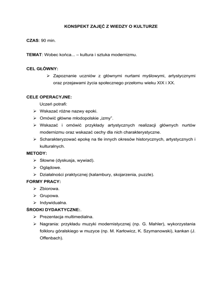 KONSPEKT ZAJĘĆ Z WIEDZY O KULTURZE CZAS: 90 min. TEMAT: Wobec końca... – kultura i sztuka modernizmu. CEL GŁÓWNY: Zapoznanie uczniów z głównymi nurtami myślowymi, artystycznymi oraz przejawami życia społecznego przełomu wieku XIX i XX. CELE OPERACYJNE: Uczeń potrafi: Wskazać różne nazwy epoki. Omówić główne młodopolskie „izmy”. Wskazać i omówić przykłady artystycznych realizacji głównych nurtów modernizmu oraz wskazać cechy dla nich charakterystyczne. Scharakteryzować epokę na tle innych okresów historycznych, artystycznych i kulturalnych. METODY: Słowne (dyskusja, wywiad). Oglądowe. Działalności praktycznej (kalambury, skojarzenia, puzzle). FORMY PRACY: Zbiorowa. Grupowa. Indywidualna. ŚRODKI DYDAKTYCZNE:. Prezentacja multimedialna. Nagrania: przykładu muzyki modernistycznej (np. G. Mahler), wykorzystania folkloru góralskiego w muzyce (np. M. Karłowicz, K. Szymanowski), kankan (J. Offenbach). PRZEBIEG ZAJĘĆ: Przywitanie się z uczniami i sprawdzenie obecności. Na przygotowanych kartkach uczniowie wypisują znane pojęcia związane z epoką, tzw. młodopolskie „izmy”. Prowadzący grupuje wskazania uczniów, krótko je omawia i zaznacza, które z nich funkcjonowały jako nazwy epoki. Uczniowie otrzymują puzzle. Po ułożeni grupy (2-4 osobowe) omawiają obraz, który ułożyły. Reprodukcje przedstawiają różne realizację tematu wsi w sztuce. Dyskusja kierowana: O czym świadczy zainteresowanie artystów wsią? Czy w kulturze takie orientacje są nowością? Podczas wykonania zadania można zaprezentować uczniom przykład wykorzystania motywów folklorystycznych w muzyce klasycznej (np. utwory Karłowicza lub Szymanowskiego). Miniwykład. Prezentacja kolejnych tematów. Uczniowie biorą czynny udział w dyskusji. Prowadzący zadaje pytania, np. Jak wg was wyglądało życie młodopolskiego artysty? Z czego to wynikało i czy takie życie służyło sztuce? Czy obecnie mit famme fatale jest żywy w kulturze? Ewentualnie prowadzący może wybrać jeden temat i przeprowadzić debatę, w której strony będą musiały obronić jakąś tezę. Uczniowie w grupach przygotowują argumenty, a następnie na forum prezentują swoje zdanie. Grupa przeciwna przedstawia kontrargumenty. Nad całością czuwa trzyosobowe kolegium dobrej dyskusji oraz strażnik czasu (aby nie przekraczać ustalonego czasu na wypowiedź). Po kolejnych tematach można przeplatać tok lekcji nagraniami: np. Kankan Offenbacha lub symfonie Mahlera, obrazki impresjonistyczne Griega. Po prezentacji uczniowie losują jeden przedmiot (związany z jakimś nurtem, np. kawa, zielony balonik, parzenicę itp.) Zadaniem uczniów jest napisani humorystycznej notatki encyklopedycznej, w której uzasadnią, że wylosowany przedmiot był niezwykle ważny dla kultury, sztuki lub światopoglądu ludzi epoki. Uczniowie odczytują notatki. Na zakończenie (ew. na początek drugiej jednostki lekcyjnej) można przeprowadzić grę w kalambury. Uczniowie losują hasła (kołtun, famme fatale, chłopomania, Jama Michalika, Padlina etc.). Ich zadaniem jest przedstawienie hasła gestem lub rysunkiem reszcie klasy. Pożegnanie z uczniami. Załącznik: Nazwy epoki: Epoka dostała tyle imion, co żadna wcześniejsza. Każda jednak eksponuje inną wartość znaczeniową. I tak: Fin de siècle – akcentuje pesymistyczną wizję końca wieku; Modernizm – zaznacza „nowoczesną” sztukę artystów końca wieku, odrzucenie tradycji, wartości poprzedników; Dekadentyzm – oznacza schyłkowość, poczucie bierności i niemocy wobec nadchodzącego końca wieku; Neoromantyzm – podkreśla duchowe i ideowe pokrewieństwo epoki z romantyzmem; Symbolizm – eksponuje nurt w sztuce, literaturze, który posługuje się symbolem; Impresjonizm – dotyczy estetyki i metody twórczej, jaką stosowali młodopolscy artyści. Dążyli do uchwycenia wrażenia, momentu subiektywnego postrzegania świata. Młoda Polska – na wzór innych krajów; taka bowiem zapanowała moda, by ideologię młodego pokolenia nazywać – Młodą Europą. Ludomania: Moda na fascynację folklorem, wsią jest charakterystyczna dla modernizmu. Wieś w literaturze, na płótnach malarzy, małżeństwa inteligencji z chłopami. Tradycje te wywodzą się z romantycznej fascynacji ludem, jego wierzeniami, obyczajami i specyficzna moralnością. W wydani młodopolskim fascynacje te owocowały przekonaniem o wyjątkowej randze chłopstwa, wartości ludowej kultury, która przechowywała najcenniejsze cechy narodowe; zachwytem nad tężyzną biologiczną ludu i jego prawością moralną, nieskażoną zepsuciem wielkich miast. Artyści widzieli w chłopach duchowych spadkobierców legendarnego króla Piasta, przypisywali im wielkie znaczenie w przyszłym, wolnym narodzie. W praktyce ludomania przybierała formy „bratania się z ludem”, np.: demonstracyjnych ożenków z chłopkami (Włodzimierz Tetmajer, Lucjan Rydel, Stanisław Wyspiański), przenoszeniem się na wieś z wielkich miast (Jan Kasprowicz). W sztuce ludomania przybiera różną postać. „Wesele” Stanisława Wyspiańskiego poddaje pod dyskusję zagadnienie ludomanii. Choć zachwyt strojem, obyczajem, „potęgą chłopa” jest w tym utworze wyeksponowany, to przecież poza poety zafascynowanego wsią , jego szczerość stają pod znakiem zapytania. „Wiejska chata rozśpiewana” i pobratanie wsi z miastem jest zresztą wielką metaforą, pretekstem do poruszenia innych tematów. Inny przykład to nagrodzona Noblem Reymontowska epopeja – „Chłopi”. Reymont prezentuje zarówno związek natury z trybem życia, obyczajem, ale sięga także w głąb psychiki chłopskiej. Poetycki cykl „Z chałupy”” Kasprowicza rejestruje szereg przykładów chłopskiej nędzy. Młoda Polska tatrzańska: W okresie Młodej Polski głównymi ośrodkami kultury był Kraków i Lwów (dzięki autonomii galicyjskiej) oraz Zakopane. Podhale, Tatry i leżące u ich stóp Zakopane stał