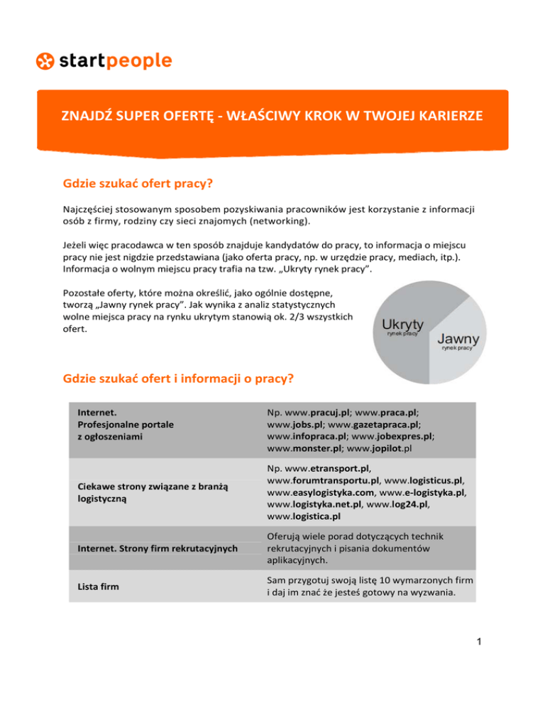 ZNAJDŹ SUPER OFERTĘ - WŁAŚCIWY KROK W TWOJEJ KARIERZE Gdzie szukać ofert pracy? Najczęściej stosowanym sposobem pozyskiwania pracowników jest korzystanie z informacji osób z firmy, rodziny czy sieci znajomych (networking). Jeżeli więc pracodawca w ten sposób znajduje kandydatów do pracy, to informacja o miejscu pracy nie jest nigdzie przedstawiana (jako oferta pracy, np. w urzędzie pracy, mediach, itp.). Informacja o wolnym miejscu pracy trafia na tzw. „Ukryty rynek pracy”. Pozostałe oferty, które można określić, jako ogólnie dostępne, tworzą „Jawny rynek pracy”. Jak wynika z analiz statystycznych wolne miejsca pracy na rynku ukrytym stanowią ok. 2/3 wszystkich ofert. Gdzie szukać ofert i informacji o pracy? Internet. Profesjonalne portale z ogłoszeniami Np. www.pracuj.pl; www.praca.pl; www.jobs.pl; www.gazetapraca.pl; www.infopraca.pl; www.jobexpres.pl; www.monster.pl; www.jopilot.pl Ciekawe strony związane z branżą logistyczną Np. www.etransport.pl, www.forumtransportu.pl, www.logisticus.pl, www.easylogistyka.com, www.e-logistyka.pl, www.logistyka.net.pl, www.log24.pl, www.logistica.pl Internet. Strony firm rekrutacyjnych Oferują wiele porad dotyczących technik rekrutacyjnych i pisania dokumentów aplikacyjnych. Lista firm Sam przygotuj swoją listę 10 wymarzonych firm i daj im znać że jesteś gotowy na wyzwania. 1 Prasa Dodatki o pracy w gazetach krajowych i lokalnych. Prasa związana z branżą logistyczną Np. Eurologistics, Nowoczesny Magazyn, Logistyka a Jakość, Spedycja Transport Logistyka, Gospodarka Materiałowa i Logistyka, Polska Gazeta Transportowa Urzędy Pracy Czasem Urzędy Pracy współpracują z APT i zamieszczają nasze ogłoszenia. Biura Karier Dają szanse odbycia praktyk i staży w firmach logistycznych Targi, giełdy pracy Organizowane przez APT, Biura Karier, PUP Jak czytać ogłoszenie rekrutacyjne? Treść i sposób redagowania ofert pracy bardzo często daje dużo informacji co do stanowiska i firmy, w której chcemy pracować i co do typu rekrutacji z jakim mamy do czynienia. Dobre czytanie ofert pracy „między słowami” może ułatwiać wybór kandydata jak i pomóc unikać przykrych niespodzianek, czy nieporozumień. Nazwa firmy Czasem brakuje w ofercie. Nie oznacza to, że mamy podejrzewać, że firma nie istnieje, ale raczej że preferuje ona rekrutację przez Agencję by się nie ujawniać na początkowym etapie rekrutacji Stanowisko Nazwa stanowiska często nic nam nie mówi. Przeczytaj dokładnie wymagania pracodawcy oraz zakres obowiązków. To jest klucz! Numer referencyjny Pomaga osobie prowadzącej rekrutację przyporządkować CV do określonego stanowiska. Podawaj go zawsze w swojej aplikacji Zakres obowiązków Ważne jest jeśli masz doświadczenie chociaż w większej części wymienionych zadań, ale jeśli nie wszystko potrafisz, nie rezygnuj pochopnie, nowe umiejętności możesz zdobyć 2 w praktyce Wymagania Pracodawcy często wypisują wymagania „na zapas”, których tak naprawdę, bezwzględnie nie oczekują od pracowników. Zwróć uwagę na to, co najistotniejsze: wiedza i doświadczenie. Jeżeli nie spełniasz tych podstawowych oczekiwań, nie trać czasu i szukaj dalej Oferujemy Zapamiętaj dobrze co pracodawca pisze w tej rubryce. Jeśli rzeczywistość okazuje się inna, szukaj szybko innego pracodawcy Terminy Przestrzegaj podanych terminów! Zadzwoń i zapytaj, czy Twoje podanie dotarło do osoby prowadzącej rekrutację Dane osobowe Są niezbędne w dokumentach aplikacyjnych. Bez tego najlepsza oferta może nie zostać rozpatrzona Jak odpowiadać na ofertę pracy? 3 złote zasady w komunikacji e-mailowej: jednego maila nie należy wysyłać na więcej niż jeden adres. Nie wysyłamy hurtowo tego samego CV w temacie maila podajemy nr referencyjny lub nazwę stanowiska oprócz załączników, w e-mailu powinien być również krótki wstęp w samym tekście wiadomości. Wszak, nie chcemy, żeby nasz załącznik wyglądał jak wirus i trafiał do kategorii SPAM. 3 Przykładowy zakres obowiązków i wymagania na stanowiskach w branży logistycznej: Asystent w dziale logistyki Zakres obowiązków: - planowanie i obsługa międzynarodowych wysyłek - współpraca z firmami spedycyjnymi w kraju i zagranicą - obsługa niemieckojęzycznego programu produkcyjnego - grupowanie zleceń na wysyłki - kontakt telefoniczny i mailowy z firmami niemieckojęzycznymi Wymagania: - wykształcenie wyższe (logistyka, handel międzynarodowy, ekonomia itp.) - język niemiecki na poziomie bardzo dobrym - doświadczenie na podobnym stanowisku mile widziane - dobra znajomość obsługi programu Excel - umiejętność ustalania priorytetów - odpowiedzialność i uczciwość Spedytor międzynarodowy Zakres obowiązków: - ofertowanie i kwotowanie przewozów - fakturowanie zleconych usług spedycyjnych - kontrola dokumentów i faktur przewoźników na zgodność ze zleceniem - współpraca z przewoźnikami - pozyskiwanie Klientów - realizacja zleceń spedycyjnych Wymagania: - doświadczenie na podobnym stanowisku minimum 2 lata - wykształcenie wyższe (logistyka, handel międzynarodowy, ekonomia itp.) - umiejętność organizacji przewozu ładunków w kraju i za granicą - znajomość kwestii prawnych związanych z przewozem ładunków (prawo przewozowe, konwencja CMR, kodeks cywilny) - znajomość języka angielskiego lub niemieckiego umożliwiająca swobodna komunikację - umiejętność organizacji pracy własnej - zaangażowane - umiejętność pracy pod wywyłem stresu 4