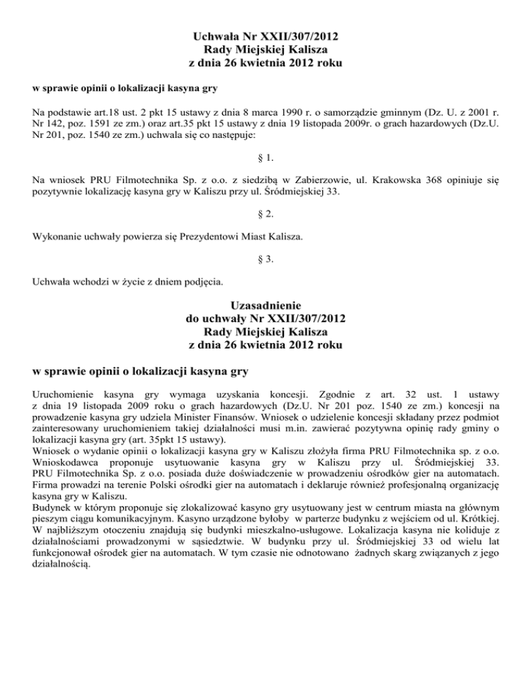 Uchwała Nr XXII/307/2012 Rady Miejskiej Kalisza z dnia 26 kwietnia 2012 roku w sprawie opinii o lokalizacji kasyna gry Na podstawie art.18 ust. 2 pkt 15 ustawy z dnia 8 marca 1990 r. o samorządzie gminnym (Dz. U. z 2001 r. Nr 142, poz. 1591 ze zm.) oraz art.35 pkt 15 ustawy z dnia 19 listopada 2009r. o grach hazardowych (Dz.U. Nr 201, poz. 1540 ze zm.) uchwala się co następuje: § 1. Na wniosek PRU Filmotechnika Sp. z o.o. z siedzibą w Zabierzowie, ul. Krakowska 368 opiniuje się pozytywnie lokalizację kasyna gry w Kaliszu przy ul. Śródmiejskiej 33. § 2. Wykonanie uchwały powierza się Prezydentowi Miast Kalisza. § 3. Uchwała wchodzi w życie z dniem podjęcia. Uzasadnienie do uchwały Nr XXII/307/2012 Rady Miejskiej Kalisza z dnia 26 kwietnia 2012 roku w sprawie opinii o lokalizacji kasyna gry Uruchomienie kasyna gry wymaga uzyskania koncesji. Zgodnie z art. 32 ust. 1 ustawy z dnia 19 listopada 2009 roku o grach hazardowych (Dz.U. Nr 201 poz. 1540 ze zm.) koncesji na prowadzenie kasyna gry udziela Minister Finansów. Wniosek o udzielenie koncesji składany przez podmiot zainteresowany uruchomieniem takiej działalności musi m.in. zawierać pozytywna opinię rady gminy o lokalizacji kasyna gry (art. 35pkt 15 ustawy). Wniosek o wydanie opinii o lokalizacji kasyna gry w Kaliszu złożyła firma PRU Filmotechnika sp. z o.o. Wnioskodawca proponuje usytuowanie kasyna gry w Kaliszu przy ul. Śródmiejskiej 33. PRU Filmotechnika Sp. z o.o. posiada duże doświadczenie w prowadzeniu ośrodków gier na automatach. Firma prowadzi na terenie Polski ośrodki gier na automatach i deklaruje również profesjonalną organizację kasyna gry w Kaliszu. Budynek w którym proponuje się zlokalizować kasyno gry usytuowany jest w centrum miasta na głównym pieszym ciągu komunikacyjnym. Kasyno urządzone byłoby w parterze budynku z wejściem od ul. Krótkiej. W najbliższym otoczeniu znajdują się budynki mieszkalno-usługowe. Lokalizacja kasyna nie koliduje z działalnościami prowadzonymi w sąsiedztwie. W budynku przy ul. Śródmiejskiej 33 od wielu lat funkcjonował ośrodek gier na automatach. W tym czasie nie odnotowano żadnych skarg związanych z jego działalnością.