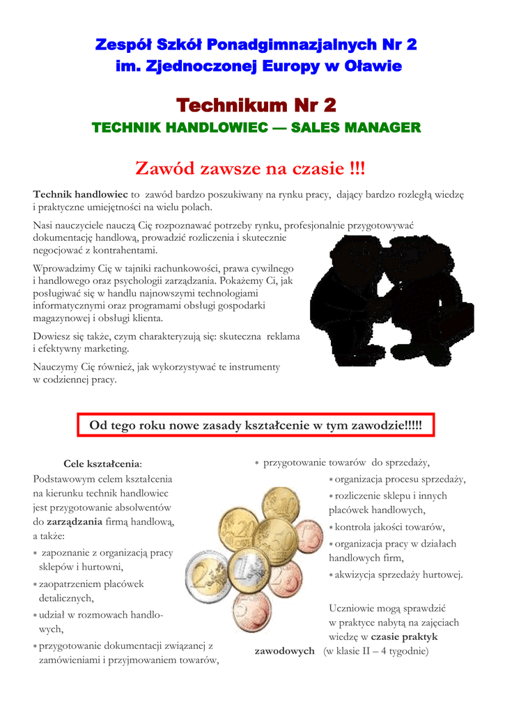 TECHNIK LOGISTYK Zespół Szkół Ponadgimnazjalnych Nr 2 im. Zjednoczonej Europy w Oławie Technikum Nr 2 TECHNIK HANDLOWIEC — SALES MANAGER Zawód zawsze na czasie !!! Technik handlowiec to zawód bardzo poszukiwany na rynku pracy, dający bardzo rozległą wiedzę i praktyczne umiejętności na wielu polach. Nasi nauczyciele nauczą Cię rozpoznawać potrzeby rynku, profesjonalnie przygotowywać dokumentację handlową, prowadzić rozliczenia i skutecznie negocjować z kontrahentami. Wprowadzimy Cię w tajniki rachunkowości, prawa cywilnego i handlowego oraz psychologii zarządzania. Pokażemy Ci, jak posługiwać się w handlu najnowszymi technologiami informatycznymi oraz programami obsługi gospodarki magazynowej i obsługi klienta. Dowiesz się także, czym charakteryzują się: skuteczna reklama i efektywny marketing. Nauczymy Cię również, jak wykorzystywać te instrumenty w codziennej pracy. Od tego roku nowe zasady kształcenie w tym zawodzie!!!!! Cele kształcenia: Podstawowym celem kształcenia na kierunku technik handlowiec jest przygotowanie absolwentów do zarządzania firmą handlową, a także: zapoznanie z organizacją pracy sklepów i hurtowni, zaopatrzeniem placówek detalicznych, udział w rozmowach handlo- wych, przygotowanie dokumentacji związanej z zamówieniami i przyjmowaniem towarów, przygotowanie towarów do sprzedaży, organizacja procesu sprzedaży, rozliczenie sklepu i innych placówek handlowych, kontrola jakości towarów, organizacja pracy w działach handlowych firm, akwizycja sprzedaży hurtowej. Uczniowie mogą sprawdzić w praktyce nabytą na zajęciach wiedzę w czasie praktyk zawodowych (w klasie II – 4 tygodnie) Perspektywy zatrudnienia: Jako technik handlowiec masz niemal nieograniczone możliwości zatrudnienia. Pracę znajdziesz jako przedstawiciel handlowy, merchandiser, sales manager — to zawody bardzo obecnie poszukiwane na rynku pracy. Możesz też pracować na średnich szczeblach zarządzania w przedsiębiorstwach. Zatrudnienie znajdziesz, jako przedstawiciel handlowy firm, działach handlowych firm państwowych i prywatnych, działach logistyki, jako personel zarządzający placówkami detalicznymi i hurtowymi, w działach marketingu. Zdobyte kwalifikacje pozwolą Ci także na otworzenie własnej działalności. Nauka w technikum ma za zadanie wykształcić w przyszłym absolwencie: - orientację marketingową i umiejętność posługiwania się narzędziami marketingowymi, - sprawne korzystanie ze zdobyczy technik komputerowych, - umiejętności posługiwania się przydatnymi w zawodzie programami komputerowymi i nowoczesną rachunkowością, a także zasadami prawa, - łatwość nawiązywania współpracy z kontrahentami krajowymi i zagranicznymi. Przykładowe zadania zawodowe organizacja komórki handlowej w firmie produkcyjno-usługowej, organizacja, rejestrowanie i uruchamianie działalności małej firmy handlowej (handlu hurtowego i detalicznego), planowanie poziomu, struktury asortymentowej, geograficznej, odbiorców oraz form sprzedaży towarów i usług (w tym formy Internetowej), samodzielne lub we współdziałaniu z przełożonymi, opracowywanie projektu strategii marketingowej firmy, programu jej wdrożenia, badanie rynku, czynników kształtujących oczekiwania, potrzeby klientów; podejmowanie działań, mających na celu pozyskanie nowych klientów i rynków oraz umacnianie pozycji już osiągniętych, prowadzenie negocjacji z dostawcami i odbiorcami towarów i usług, stosowanie różnych form i technik sprzedaży hurtowej i detalicznej; przygotowywanie właściwej dokumentacji sprzedaży towarów i usług, w tym faktur, gwarancji; załatwianie reklamacji klientów.