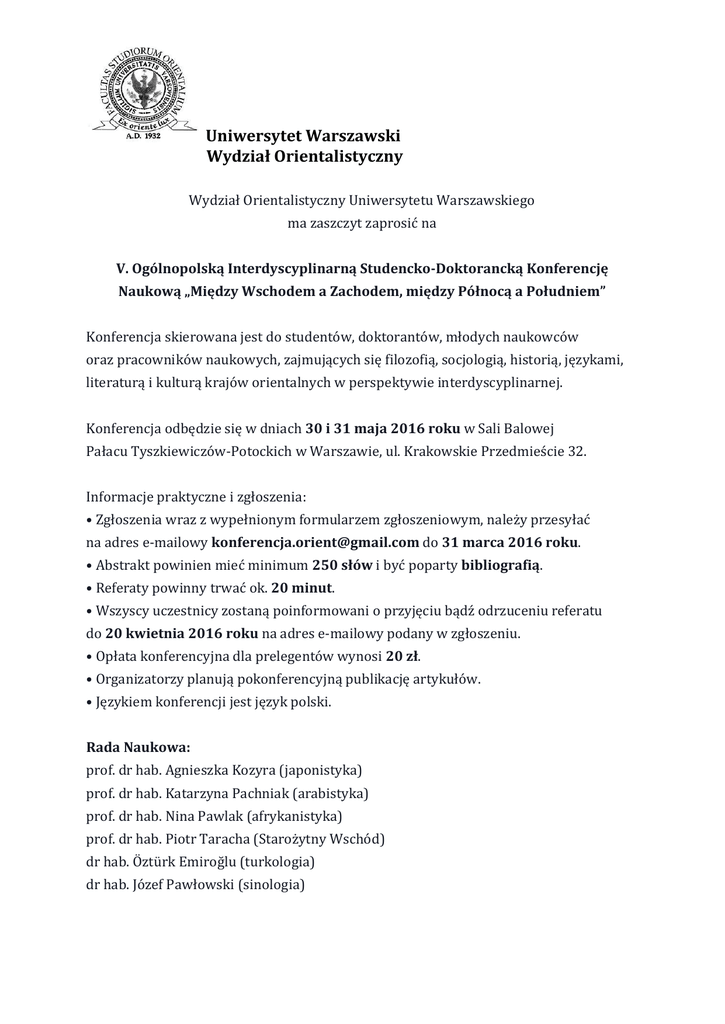 Uniwersytet Warszawski Wydział Orientalistyczny Wydział Orientalistyczny Uniwersytetu Warszawskiego ma zaszczyt zaprosić na V. Ogólnopolską Interdyscyplinarną Studencko-Doktorancką Konferencję Naukową „Między Wschodem a Zachodem, między Północą a Południem” Konferencja skierowana jest do studentów, doktorantów, młodych naukowców oraz pracowników naukowych, zajmujących się filozofią, socjologią, historią, językami, literaturą i kulturą krajów orientalnych w perspektywie interdyscyplinarnej. Konferencja odbędzie się w dniach 30 i 31 maja 2016 roku w Sali Balowej Pałacu Tyszkiewiczów-Potockich w Warszawie, ul. Krakowskie Przedmieście 32. Informacje praktyczne i zgłoszenia: • Zgłoszenia wraz z wypełnionym formularzem zgłoszeniowym, należy przesyłać na adres e-mailowy [email protected] do 31 marca 2016 roku. • Abstrakt powinien mieć minimum 250 słów i być poparty bibliografią. • Referaty powinny trwać ok. 20 minut. • Wszyscy uczestnicy zostaną poinformowani o przyjęciu bądź odrzuceniu referatu do 20 kwietnia 2016 roku na adres e-mailowy podany w zgłoszeniu. • Opłata konferencyjna dla prelegentów wynosi 20 zł. • Organizatorzy planują pokonferencyjną publikację artykułów. • Językiem konferencji jest język polski. Rada Naukowa: prof. dr hab. Agnieszka Kozyra (japonistyka) prof. dr hab. Katarzyna Pachniak (arabistyka) prof. dr hab. Nina Pawlak (afrykanistyka) prof. dr hab. Piotr Taracha (Starożytny Wschód) dr hab. Öztürk Emiroğlu (turkologia) dr hab. Józef Pawłowski (sinologia) Uniwersytet Warszawski Wydział Orientalistyczny dr hab. Shoshana Ronen (hebraistyka) dr Agata Bareja-Starzyńska (monoglistyka i tybetologia) dr Anna Paradowska (koreanistyka) dr Sylwia Surdykowska (iranistyka) dr Anna Trynkowska (indologia) Komitet organizacyjny: Chmielecka Agata Damek Marcin Karnas Mieszko Kozłowska Weronika Lesiczka Agnieszka Pawlaczyk Piotr Sawicz Katarzyna Treszczotko Paulina Podmioty organizujące: Koło Naukowe Mongolistyki i Tybetologii UW Międzywydziałowe Koło Afrykanistyczne UW Sinologiczne Koło Naukowe UW Turkologiczne Koło Naukowe UW Zarząd Samorządu Studentów WO UW Patronat honorowy: Prezydent Rzeczypospolitej Polskiej Andrzej Duda Partnerzy: Iranistyczne Koło Naukowe UW Japonistyczne Koło Naukowe Maru UW Koło Naukowe Arabistów UW Koło Naukowe Indologii „Rasa Mandala” UW Koło Studium Europy Wschodniej UW Uniwersytet Warszawski Wydział Orientalistyczny Koło Wschodu Starożytnego Bīt ummâni UW Międzywydziałowe Koreanistyczne Koło Naukowe UW Studenckie Koło Egiptologów Neheh UW Studenckie Koło Naukowe Klasycznej Literatury Japońskiej SEMI UW Towarzystwo Miłośników Kultury Arabskiej Marhaba UW Patroni: Afryka Connect Foundation Afrykanista.pl Afryka.org Azja-Pacyfik Centrum Studiów Polska Azja Centrum Wielokulturowe w Warszawie Bliskiwschod.pl Etnosystem.pl Forum Młodych Dyplomatów Fundacja Adulis Fundacja dla Somalii Histmag.org Instytut Yunus Emre Japonia-online.pl Kultura Turecka Magazyn Kontynenty Nabliskimwschodzie.pl Pięć Smaków Polandturkey.com Polskie Radio Polskie Towarzystwo Afrykanistyczne Radio Kampus Rodzynki Sułtańskie Telewizja Polska Wirtualnaturcja.pl Uniwersytet Warszawski Wydział Orientalistyczny Wydawnictwo Akademickie Dialog Uniwersytet Warszawski Wydział Orientalistyczny