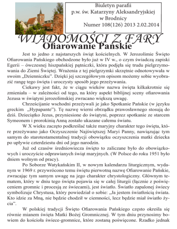 Biuletyn parafii p.w. św. Katarzyny Aleksandryjskiej w Brodnicy Numer 108(126) 2013 2.02.2014 WIADOMOŚCI Z FARY Ofiarowanie Pańskie Jest to jedno z najstarszych świąt kościelnych. W Jerozolimie Święto Ofiarowania Pańskiego obchodzone było już w IV w., o czym świadczą zapiski Egerii – ówczesnej hiszpańskiej pątniczki, która podjęła się trudu pielgrzymowania do Ziemi Świętej. Wrażenia z tej pielgrzymki skrzętnie odnotowywała w swoim „Dzienniczku”. Dzięki jej szczegółowym opisom możemy sobie wyobrazić rangę tego święta i uroczysty sposób jego przeżywania. Ciekawy jest fakt, że w ciągu wieków nazwa święta kilkakrotnie się zmieniała – w zależności od tego, na który aspekt biblijnej sceny ofiarowania Jezusa w świątyni jerozolimskiej zwracano większą uwagę. Chrześcijanie wschodni przeżywali je jako Spotkanie Pańskie (w języku greckim „Hypapante”). Tę nazwę wierni obrządku prawosławnego stosują do dziś. Dzieciątko Jezus, przyniesione do świątyni, poprzez spotkanie ze starcem Symeonem i prorokinią Anną zostało ukazane całemu światu. W X wieku zaczęto podkreślać także maryjny charakter tego święta, które przeżywano jako Oczyszczenie Najświętszej Maryi Panny, nawiązując tym samym do starotestamentalnej tradycji obowiązku oczyszczenia matki dziecka po upływie czterdziestu dni od jego narodzin. Już od czasów średniowiecza święto to zaliczane było do obowiązkowych i uroczyście odprawianych świąt maryjnych. (W Polsce do roku 1951 było dniem wolnym od pracy). Po Soborze Watykańskim II, w nowym kalendarzu liturgicznym, wydanym w 1969 r. przywrócono temu świętu pierwotną nazwę Ofiarowanie Pańskie, zwracając tym samym uwagę na jego charakter chrystologiczny. Głównym tematem, który w dniu tego święta pojawia się w całej liturgii (łącznie z poświęceniem gromnic i procesją ze świecami), jest światło. Światło zapalonej świecy symbolizuje Chrystusa, który powiedział o sobie: „Ja jestem światłością świata. Kto idzie za Mną, nie będzie chodził w ciemności, lecz będzie miał światło życia”. W polskiej tradycji Święto Ofiarowania Pańskiego często określa się równie mianem święta Matki Bożej Gromnicznej. W tym dniu przynosimy bowiem do kościoła świece-gromnice, które zostaną poświęcone. Rzadko jednak można zauważyć chrześcijan wychodzących z kościoła z zapaloną świecą, czy wystawiających ją w oknie podczas burzy. Zanika nie tylko tradycja, ale przede wszystkim wiara w głęboki sens czynionych znaków. Niestety, gromnica kojarzy się często jedynie ze śmiercią… Tymczasem symbolizuje ona opiekę Maryi. Może więc stanowić skuteczną obronę przed śmiercią duchową, a także zapewnić pomoc w życiu doczesnym. Nazwa tej świecy wywodzi się od słowa „grom”. Dawniej, podczas burz często można było zauważyć w którymś z okien domostwa zapaloną gromnicę. Był to zwyczaj powszechny. Za przyczyną Matki Bożej modlono się nie tylko o oddalenie piorunów, ale także o obronę przed wszelkim złem – oddalenie „gromów” duchowych. Wyrażano wiarę w to, że Maryja może ustrzec mieszkańców domu od zła: obronić od tragedii, pożaru, nagłych nieszczęść. W dniu święta Matki Bożej Gromnicznej wracano ze świątyni z zapalonymi świecami. Starano się donieść płomień gromnicy do domu, gdzie rozpalano od niego ogień w piecu, czy lampce przed świętym obrazem, wierząc, że dzięki temu zapłonie w tym miejscu także płomień miłości i zgody. W zagrodach chłopskich z gromnicą obchodzono także całe obejście oraz wypalano lub kopcono krzyż na powale, czy futrynie okiennej. Kiedyś gromnice wykonywane były jedynie z wosku, dzięki czemu po zapaleniu ich wydzielały piękny zapach. Wdychano go, ponieważ wierzono, że sam ten zapach ma również właściwości lecznicze. Była to świeca, poprzez którą okazywano ogromny szacunek Matce Bożej, wierząc w Jej opiekę i orędownictwo u Boga. O szacunku tym świadczy także fakt, że gromnicę przechowywano w domu w miejscu honorowym, szczególnym. Zapalano ją także przy konających. Ten piękny zwyczaj stosuje się do dziś, ale, niestety, coraz rzadziej. Zapomina się o tym, że jest to bardzo ważna forma towarzysząca modlitwie. Dość często wyrażane jest przekonanie, że dzięki światłu gromnicy człowiekowi lżej jest umierać. Prosi się dla umierającego o światłość wieczną, którą ta świeca symbolizuje i jednocześnie wskazuje ona także na obecność Maryi, która nosiła prawdziwe „Światło”. Znany jest obraz polskiego malarza Piotra Stachiewicza: „Na Gromniczną” (z cyklu „Legendy o Matce Bożej”). W zimowym, wiejskim pejzażu ukazana jest Maryja, która zapaloną gromnicą odpędza od ludzkich chat wygłodniałe wilki. Jest to obraz wielce symboliczny. To Ona – „zagroda duchowych owieczek, obrona od wilków niewidzialnych” – jak śpiewamy w „Akatyście” (hymnie ku czci Bogurodzicy) – chroni nas i ukazuje światu odwieczną Światłość – swojego Syna. Poniedziałek 03.02.2014 Wtorek 04.02.2014 Środa 05.02.2014 Czwartek 06.02.2014 Piątek 07.02.2014 6.30 7.00 8.00 18.30 18.30 18.30 6.30 7.00 8.00 18.30 18.30 6.30 7.00 8.00 18.30 18.30 18.30 6.30 7.00 8.00 17.00 18.30 18.30 6.30 7.00 8.00 17.00 18.30 18.30 6.30 Sobota 08.02.2014 V Niedziela Zwykła 09.02.2014 Kościół szkolny 6.30 7.00 7.00 8.00 18.30 18.30 6.30 8.00 9.30 11.00 12.15 18.30 8.30 10.00 11.30 Intencje Mszalne 03.02 – 09.02.2014 r. Dziękczynna za 70 lat życia z prośbą o Boże błog. dla Mieczysława. + Władysław – 20 r. śm. i Elżbieta Panowik; rodz. i rodzeostwo Bandrowscy. + Witold Miraszewski – 6 r. śm. + córka Maria – int. z racji urodzin. + Kazimierz Banaszewski – 12 r. śm. + rodzice: Marianna i Ignacy; żona Krystyna; syn Tomasz – int. od syna Eryka. + Stanisława i Leon Szymaoscy. W pewnej intencji. + Marta S
