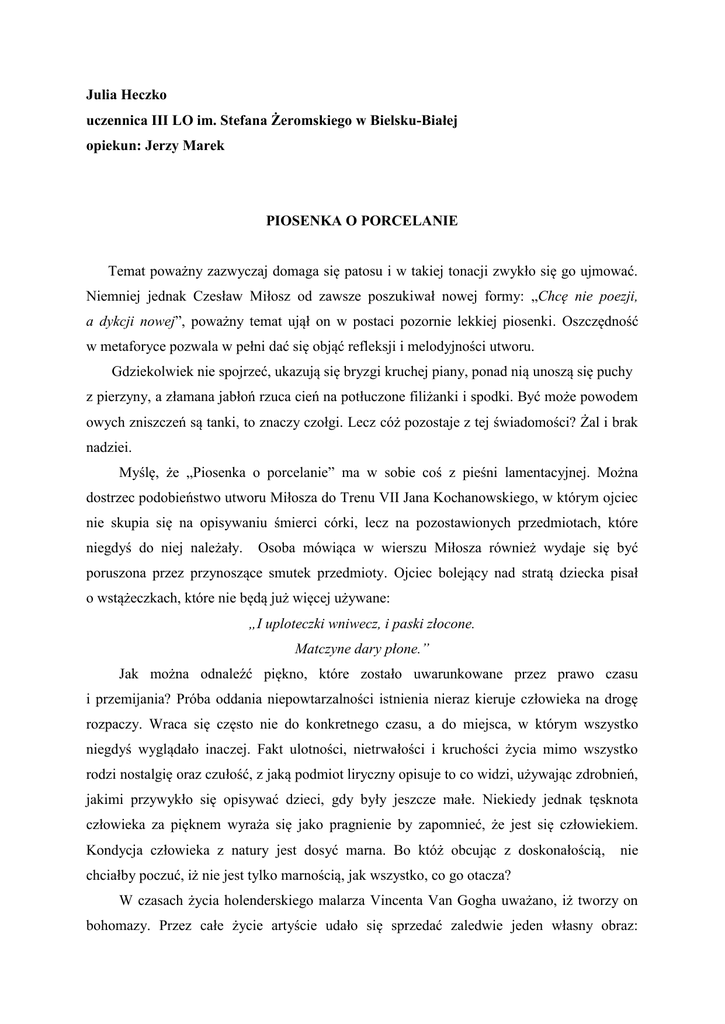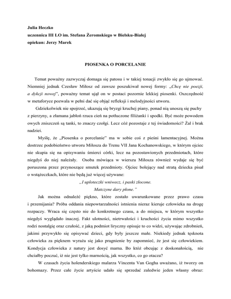 Julia Heczko uczennica III LO im. Stefana Żeromskiego w Bielsku-Białej opiekun: Jerzy Marek PIOSENKA O PORCELANIE Temat poważny zazwyczaj domaga się patosu i w takiej tonacji zwykło się go ujmować. Niemniej jednak Czesław Miłosz od zawsze poszukiwał nowej formy: „Chcę nie poezji, a dykcji nowej”, poważny temat ujął on w postaci pozornie lekkiej piosenki. Oszczędność w metaforyce pozwala w pełni dać się objąć refleksji i melodyjności utworu. Gdziekolwiek nie spojrzeć, ukazują się bryzgi kruchej piany, ponad nią unoszą się puchy z pierzyny, a złamana jabłoń rzuca cień na potłuczone filiżanki i spodki. Być może powodem owych zniszczeń są tanki, to znaczy czołgi. Lecz cóż pozostaje z tej świadomości? Żal i brak nadziei. Myślę, że „Piosenka o porcelanie” ma w sobie coś z pieśni lamentacyjnej. Można dostrzec podobieństwo utworu Miłosza do Trenu VII Jana Kochanowskiego, w którym ojciec nie skupia się na opisywaniu śmierci córki, lecz na pozostawionych przedmiotach, które niegdyś do niej należały. Osoba mówiąca w wierszu Miłosza również wydaje się być poruszona przez przynoszące smutek przedmioty. Ojciec bolejący nad stratą dziecka pisał o wstążeczkach, które nie będą już więcej używane: „I uploteczki wniwecz, i paski złocone. Matczyne dary płone.” Jak można odnaleźć piękno, które zostało uwarunkowane przez prawo czasu i przemijania? Próba oddania niepowtarzalności istnienia nieraz kieruje człowieka na drogę rozpaczy. Wraca się często nie do konkretnego czasu, a do miejsca, w którym wszystko niegdyś wyglądało inaczej. Fakt ulotności, nietrwałości i kruchości życia mimo wszystko rodzi nostalgię oraz czułość, z jaką podmiot liryczny opisuje to co widzi, używając zdrobnień, jakimi przywykło się opisywać dzieci, gdy były jeszcze małe. Niekiedy jednak tęsknota człowieka za pięknem wyraża się jako pragnienie by zapomnieć, że jest się człowiekiem. Kondycja człowieka z natury jest dosyć marna. Bo któż obcując z doskonałością, nie chciałby poczuć, iż nie jest tylko marnością, jak wszystko, co go otacza? W czasach życia holenderskiego malarza Vincenta Van Gogha uważano, iż tworzy on bohomazy. Przez całe życie artyście udało się sprzedać zaledwie jeden własny obraz: Czerwoną Winorośl. Jak zauważył Waldemar Łysiak w „Wyspach Bezludnych”, tragizm nie wynika z tego, iż nikt nie kupował jego dzieł, lecz że musiał z powodu głodu sprzedawać swoje dzieła handlarzowi starszyzną, który je odsprzedawał jako „płótna do przemalowywania”. Nikt nie dostrzegł piękna w dziełach - uważanego dziś za mistrza malarza. Nikt nie myślał o tym, że niszczy dzieła sztuki. Nikt nie wysilił się, by ocalić je od zapomnienia. Któż zatem dostrzegłby urok filiżanek czy dzbanków? Któż pochyli się na ich skorupkami? Jeśli nie zwrócono uwagi na obrazy Van Gogha, kogóż zasmucą filiżanki? W Chorwacji wciąż można łatwo natrafić na opuszczone i zniszczone hotele pozostawione same sobie po wojnie, jaka toczyła się na terenach Jugosławii w 1995 roku. W miejscowości Zaostrog, w dawnym domu wypoczynkowym nie ma już śladu po telewizorach, lampach, dywanach czy fotelach. To, co nadawało się do ponownego użytku zostało wyniesione lub skradzione. Hotel posiadał basen, lecz teraz nie ma w nim już wody, na dno zostały powrzucane zastawy i resztki filiżanek. Te kawałki filiżanek, za wyjątkiem walących się murów i powybijanych szyb to jedyne, co pozostało po tamtych wydarzeniach. Wiersz został napisany tuż po wojnie, z biografii i twórczości autora można wnioskować iż cierpienie, śmierć oraz okropności czasów zagłady nie były mu obce. Wojnę i zniszczenia jakie po sobie zostawiła, zwykło się opisywać poprzez patos oraz tragizm oblany krwią, bo tak przecież wyglądała rzeczywistość. Niektórzy mogliby zarzucić pisarzowi cynizm czy też mogliby spoglądać na „Piosenkę o porcelanie” z dystansem i politowaniem. Żeby jednak podkreślić wagę spostrzeżeń poety, chciałabym przytoczyć słowa Czesława Miłosza z 1982r.: „Wiedzieć i nie mówić: tak się zapomina. Co jest wymówione wzmacnia się. Co nie jest wymówione zmierza do nieistnienia.” Osoba mówiąca w wierszu ma świadomość, iż nikt nie uratował kruchych filiżanek, nikt nie zwrócił na nie swojej uwagi. Największym zagrożeniem dla piękna jest obojętność. Jedno jest pewne, proszę pana, te kawałeczki filiżanek mieszczą w sobie całe piękno utracone.