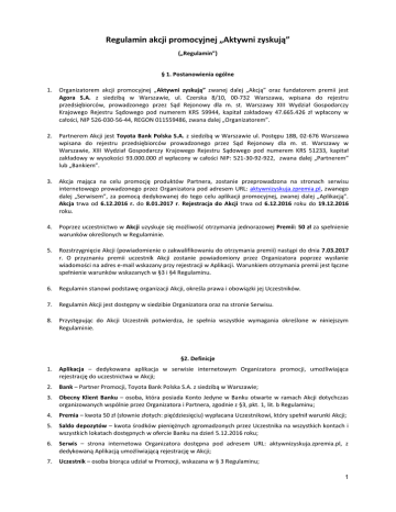 Regulamin akcji promocyjnej „Aktywni zyskują” („Regulamin”) § 1. Postanowienia ogólne 1. Organizatorem akcji promocyjnej „Aktywni zyskują” zwanej dalej „Akcją” oraz fundatorem premii jest Agora S.A. z siedzibą w Warszawie, ul. Czerska 8/10, 00-732 Warszawa, wpisana do rejestru przedsiębiorców, prowadzonego przez Sąd Rejonowy dla m. st. Warszawy XIII Wydział Gospodarczy Krajowego Rejestru Sądowego pod numerem KRS 59944, kapitał zakładowy 47.665.426 zł wpłacony w całości, NIP 526-030-56-44, REGON 011559486, zwana dalej „Organizatorem”. 2. Partnerem Akcji jest Toyota Bank Polska S.A. z siedzibą w Warszawie ul. Postępu 18B, 02-676 Warszawa wpisana do rejestru przedsiębiorców prowadzonego przez Sąd Rejonowy dla m. st. Warszawy w Warszawie, XIII Wydział Gospodarczy Krajowego Rejestru Sądowego pod numerem KRS 51233, kapitał zakładowy w wysokości 93.000.000 zł wpłacony w całości NIP: 521-30-92-922, zwana dalej „Partnerem” lub „Bankiem”. 3. Akcja mająca na celu promocję produktów Partnera, zostanie przeprowadzona na stronach serwisu internetowego prowadzonego przez Organizatora pod adresem URL: aktywnizyskuja.zpremia.pl, zwanego dalej „Serwisem”, za pomocą dedykowanej do tego celu aplikacji promocyjnej, zwanej dalej „Aplikacją”. Akcja trwa od 6.12.2016 r. do 8.01.2017 r. Rejestracja do Akcji trwa od 6.12.2016 roku do 19.12.2016 roku. 4. Poprzez uczestnictwo w Akcji uzyskuje się możliwość otrzymania jednorazowej Premii: 50 zł za spełnienie warunków określonych w Regulaminie. 5. Rozstrzygnięcie Akcji (powiadomienie o zakwalifikowaniu do otrzymania premii) nastąpi do dnia 7.03.2017 r. O przyznaniu premii uczestnik Akcji zostanie powiadomiony przez Organizatora poprzez wysłanie wiadomości na adres e-mail wskazany przy rejestracji w Aplikacji. Warunkiem otrzymania premii jest łączne spełnienie warunków wskazanych w §3 i §4 Regulaminu. 6. Regulamin stanowi podstawę organizacji Akcji, określa prawa i obowiązki jej Uczestników. 7. Regulamin Akcji jest dostępny w siedzibie Organizatora oraz na stronie Serwisu. 8. Przystępując do Akcji Uczestnik potwierdza, że spełnia wszystkie wymagania określone w niniejszym Regulaminie. §2. Definicje 1. Aplikacja – dedykowana aplikacja w serwisie internetowym Organizatora promocji, umożliwiająca rejestrację do uczestnictwa w Akcji; 2. Bank – Partner Promocji, Toyota Bank Polska S.A. z siedzibą w Warszawie; 3. Obecny Klient Banku – osoba, która posiada Konto Jedyne w Banku otwarte w ramach Akcji dotychczas organizowanych wspólnie przez Organizatora i Partnera, zgodnie z §3, pkt. 1, lit. b Regulaminu; 4. Premia – kwota 50 zł (słownie złotych: pięćdziesięciu) wypłacana Uczestnikowi, który spełnił warunki Akcji; 5. Saldo depozytów – kwota środków pieniężnych zgromadzonych przez Uczestnika na wszystkich kontach i wszystkich lokatach dostępnych w ofercie Banku na dzień 5.12.2016 roku; 6. Serwis – strona internetowa Organizatora dostępna pod adresem URL: aktywnizyskuja.zpremia.pl, z dedykowaną Aplikacją umożliwiającą rejestrację w Akcji; 7. Uczestnik – osoba biorąca udział w Promocji, wskazana w § 3 Regulaminu; 1 8. Utrzymanie lokaty – utrzymanie aktywnej umowy lokaty Plan Depozytowy na 130 dni w kwocie min. 10 000 zł założonej w ramach Akcji przez minimum 40 dni licząc od dnia jej założenia; 9. Zwiększenie salda depozytów – zwiększenie kwoty środków pieniężnych zgromadzonych na dzień 5.12.2016 r. na wszystkich kontach i wszystkich lokatach dostępnych w ofercie Banku, poprzez założenie w okresie trwania Akcji lokaty Plan Depozytowy na 130 dni na kwotę min. 10 000 zł. 10. Utrzymanie zwiększonego salda depozytów – utrzymanie przez minimum 40 dni licząc od dnia założenia lokaty Plan Depozytowy na 130 dni, kwoty depozytów zgodnie ze stanem na dzień 5.12.2016 roku (tj. środków zgromadzonych na wszystkich kontach i wszystkich lokatach w Banku, wraz z lokatą Plan Depozytowy na 130 w kwocie min. 10 000 zł założoną w ramach Akcji); § 3. Uczestnictwo w Akcji 1. Uczestnikami Akcji mogą być: a. pełnoletnie osoby fizyczne, posiadające pełną zdolność do czynności prawnych, zamieszkałe na terytorium Rzeczypospolitej Polskiej, spełniające warunki określone w niniejszym Regulaminie, jak również spełniające warunki określone w Regulaminie świadczenia usług dla konsumentów dostępnego na stronie Partnera pod adresem: https://www.toyotabank.pl/fileadmin/user_upload/PDFy/WAZNE_DOKUMENTY/Nowi_klienci/Regu laminy_tabele_oplat_szablony_umow/TBP_regulamin_dla_konsumentow18122011_01012016_3_. pdf b. osoby, które posiadają aktywne Konto Jedyne w Banku otwarte w ramach poprzednich akcji organizowanych wspólnie przez Organizatora i Bank: I. Lokata Toyota Bank z premią URL: lokata35.zpremia.pl; II. Promocja SUPER DUET URL: lokata325.zpremia.pl; III. Super Duet edycja 2 URL: lokata6m.zpremia.pl; IV. Promocja SUPER DUET edycja 3 URL: lokata.zpremia.pl; V. Bądź aktywny- załóż nowy depozyt URL:aktywni.zpremia.pl VI. 100 dni z premią URL:tankujkorzysci.zpremia.pl VII. 130 dni z premią URL: lokata130dni.zpremia.pl (zwani dalej „Uczestnikami”) 2. Uczestnikami Akcji nie mogą być: a. pracownicy/współpracownicy Organizatora oraz ich małżonkowie, dzieci, rodzice oraz rodzeństwo; b. pracownicy Partnera; c. osoby, które w terminie od 7.04.2015 roku do 5.12.2016 roku rozwiązały z Bankiem umowę o prowadzenie Konta Jedynego; 2 § 4. Zasady udziału w Akcji Wzięcie udziału w Akcji wymaga spełnienia przez Uczestnika warunków przedstawionych poniżej: 1. Uczestnik, który posiada aktywne Konto Jedyne w Banku otwarte w ramach poprzednich akcji wskazanych w § 3 ust. 1b zobowiązany jest spełnić łącznie następujące warunki: a. w terminie od dnia 6.12.2016 roku do dnia 19.12.2016 roku na stronie Serwisu URL: aktywnizyskuja.zpremia.pl zarejestrować się w Aplikacji podając: imię, nazw