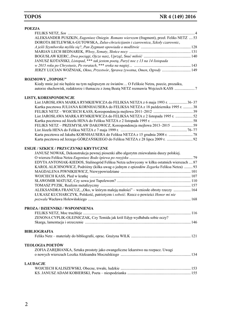 TOPOS NR 4 (149) 2016 POEZJA FELIKS NETZ, Sen ..................................................................................................................................... 4 ALEKSANDER PUSZKIN, Eugeniusz Oniegin. Romans wierszem (fragment), przeł. Feliks NETZ ..... 53 DOROTA BETLEWSKA-GUTOWSKA, Zulus-chrześcijanin i czarownica, Szkoły czarownic, A jeśli Szymborska myliła się?, Pan Zygmunt opowiada o modlitwie ..................................................... 128 MARIAN LECH BEDNAREK, Włosy, Szmaty, Słońce nocy ................................................................. 131 BOGUSŁAW KIERC, Dwa pociągi, Ojcze nasz, Uprząż, Snuć miłość .................................................. 140 JANUSZ KOTAŃSKI, Listopad, *** tak jestem poetą, Paryż noc z 13 na 14 listopada w 2015 roku po Chrystusie, Po roratach, *** sroka na nagiej… ............................................................ 143 JERZY LUCJAN WOŹNIAK, Okno, Przestwór, Sprawa żywotna, Omen, Ogrody . ............................. 149 ROZMOWY „TOPOSU” Kiedy mnie już nie będzie na tym najlepszym ze światów… O Feliksie Netzu, poecie, prozaiku, autorze słuchowisk, redaktorze i tłumaczu z żoną Beatą NETZ rozmawia Wojciech KASS . .................... 7 LISTY, KORESPONDENCJE List JAROSŁAWA MARKA RYMKIEWICZA do FELIKSA NETZA z 6 maja 1993 r. ................... 36–37 Kartka pocztowa JULIANA KORNHAUSERA do FELIKSA NETZA z 18 października 1995 r. .......... 38 FELIKS NETZ – WOJCIECH KASS, Korespondencja mejlowa 2011–2012 .......................................... 39 List JAROSŁAWA MARKA RYMKIEWICZA do FELIKSA NETZA z 2 listopada 1995 r. . ................. 52 Kartka pocztowa od Józefa HENA do Feliksa NETZA z 2 listopada 1995 r. . .......................................... 58 FELIKS NETZ – PRZEMYSŁAW DAKOWICZ, Korespondencja mejlowa 2013–2015 ....................... 59 List Józefa HENA do Feliksa NETZA z 7 maja 1999 r. ...................................................................... 76–77 Karta pocztowa od Jakuba KORNHAUSERA do Feliksa NETZA z 15 grudnia 2008 r. .......................... 78 Karta pocztowa od Jerzego GÓRZAŃSKIEGO do Feliksa NETZA z 28 lipca 2009 r. ............................ 92 ESEJE / SZKICE / PRZYCZYNKI KRYTYCZNE JANUSZ NOWAK, Dekonstrukcja pewnej piosenki albo algorytm zniewalania duszy polskiej. O wierszu Feliksa Netza Eugeniusz Bodo śpiewa po rosyjsku .................................................................. 79 EDYTA ANTONIAK-KIEDOS, Stalinogród Feliksa Netza uchwycony w kilku ostatnich wierszach .... 87 KAROL ALICHNOWICZ, Podróżny (kilka uwag o jednym z epizodów Zegarka Feliksa Netza) .......... 93 MAGDALENA PIWNIKIEWICZ, Niewypowiedziane .......................................................................... 101 WOJCIECH KASS, Pled w kratkę .......................................................................................................... 107 SŁAWOMIR MATUSZ, Czy sowa jest Tupolewem? ............................................................................. 110 TOMASZ PYZIK, Realizm metafizyczny ............................................................................................... 157 ALEKSANDRA FRANCUZ, „Oko, w którym maleją małości” – wzniosłe obroty rzeczy ................... 164 ŁUKASZ KUCHARCZYK, Polskość, patriotyzm i sobość. Rzecz o powieści Honor mi nie pozwala Wacława Holewińskiego . .......................................................................................................... 168 PROZA / DZIENNIKI / WSPOMNIENIA FELIKS NETZ, Moc truchleje . ............................................................................................................... 116 ZENONA CYPLIK-OLEJNICZAK, Czy Temida jak król Edyp wydłubała sobie oczy? Skarga, lamentacja i orzeczenie ............................................................................................................... 146 BIBLIOGRAFIA Feliks Netz – materiały do bibliografii, oprac. Grażyna WILK . ............................................................. 121 TEOLOGIA POETÓW ZOFIA ZARĘBIANKA, Sztuka prostoty jako ewangeliczne lekarstwo na rozpacz. Uwagi o nowych wierszach Leszka Aleksandra Moczulskiego .......................................................................... 134 LAUDACJE WOJCIECH KALISZEWSKI, Obecne, trwałe, ludzkie . ........................................................................ 153 KS. JANUSZ ADAM KOBIERSKI, Poeta – niespodzianka . ................................................................. 155 2 RECENZJE ANDRZEJ JOŃCZYK, Archeologia pamięci (E. Kruk, Nieobecność) . ................................................. 174 WIESŁAW SETLAK, Konserwatysta ze Światłogrodu (A. Horubała, Droga do Poznania i inne zapiski) ..................................................................................................................................................... 175 ADRIAN GLEŃ, Krytyk w służbie wspólnoty (K. Krasuski, Republiki literackiej nowoczesności) ..... 176 WIESŁAW SETLAK, Miasto jest we mnie (M. Cielecki, Miasto wewnętrzne. Latopis) ....................... 177 BARBARA SOKOŁOWSKA, „Kto ciebie dogoni strumieniu…”. Rzecz o Wincentym Różańskim (M. Nalepa, W. Setlak, Syn bogini. Wincenty „Witek” Różański) ........................................ 179 KARINA ĆWIRZEŃ, „Nieustannie po tej i po tamtej stronie” (G. Kociuba, Osady) ............................ 180 WIESŁAW SETLAK, Poezja i (a) dynamika wiary (E. Dymowski, Dotyk pamięci. Wiersze wybrane) ..................................................................................................................................... 182 KRZYSZTOF DERDOWSKI, Romans i horror (G. Filip, Miłość pod koniec świata) . ......................... 183 10 ZDAŃ… BARBARA KASICA KOŁOMYJSKA, J. Chachuła, Czarny kot; PIOTR WIKTOR LORKOWSKI, U. Rachowski, Miss Zuki czyli Ameryka jest 