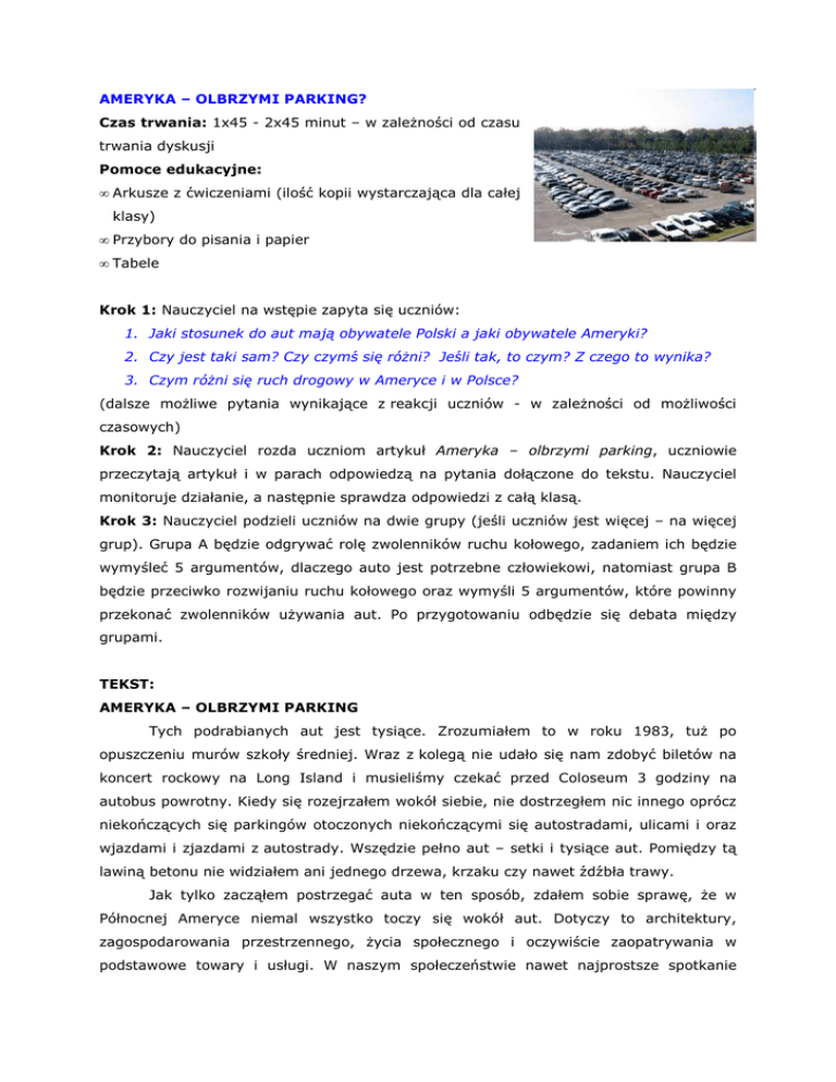 AMERYKA – OLBRZYMI PARKING? Czas trwania: 1x45 - 2x45 minut – w zależności od czasu trwania dyskusji Pomoce edukacyjne: • Arkusze z ćwiczeniami (ilość kopii wystarczająca dla całej klasy) • Przybory do pisania i papier • Tabele Krok 1: Nauczyciel na wstępie zapyta się uczniów: 1. Jaki stosunek do aut mają obywatele Polski a jaki obywatele Ameryki? 2. Czy jest taki sam? Czy czymś się różni? Jeśli tak, to czym? Z czego to wynika? 3. Czym różni się ruch drogowy w Ameryce i w Polsce? (dalsze możliwe pytania wynikające z reakcji uczniów - w zależności od możliwości czasowych) Krok 2: Nauczyciel rozda uczniom artykuł Ameryka – olbrzymi parking, uczniowie przeczytają artykuł i w parach odpowiedzą na pytania dołączone do tekstu. Nauczyciel monitoruje działanie, a następnie sprawdza odpowiedzi z całą klasą. Krok 3: Nauczyciel podzieli uczniów na dwie grupy (jeśli uczniów jest więcej – na więcej grup). Grupa A będzie odgrywać rolę zwolenników ruchu kołowego, zadaniem ich będzie wymyśleć 5 argumentów, dlaczego auto jest potrzebne człowiekowi, natomiast grupa B będzie przeciwko rozwijaniu ruchu kołowego oraz wymyśli 5 argumentów, które powinny przekonać zwolenników używania aut. Po przygotowaniu odbędzie się debata między grupami. TEKST: AMERYKA – OLBRZYMI PARKING Tych podrabianych aut jest tysiące. Zrozumiałem to w roku 1983, tuż po opuszczeniu murów szkoły średniej. Wraz z kolegą nie udało się nam zdobyć biletów na koncert rockowy na Long Island i musieliśmy czekać przed Coloseum 3 godziny na autobus powrotny. Kiedy się rozejrzałem wokół siebie, nie dostrzegłem nic innego oprócz niekończących się parkingów otoczonych niekończącymi się autostradami, ulicami i oraz wjazdami i zjazdami z autostrady. Wszędzie pełno aut – setki i tysiące aut. Pomiędzy tą lawiną betonu nie widziałem ani jednego drzewa, krzaku czy nawet źdźbła trawy. Jak tylko zacząłem postrzegać auta w ten sposób, zdałem sobie sprawę, że w Północnej Ameryce niemal wszystko toczy się wokół aut. Dotyczy to architektury, zagospodarowania przestrzennego, życia społecznego i oczywiście zaopatrywania w podstawowe towary i usługi. W naszym społeczeństwie nawet najprostsze spotkanie ludzi, na przykład na koncercie, czy przy okazji zawodów sportowych, nie obejdzie się bez tysiąca samochodów i kilometrów asfaltu. W Ameryce zostało tylko kilka cennych miejsc, gdzie nie widać lub nie słychać żadnych dróg szybkiego ruchu czy autostrad. Nawet parki narodowe nie zostały oszczędzone. Na obszarze amerykańskich lasów państwowych o powierzchni 777 000 km2 wybudowano do tej pory 617 000 km autostrad. Amerykanie „odpracowują“ za kierownicą średnio 10 czterdziestogodzinnych tygodni roboczych w roku, a więcej niż jedna szósta dochodu jest przeznaczana na ich samochód. Jeżeli punktem centralnym życia w Stanach nie jest wszechpotężny dolar, z pewnością jest nim wszechobecny samochód. Andy Singer, KarykAUTury, s. 11-12; National Forest Service, „Road Analysis“; U.S. Department of Transportation, „Summary of Travel Trends“; U.S. Bureau of the Census, „Statistical Abstract of the United States“ 1999. 1. Co autorowi artykułu nie podoba się w autach? Jest ich dużo, zajmują dużo miejsca (parkingi, podjazdy, autostrady, drogi). Wszystko dopasowuje się do transportu samochodowego – przyjmuje się, że każdy posiada auto. Auta wypierają z ulic zieleń i drzewa. 2. Jak auta zmieniły życie człowieka w SA? Prawie wszystko w USA toczy się wokół aut. Dotyczy to architektury, zagospodarowania przestrzennego, życia społecznego, wydarzeń sportowych i kulturalnych itd. 3. Ile czasu spędzają Amerykanie za kierownicą? Dziesięć czterdziestogodzinowych tygodni roboczych w roku. 4. Jak różni się sytuacja w Polsce od sytuacji w Ameryce? 5. Czy obywatele polscy są zależni od samochodów w takim samym stopniu jak obywatele USA? Krok 6: Wnioski (czy uczniom podobały się zajęcia, czego nowego nauczyli się w trakcie zajęć, jakie uczucia towarzyszyły im w trakcie zajęć itp.). AMERYKA – OLBRZYMI PARKING Tych podrabianych aut jest tysiące. Zrozumiałem to w roku 1983, tuż po opuszczeniu murów szkoły średniej. Wraz z kolegą nie udało się nam zdobyć biletów na koncert rockowy na Long Island i musieliśmy czekać przed Coloseum 3 godziny na autobus powrotny. Kiedy się rozejrzałem wokół siebie, nie dostrzegłem nic innego oprócz niekończących się parkingów otoczonych niekończącymi się autostradami, ulicami i oraz wjazdami i zjazdami z autostrady. Wszędzie pełno aut – setki i tysiące aut. Pomiędzy tą lawiną betonu nie widziałem ani jednego drzewa, krzaku czy nawet źdźbła trawy. Jak tylko zacząłem postrzegać auta w ten sposób, zdałem sobie sprawę, że w Północnej Ameryce niemal wszystko toczy się wokół aut. Dotyczy to architektury, zagospodarowania przestrzennego, życia społecznego i oczywiście zaopatrywania w podstawowe towary i usługi. W naszym społeczeństwie nawet najprostsze spotkanie ludzi, na przykład na koncercie, czy przy okazji zawodów sportowych, nie obejdzie się bez tysiąca samochodów i kilometrów asfaltu. W Ameryce zostało tylko kilka cennych miejsc, gdzie nie widać lub nie słychać żadnych dróg szybkiego ruchu czy autostrad. Nawet parki narodowe nie zostały oszczędzone. Na obszarze amerykańskich lasów państwowych o powierzchni 777 000 km2 wybudowano do tej pory 617 000 km autostrad. Amerykanie „odpracowują“ za kierownicą średnio 10 czterdziestogodzinnych tygodni roboczych w roku, a więcej niż jedna szósta dochodu jest przeznaczana na ich samochód. Jeżeli punktem centralnym życia w Stanach nie jest wszechpotężny dolar, z pewnością jest nim wszechobecny samochód. Andy Singer, KarykAUTury, s. 11-12; National Forest Service, „Road Analysis“; U.S. Department of Transportation, „Summa