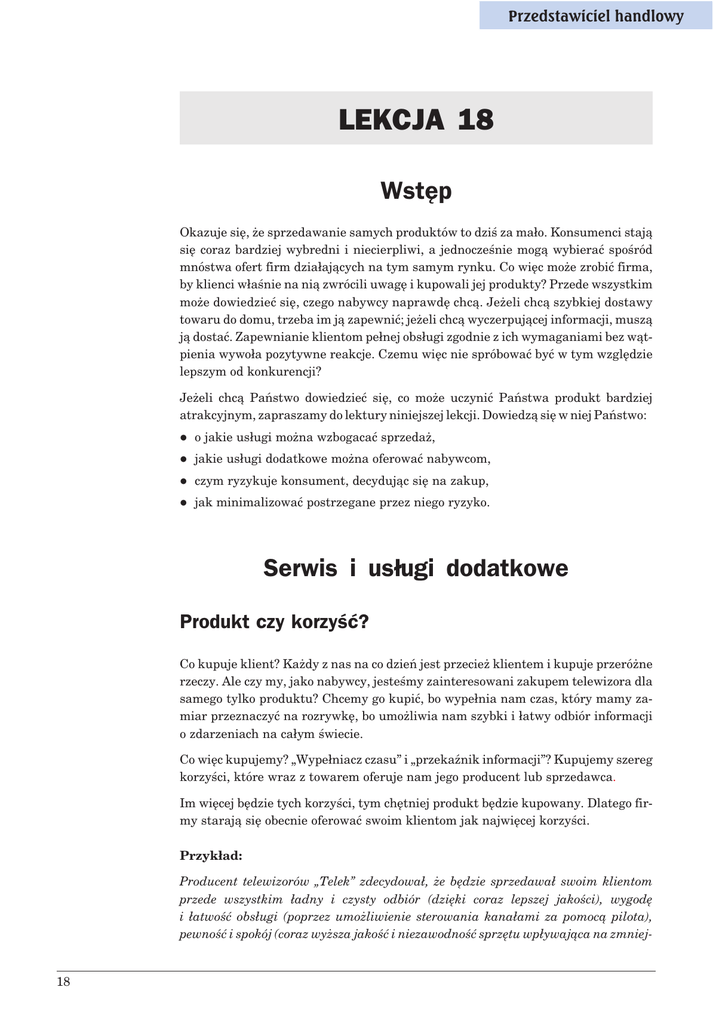 Przedstawiciel handlowy LEKCJA 18 Wstêp Okazuje siê, ¿e sprzedawanie samych produktów to dziœ za ma³o. Konsumenci staj¹ siê coraz bardziej wybredni i niecierpliwi, a jednoczeœnie mog¹ wybieraæ spoœród mnóstwa ofert firm dzia³aj¹cych na tym samym rynku. Co wiêc mo¿e zrobiæ firma, by klienci w³aœnie na ni¹ zwrócili uwagê i kupowali jej produkty? Przede wszystkim mo¿e dowiedzieæ siê, czego nabywcy naprawdê chc¹. Je¿eli chc¹ szybkiej dostawy towaru do domu, trzeba im j¹ zapewniæ; je¿eli chc¹ wyczerpuj¹cej informacji, musz¹ j¹ dostaæ. Zapewnianie klientom pe³nej obs³ugi zgodnie z ich wymaganiami bez w¹tpienia wywo³a pozytywne reakcje. Czemu wiêc nie spróbowaæ byæ w tym wzglêdzie lepszym od konkurencji? Je¿eli chc¹ Pañstwo dowiedzieæ siê, co mo¿e uczyniæ Pañstwa produkt bardziej atrakcyjnym, zapraszamy do lektury niniejszej lekcji. Dowiedz¹ siê w niej Pañstwo: l o jakie us³ugi mo¿na wzbogacaæ sprzeda¿, l jakie us³ugi dodatkowe mo¿na oferowaæ nabywcom, l czym ryzykuje konsument, decyduj¹c siê na zakup, l jak minimalizowaæ postrzegane przez niego ryzyko. Serwis i us³ugi dodatkowe Produkt czy korzyœæ? Co kupuje klient? Ka¿dy z nas na co dzieñ jest przecie¿ klientem i kupuje przeró¿ne rzeczy. Ale czy my, jako nabywcy, jesteœmy zainteresowani zakupem telewizora dla samego tylko produktu? Chcemy go kupiæ, bo wype³nia nam czas, który mamy zamiar przeznaczyæ na rozrywkê, bo umo¿liwia nam szybki i ³atwy odbiór informacji o zdarzeniach na ca³ym œwiecie. Co wiêc kupujemy? „Wype³niacz czasu” i „przekaŸnik informacji”? Kupujemy szereg korzyœci, które wraz z towarem oferuje nam jego producent lub sprzedawca. Im wiêcej bêdzie tych korzyœci, tym chêtniej produkt bêdzie kupowany. Dlatego firmy staraj¹ siê obecnie oferowaæ swoim klientom jak najwiêcej korzyœci. Przyk³ad: Producent telewizorów „Telek” zdecydowa³, ¿e bêdzie sprzedawa³ swoim klientom przede wszystkim ³adny i czysty odbiór (dziêki coraz lepszej jakoœci), wygodê i ³atwoœæ obs³ugi (poprzez umo¿liwienie sterowania kana³ami za pomoc¹ pilota), pewnoœæ i spokój (coraz wy¿sza jakoœæ i niezawodnoœæ sprzêtu wp³ywaj¹ca na zmniej- 18 PRZEDSTAWICIEL HANDLOWY LEKCJA 18 szenie czêstotliwoœci koniecznych napraw) oraz pe³n¹ informacjê (dziêki udostêpnieniu bezp³atnej linii telefonicznej). Zadanie praktyczne 1 Czy, Pañstwa zdaniem, producent telewizorów mo¿e zaoferowaæ nabywcom swoich produktów jeszcze inne korzyœci zwi¹zane z posiadaniem odbiornika telewizyjnego? Je¿eli tak, jakie? W walce o klienta producenci przeœcigaj¹ siê w tworzeniu coraz ciekawszych ofert. Uzupe³nieniem materialnego wyrobu s¹ coraz czêœciej us³ugi dodatkowe, które mo¿na podzieliæ na: 1. us³ugi zwi¹zane ze sprzeda¿¹: l akceptacja kart kredytowych, l sprzeda¿ ratalna, l akceptacja reklamacji, l zapewnienie gwarancji zwrotu w przypadku, gdyby produkt nie odpowiada³ wymaganiom nabywców, l zapewnienie bezp³atnego serwisu, l udzielanie gwarancji. 2. us³ugi dodatkowe, wykraczaj¹ce poza standardow¹ obs³ugê: l bezp³atne numery telefoniczne zapewniaj¹ce pe³n¹ informacjê na temat produktu i doradztwo; umo¿liwiaj¹ one tak¿e sk³adanie skarg w sposób anonimowy, l instrukta¿ i szkolenie u¿ytkowników, l dostarczenie towaru pod wskazany adres, l instalacja urz¹dzeñ, l dostosowanie produktu do specyficznych potrzeb klienta itp. Przyk³ad: Producent odzie¿y damskiej „Twoja moda”, prowadz¹cy sprzeda¿ wysy³kow¹ swoich wyrobów, po otrzymaniu zamówienia wysy³a do klienta list z potwierdzeniem szczegó³ów oferty. W przypadku ewentualnych rozbie¿noœci konsumenci proszeni s¹ o niezw³oczny kontakt telefoniczny (za pomoc¹ bezp³atnej linii) w celu ich usuniêcia. W okresach szczytu œwi¹tecznego, kiedy mog¹ wyst¹piæ opóŸnienia dostaw, przedstawiciele firmy „Twoja moda” telefonicznie informuj¹ klientów o etapie realizacji zamówienia. Jeœli zamówiony produkt ró¿ni siê nieco od zaprezentowanego w katalogu (np. odcieniem), klienci s¹ informowani o tym telefonicznie i proszeni o wyra¿enie zgody na dostarczenie takiego egzemplarza. Przedstawiciele firmy doradzaj¹ tak¿e, w jaki sposób mo¿na zestawiaæ poszczególne elementy oferty. Przy tak rozbudowanej us³udze (producent odzie¿y przywi¹zuje du¿¹ wagê do us³ug wykraczaj¹cych poza podstawow¹ obs³ugê) zwroty towarów s¹ minimalne, a satysfakcja klientów znaczna, poniewa¿ maj¹ oni poczucie ca³kowitej kontroli nad dokonywanym zakupem. 19