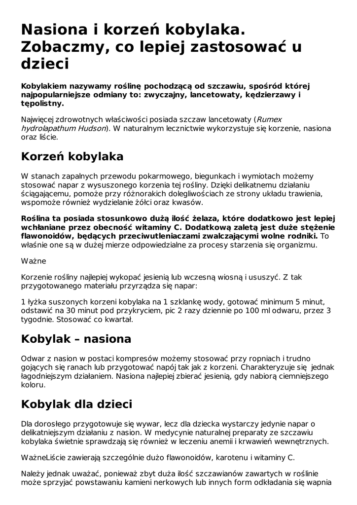 Nasiona i korzeń kobylaka. Zobaczmy, co lepiej zastosować u dzieci Kobylakiem nazywamy roślinę pochodzącą od szczawiu, spośród której najpopularniejsze odmiany to: zwyczajny, lancetowaty, kędzierzawy i tępolistny. Najwięcej zdrowotnych właściwości posiada szczaw lancetowaty (Rumex hydrolapathum Hudson). W naturalnym lecznictwie wykorzystuje się korzenie, nasiona oraz liście. Korzeń kobylaka W stanach zapalnych przewodu pokarmowego, biegunkach i wymiotach możemy stosować napar z wysuszonego korzenia tej rośliny. Dzięki delikatnemu działaniu ściągającemu, pomoże przy różnorakich dolegliwościach ze strony układu trawienia, wspomoże również wydzielanie żółci oraz kwasów. Roślina ta posiada stosunkowo dużą ilość żelaza, które dodatkowo jest lepiej wchłaniane przez obecność witaminy C. Dodatkową zaletą jest duże stężenie flawonoidów, będących przeciwutleniaczami zwalczającymi wolne rodniki. To właśnie one są w dużej mierze odpowiedzialne za procesy starzenia się organizmu. Ważne Korzenie rośliny najlepiej wykopać jesienią lub wczesną wiosną i ususzyć. Z tak przygotowanego materiału przyrządza się napar: 1 łyżka suszonych korzeni kobylaka na 1 szklankę wody, gotować minimum 5 minut, odstawić na 30 minut pod przykryciem, pic 2 razy dziennie po 100 ml odwaru, przez 3 tygodnie. Stosować co kwartał. Kobylak – nasiona Odwar z nasion w postaci kompresów możemy stosować przy ropniach i trudno gojących się ranach lub przygotować napój tak jak z korzeni. Charakteryzuje się jednak łagodniejszym działaniem. Nasiona najlepiej zbierać jesienią, gdy nabiorą ciemniejszego koloru. Kobylak dla dzieci Dla dorosłego przygotowuje się wywar, lecz dla dziecka wystarczy jedynie napar o delikatniejszym działaniu z nasion. W medycynie naturalnej preparaty ze szczawiu kobylaka świetnie sprawdzają się również w leczeniu anemii i krwawień wewnętrznych. WażneLiście zawierają szczególnie dużo flawonoidów, karotenu i witaminy C. Należy jednak uważać, ponieważ zbyt duża ilość szczawianów zawartych w roślinie może sprzyjać powstawaniu kamieni nerkowych lub innych form odkładania się wapnia w organizmie w wyniku nieprawidłowego działania nerek. Mogą również następować zaburzenia funkcjonowania mięśni i ich kurczenia. U osób posiadających problemy z układem moczowym, kobiet w ciąży i karmiących nie zaleca się stosowania produktów posiadających wysoką zawartość szczawianów. Roślina ta posiada wiele właściwości pozytywnie wpływających na nasz organizm, szczególnie przy problemach jelitowych, zaparciach, hemoroidach oraz anemii. Od lat cieszy się dużym zainteresowaniem w wielu krajach, warto więc zwrócić się ku niej ze względu na jej łatwą dostępność i właściowości prozdrowotne. Author: Damian Adamiak Link do artykułu: http://bonavita.pl/nasiona-i-korzen-kobylaka-zobaczmy-co-lepiejzastosowac-u-dzieci