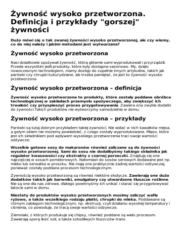Żywność wysoko przetworzona. Definicja i przykłady "gorszej" żywności Dużo mówi się o tak zwanej żywności wysoko przetworzonej, ale czy wiemy, co do niej należy i jakimi metodami jest wytwarzana? Żywność wysoko przetworzona Nasi dziadkowie spożywali żywność, którą głównie sami wyprodukowali i przyrządzili. Przede wszystkim jedli produkty, które były dostępne sezonowo. My, dzięki nowoczesnym technologiom, mamy dostęp do zupełnie innych artykułów, takich jak parówki czy chrupki kukurydziane, ale trzeba pamiętać, że jest to żywność wysoko przetworzona Żywność wysoko przetworzona – definicja Żywność wysoko przetworzona to produkty, które zostały poddane obróbce technologicznej w zakładach przemysłu spożywczego, aby zwiększyć ich trwałość czy przyspieszyć proces przygotowywania. Zawiera ona zwykle dodatki do żywności.Takich produktów nie wytworzymy samodzielnie w domu. Żywność wysoko przetworzona – przykłady Parówki są tutaj dobrym przykładem takiej żywności. Nie widać w nich kawałków mięsa, a gołym okiem nie możemy powiedzieć, z czego zostały wyprodukowane. Mięso, które jest ich składnikiem pod wpływem wysokiego przetworzenia traci swoje wartości odżywcze. Wszelkie gotowe sosy do makaronów również zaliczane są do żywności wysoko przetworzonej. Sami do sosu nie dodalibyśmy takiego składnika jak regulator kwasowości czy ekstrakty z czarnej porzeczki. Znajdują się one najczęściej w sosach pomidorowych. Natomiast do sosów serowych dodawane jest np. mleko lub serwatka w proszku. Nie mają one praktycznie żadnej wartości odżywczej, ponieważ zostały poddane procesom technologicznym. Żywnością wysoko przetworzoną są również niektóre słodycze. Zawierają one dużo dodatków takich jak barwniki, emulgatory czy utwardzone tłuszcze roślinne. Nie są one dla nas zdrowe, dlatego powinnyśmy ich unikać i starać się przygotowywać łakocie sami w domu. Niestety do produktów wysoko przetworzonych musimy zaliczyć wafle ryżowe, a także wszelkiego rodzaju płatki, chrupki do mleka. Poddawane są różnym zabiegom technologicznym, np. ekstruzji, czyli działaniu wysokiej temperatury i ciśnienia, co powoduje, że tracą swoje wartości odżywcze. Ziemniaki, z których produkuje się chipsy, również poddane są wielu procesom. Zawierają sporą ilość soli, a także szkodliwych tłuszczów trans. Sposoby przetwarzania żywności – domowe i fabryczne W domu mamy kilka sposobów, którymi przetwarzamy naszą żywność jest to: mielenie, pasteryzacja, solenie, gotowanie, pieczenie oraz mrożenie. Wiadomo, trudno zjeść niektóre produkty bez odpowiedniego przygotowania. Naturalne produkty poddane lekkiej obróbce są jednak pożywniejsze i o wiele zdrowsze. W zakładzie produkcyjnym żywność można przetwarzać za pomocą wielu, nowych technologi, jest to między innymi: liofilizacja, rozdrabnianie mechaniczne, ekstruzja, sterylizacja, pakowanie w zmodyfikowanej atmosferze, suszenie rozpyłowe, działanie podczerwienią czy filtracje przy udziale membran. Daje nam to wiele możliwości wytwarzania różnych produktów, ale także wiąże się z szeregiem dodatków oraz często z obniżaniem wartości odżywczej artykułów. Wiele takich substancji może mieć negatywne konsekwencje dla naszego zdrowia. Dodatki do żywności często powodują alergie, bóle głowy, zapalenia skóry czy katar sienny. Technolodzy żywności mają coraz to więcej pomysłów na nowe produkty. Na półkach sklepowych możemy znaleźć takie artykuły, o których jeszcze kilkadziesiąt lat temu nikt nie pomyślałby, aby je produkować. Zwykle są wysoko przetworzone i zawierają szkodliwe dla nas dodatki do żywności, których nie powinniśmy spożywać. Najlepszym rozwiązaniem jest samodzielne ich przygotowywanie w domu lub wybieranie produktów naturalniejszych, niezawierających takiej ilości chemii. Author: Magdalena Wilk Link do artykułu: http://bonavita.pl/zywnosc-wysoko-przetworzona-definicja-iprzyklady-gorszej-zywnosci