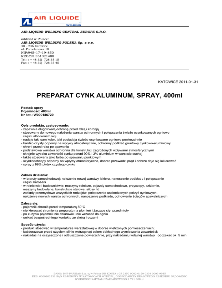 AIR LIQUIDE WELDING CENTRAL EUROPE S.R.O. oddział w Polsce: AIR LIQUIDE WELDING POLSKA Sp. z o.o. 40 – 246 Katowice ul. Porcelanowa 10 NIP:945–17–19–850 REGON :351321488 Tel : ( + 48 32) 728 35 15 Fax: ( + 48 32) 728 35 45 KATOWICE 2011-01-31 PREPARAT CYNK ALUMINUM, SPRAY, 400ml Postać: spray Pojemność: 400ml Nr kat.: W000186720 Opis produktu, zastosowanie: - zapewnia długotrwałą ochronę przed rdzą i korozją - stosowany do nowego nałożenia warstw ochronnych i polepszenia świeżo ocynkowanych ogniowo części albo konstrukcji - nadaje taki sam kolor, jaki posiadają świeżo ocynkowane ogniowo powierzchnie - bardzo czysty odporny na wpływy atmosferyczne, ochronny podkład gruntowy cynkowo-aluminiowy - chroni przed rdzą po spawaniu - podstawowa warstwa ochronna dla konstrukcji zagrożonych wpływami atmosferycznymi - skrajnie wysoka zawartość cynku ponad 90% i 3% aluminium w warstwie suchej - także stosowany jako farba po spawaniu punktowym - szybkoschnący odporny na wpływy atmosferyczne, dobrze przewodzi prąd i dobrze daje się lakierować - spray z 99% płytek czystego cynku Zakres działania: - w branży samochodowej: nałożenie nowej warstwy lakieru, nanoszenie podkładu i polepszanie części karoserii - w rolnictwie i budownictwie: maszyny rolnicze, pojazdy samochodowe, przyczepy, szklarnie, maszyny budowlane, konstrukcje stalowe, silosy itd - zakłady przemysłowe wszystkich rodzajów: polepszenie uszkodzonych pokryć cynkowych, nałożenie nowych warstw ochronnych, nanoszenie podkładu, odnowienie ściegów spawalniczych Zaleca się: - pojemnik chronić przed temperaturą 50°C - nie kierować strumienia preparatu na płomień i żarzące się przedmioty - po zużyciu pojemnik nie dziurawić i nie wrzucać do ognia - unikać bezpośredniego kontaktu ze skórą i oczami Sposób użycia: - produkt stosować w temperaturze warsztatowej w dobrze wietrzonych pomieszczeniach; - każdorazowo przed użyciem silnie wstrząsnąć celem dokładnego wymieszania zawartości; - nakładać na oczyszczone i odtłuszczone powierzchnie, przy nakładaniu kolejnej warstwy odczekać ok. 5 min BANK: BNP PARIBAS S.A. o/w Polsce NR KONTA : 05 2350 0002 0120 0334 0003 9985 KRS: 0000102331 SĄD REJONOWY W KATOWICACH WYDZIAŁ, GOSPODARCZY KRAJOWEGO REJESTRU SĄDOWEGO WYSOKOŚĆ KAPITAŁU ZAKŁADOWEGO 2 721 000 zł.