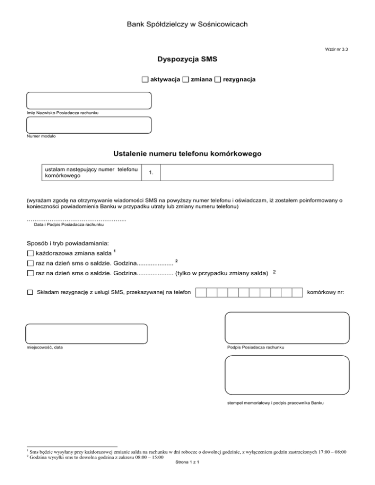 Bank Spółdzielczy w Sośnicowicach Dyspozycja SMS Ustalenie