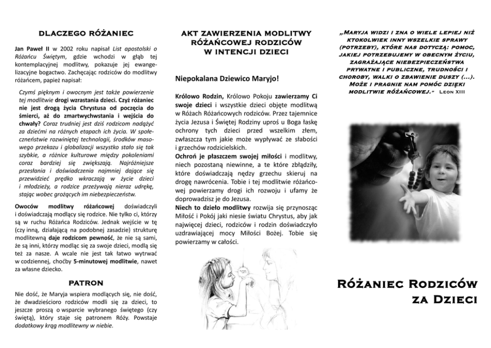 DLACZEGO RÓŻANIEC Jan Paweł II w 2002 roku napisał List apostolski o Różańcu Świętym, gdzie wchodzi w głąb tej kontemplacyjnej modlitwy, pokazuje jej ewangelizacyjne bogactwo. Zachęcając rodziców do modlitwy różańcem, papież napisał: Czymś pięknym i owocnym jest także powierzenie tej modlitwie drogi wzrastania dzieci. Czyż różaniec nie jest drogą życia Chrystusa od poczęcia do śmierci, aż do zmartwychwstania i wejścia do chwały? Coraz trudniej jest dziś rodzicom nadążyć za dziećmi na różnych etapach ich życia. W społeczneństwie rozwiniętej technologii, środków masowego przekazu i globalizacji wszystko stało się tak szybkie, a różnice kulturowe między pokoleniami coraz bardziej się zwiększają. Najróżniejsze przesłania i doświadczenia najmniej dające się przewidzieć prędko wkraczają w życie dzieci i młodzieży, a rodzice przeżywają nieraz udrękę, stając wobec grożących im niebezpieczeństw. Owoców modlitwy różańcowej doświadczyli i doświadczają modlący się rodzice. Nie tylko ci, którzy są w ruchu Różańca Rodziców. Jednak wejście w tę (czy inną, działającą na podobnej zasadzie) strukturę modlitewną daje rodzicom pewność, że nie są sami, że są inni, którzy modląc się za swoje dzieci, modlą się też za nasze. A wcale nie jest tak łatwo wytrwać w codziennej, choćby 5-minutowej modlitwie, nawet za własne dziecko. PATRON Nie dość, że Maryja wspiera modlących się, nie dość, że dwadzieścioro rodziców modli się za dzieci, to jeszcze proszą o wsparcie wybranego świętego (czy świętą), który staje się patronem Róży. Powstaje dodatkowy krąg modlitewny w niebie. AKT ZAWIERZENIA MODLITWY RÓŻAŃCOWEJ RODZICÓW W INTENCJI DZIECI Niepokalana Dziewico Maryjo! Królowo Rodzin, Królowo Pokoju zawierzamy Ci swoje dzieci i wszystkie dzieci objęte modlitwą w Różach Różańcowych rodziców. Przez tajemnice życia Jezusa i Świętej Rodziny uproś u Boga łaskę ochrony tych dzieci przed wszelkim złem, zwłaszcza tym jakie może wypływać ze słabości i grzechów rodzicielskich. Ochroń je płaszczem swojej miłości i modlitwy, niech pozostaną niewinne, a te które zbłądziły, które doświadczają nędzy grzechu skieruj na drogę nawrócenia. Tobie i tej modlitwie różańcowej powierzamy drogi ich rozwoju i ufamy że doprowadzisz je do Jezusa. Niech to dzieło modlitwy rozwija się przynosząc Miłość i Pokój jaki niesie światu Chrystus, aby jak najwięcej dzieci, rodziców i rodzin doświadczyło uzdrawiającej mocy Miłości Bożej. Tobie się powierzamy w całości. „Maryja widzi i zna o wiele lepiej niż ktokolwiek inny wszelkie sprawy (potrzeby), które nas dotyczą: pomoc, jakiej potrzebujemy w obecnym życiu, zagrażające niebezpieczeństwa prywatne i publiczne, trudności i choroby, walki o zbawienie duszy (...). Może i pragnie nam pomóc dzięki modlitwie różańcowej.” Leon XIII Różaniec Rodziców za Dzieci Zastanów się, może... w życiu Twojego dziecka dzieje się coś złego? Masz świadomość, że jakieś zło dotyka Twoich dzieci i nie potrafisz sobie z tym poradzić? chcesz, żeby Twoje dziecko było pod najlepszą opieką? Chcesz mu dać najpiękniejszy prezent i zabezpieczyć na całe życie? zdajesz sobie, że Twoje dziecko jest narażone na skutki Twoich grzechów? masz problemy z wychowaniem dzieci? oczekujesz narodzin dziecka, które chcesz już teraz otoczyć opieką? Twoje dzieci są już dorosłe, a Ty chciałbyś jakoś oddziaływać na nie? Ponad 33.000 rodziców modli się codziennie różańcem za swoje dzieci w specjalnie tworzonych grupach!!! Beata o modlitwie różańcowej rodziców usłyszała w czasie ogłoszeń w kościele. Na spotkanie organizacyjne szła z wahaniem, bo koła różańcowe kojarzyły się jej z wiekowymi, nobliwymi paniami. Zdziwiła się, kiedy zobaczyła na sali młode małżeństwa, kobiety w ciąży, sporo tatusiów. -Wstąpiłam do róży w czerwcu, zaraz po urodzeniu mojej córeczki. Wiem, że moje dziecko jest pod najlepszą opieką, której ja nie potrafiłabym zapewnić. Przekonanie, że wiele osób modli się za nie, daje mi wewnętrzny spokój. I są już pierwsze owoce: zniknęły lęki młodej mamy – śmieje się Anna. -W mojej róży jest ogromna rozpiętość dzieci, za które się modlimy: najmłodsze są jeszcze w łonie mamy, najstarsze ma 44 lata. Okazuje się, że modlitwa jest dziecku potrzebna w każdym wieku – mówi Barbara. Różaniec to nie jest tylko babcina modlitwa, jak niektórzy sądzą. Na naszych oczach odbywa się jego odrodzenie. ZASADA Zasada jest prosta. 20 osób codziennie (każdy w swoim miejscu, w dowolnym czasie) odmawia jedną (tylko jedną!) dziesiątkę różańca (Ojcze nasz, 10 razy Zdrowaś Maryjo, Chwała Ojcu) rozważając przy tym konkretną, przypisaną danej osobie, tajemnicę z życia Jezusa i Maryi. Osoba, która odmawia pierwszą tajemnicę radosną, odmawia również początkowe modlitwy różańca tj. Wierzę w Boga, Ojcze nasz, 3 razy Zdrowaś Maryjo (o wiarę, nadzieję i miłość) i Chwała Ojcu. Każdego pierwszego dnia miesiąca następuje zmiana tajemnic różańca. Jeśli zaczęłam od pierwszej tajemnicy radosnej – Zwiastowanie Maryi, to w następnym miesiącu będę odmawiała Nawiedzenie świętej Elżbiety, itd. 4 części różańca x 5 tajemnic w jednej części = 20 małych cząstek Wielkiej modlitwy Powstaje w ten sposób szczególna wspólnota, która pod swoją modlitewną opieką ma wszystkie dzieci rodziców, należących do niej. Odmawiając swoją cząstkę, rodzic ma świadomość, że cały różaniec codziennie zostaje odmówiony w intencji dzieci. JAK ZACZĄĆ Potrzebna jest decyzja – moja, Twoja decyzja. To jest początek. Inicjatorzy tego dzieła zachęcają do tworzenia grup różańcowych we własnych środowiskach, w rodzinie, wśród znajomych, we wspólnotach. Zacząć może jedna osoba. W oczekiwaniu na do