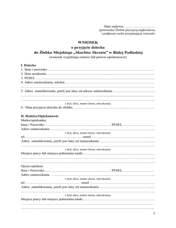 Data wpływu……………………… (potwierdza Żłobek pieczęcią nagłówkową i podpisem osoby przyjmującej wniosek) WNIOSEK o przyjęcie dziecka do Żłobka Miejskiego „Skarbiec Skrzata” w Białej Podlaskiej (wniosek wypełniają rodzice lub prawni opiekunowie) I. Dziecko 1. Imię i nazwisko ……………………………………………………………………………… 2. Data urodzenia ………………………………………………………………………………. 3. PESEL ……………………………………………………………………………………….. 4. Adres zamieszkania, telefon…………………………………………………………………. ………………………………………………………………………………………………….. 5. Adres zameldowania, jeżeli jest inny od adresu zamieszkania ……………………………... ………………………………………………………….............................................................. …………………………………………………………………………………………………... ( kod, ulica, numer domu, mieszkania) 6. Data przyjęcia dziecka do żłobka……………………………………………………………. II. Rodzice/Opiekunowie Matka/opiekunka: Imię i Nazwisko ……………………………………..………… PESEL……………………… Adres zamieszkania ………...…………………………………………………………………... ( kod, ulica, numer domu, mieszkania) tel. …………………………………...…… email ……………………………………………... Adres zameldowania, jeżeli jest inny od zamieszkania ………...…………………………....... …………………………………………………………………………………………………... ( kod, ulica, numer domu, mieszkania) Miejsce pracy lub miejsce pobierania nauki……………………………………………………. …………………………………………………………………………………………………... …………………………………………………………………………………………………... Ojciec/opiekun: Imię i Nazwisko ………………………………………..……… PESEL……………………… Adres zamieszkania ………..…………………………………………………………………... ( kod, ulica, numer domu, mieszkania) tel. ……………………………………… email ………………………………………………. Adres zameldowania, jeżeli jest inny od zamieszkania ………...…………………………....... …………………………………………………………………………………………………... ( kod, ulica, numer domu, mieszkania) Miejsce pracy lub miejsce pobierania nauki……………………………………………………. …………………………………………………………………………………………………. …………..…………………………………………………………………………………….... 1 III. Dane o stanie zdrowia: a) stan zdrowia dziecka ………………………………………………………………………… b) dziecko urodzone w porodzie: przedwczesnym, o czasie, po terminie uzyskało liczbę punktów wg Apgar ………………………………………………………………………….. c) stosowana dieta: - rodzaj mleka ………………………………………………………………………………….. - ograniczenia pokarmowe ……………………………………………………………………... - zmiany w żywieniu w czasie pobytu dziecka w żłobku (w załączniku zaświadczenie lekarskie)………………………………………………………………………………………. Data wydania Rodzaj diety Wskazania do stosowania diety zaświadczenia d) dziecko choruje przewlekle: NIE/TAK (rodzaj schorzenia) ………………………………… e) alergia: NIE/TAK (jakiego rodzaju) ………………………………………………………. f) urazy: NIE/TAK (jakie) ……………………………………………………………………… g) hospitalizacje, zabiegi chirurgiczne NIE/TAK (z jakiego powodu) …………….................... …………………………………………………………………………………………………... h) wady wrodzone, obciążenia dziedziczne: NIE/TAK (jakie) ……………………………… i) dziecko jest pod opieką specjalisty, np. lekarza, psychologa, fizjoterapeuty, logopedy, innych: NIE/TAK (rodzaj specjalisty, z jakiego powodu) ……………………………………... ………………………………………………………………………………………………….. …………………………………………………………………………………………………... j) reakcja dziecka na wysoka temperaturę: drgawki: NIE/TAK, inne: ………………………... k) rodzaj leku przeciwgorączkowego, który dziecko może otrzymać w Żłobku: ……………… …………………………………………………………………………………………………... l) dziecko jest szczepione zgodnie z kalendarzem szczepień: TAK/NIE, ponieważ ………….. …………………………………………………………………………………………………... ł) inne informacje dotyczące stanu zdrowia dziecka ………………………………………...… ………………………………………………………………………………………………….. …………………………………………………………