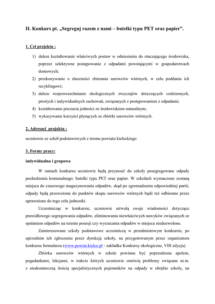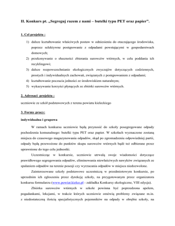 II. Konkurs pt. „Segreguj razem z nami – butelki typu PET oraz papier”. 1. Cel projektu : 1) dalsze kształtowanie właściwych postaw w odniesieniu do otaczającego środowiska, poprzez selektywne postępowanie z odpadami powstającymi w gospodarstwach domowych; 2) przekonywanie o słuszności zbierania surowców wtórnych, w celu poddania ich recyklingowi; 3) dalsze rozpowszechnianie ekologicznych zwyczajów dotyczących codziennych, prostych i indywidualnych zachowań, związanych z postępowaniem z odpadami; 4) kształtowanie poczucia jedności ze środowiskiem naturalnym; 5) wykazywanie korzyści płynących ze zbiórki surowców wtórnych. 2. Adresaci projektu : uczniowie ze szkół podstawowych z terenu powiatu kieleckiego 3. Formy pracy: indywidualna i grupowa W ramach konkursu uczniowie będą przynosić do szkoły posegregowane odpady pochodzenia komunalnego: butelki typu PET oraz papier. W szkołach wyznaczone zostaną miejsca do czasowego magazynowania odpadów, skąd po zgromadzeniu odpowiedniej partii, odpady będą przewożone do punktów skupu surowców wtórnych bądź też odbierane przez uprawnione do tego celu jednostki. Uczestnicząc w konkursie, uczniowie utrwalą swoje wiadomości dotyczące prawidłowego segregowania odpadów, eliminowania niewłaściwych nawyków związanych ze spalaniem odpadów na terenie posesji czy wyrzucania odpadów w miejsca niedozwolone. Zainteresowane szkoły podstawowe uczestniczą w przedmiotowym konkursie, po uprzednim ich zgłoszeniu przez dyrekcję szkoły, na przygotowanym przez organizatora konkursu formularzu (www.powiat.kielce.pl - zakładka Konkursy ekologiczne, VIII edycja). Zbiórka surowców wtórnych w szkole powinna być poprzedzona apelem, pogadankami, lekcjami, w trakcie których uczniowie omówią problemy związane m.in. z niedostateczną ilością specjalistycznych pojemników na odpady w obrębie szkoły, na 2 indywidualnych posesjach. Zastanowią się czy Gmina prawidłowo realizuje powierzone jej zadania z zakresu gospodarki odpadami. Nauczyciele po szczegółowo omówionych zasadach konkursu, wskazując miejsca w szkole gdzie uczniowie mogą przynosić papier oraz butelki plastikowe typu PET. W celu rozliczenia efektów konkursu należy dostarczyć do organizatora konkursu następujące dokumenty: 1) zestawienie zebranych ogółem przez uczniów, w ramach przedmiotowego konkursu, ilości surowców wtórnych (kg), 2) listę pięciorga uczniów (imię, nazwisko, klasa), którzy zebrali największą ilość (kg/szt.) surowców wtórnych w szkole, 3) oświadczenie, w którym podana będzie liczba uczniów uczestniczących w konkursie. Oświadczenie należy sporządzić na formularzu opracowanym przez organizatora konkursu (www.powiat.kielce.pl - zakładka Konkursy ekologiczne, VIII edycja), 4) uwierzytelnione kopie faktur VAT, rachunków lub innych dokumentów poświadczających ilości odpadów zebranych w ramach ww. konkursu, a odebranych przez uprawnioną firmę. 4. Terminy i zasady konkursu: 1) udział w konkursie wymaga wcześniejszego zgłoszenia, 2) ogłoszenie projektu – wrzesień 2011 roku, 3) zgłoszenie uczestnictwa – do dnia 4 listopada 2011 roku do Starostwa Powiatowego w Kielcach, Al. IX Wieków 3, 25–516 Kielce, fax. (041) 344-28-25, e-mail: [email protected], [email protected] 4) czas trwania konkursu – od 4 listopada 2011 roku do 30 marca 2012 roku, 5) wyłonienie laureatów i wręczenie nagród - do dnia 18 maja 2012 roku, 6) zbiórka tzw. surowców wtórnych możliwa jest w następujących grupach: papier i butelki plastikowe typu PET, 7) wybór trybu i sposobów organizacji zbiórki ww. grup surowców wtórnych należy do dyrekcji szkoły zgłaszającej udział w konkursie, 8) uczestnicy konkursu dostaną przydział zeszytów po przedłożeniu dokumentów określonych w pkt 3, stanowiących rozliczenie efektów konkursu. Generalną zasadą jest, aby każdy uczeń uczestniczący w konkursie otrzymał zeszyt lub zeszyty. Zasada przyznania zeszytu jest następująca: 1 zeszyt = 10 kg papieru = 2 kg butelek plastikowych typu PET przyjęto: 2 kg PET = 50 szt. butelek o poj. 1,5 l 3 9) potwierdzeniem odbioru przydziału zeszytów będzie podpis i pieczęć dyrektora szkoły, na opracowanym przez organizatora konkursu formularzu. 5. Komisja konkursowa Oceny efektów konkursu i wytypowania laureatów dokona komisja konkursowa powołana przez Starostę Kieleckiego. Decydującym przy wyborze laureatów – szkół, będzie ilość zebranych przez daną szkołę odpadów (kg). Przy wyborze laureatów indywidualnych – ilość zebranych przez danego ucznia surowców wtórnych (kg). 6. Nagrody dla szkół 1) zbiorowe – dla szkół podstawowych, w których uczniowie zbiorą największą ilość surowców wtórnych (papier, butelki typu PET pochodzenia komunalnego) oraz dostarczą wymagane dokumenty potwierdzające wykonanie zadania. I miejsce – materiały edukacyjne o łącznej wartości nagród ok. 2 500,00 zł, II miejsce – materiały edukacyjne o łącznej wartości nagród ok. 2 000,00 zł, III miejsce – materiały edukacyjne o łącznej wartości nagród ok. 1 500,00 zł. 2) wyróżnienia indywidualne dla siedmiu najlepszych zbieraczy surowców: sprzęt sportowy o wartości: 1 miejsce – ok. 250,00 zł 2 miejsce – ok. 200,00 zł 3 miejsce – ok. 150,00 zł 4 – 7 miejsce – po ok. 100,00 zł za każde miejsce 3) każdy uczestnik konkursu otrzyma zeszyt 60 kartkowy z marginesem i nadrukiem na okładce o tematyce ekologicznej, promującej zbiórkę surowców wtórnych. Zasada przyznania zeszytu: 1 zeszyt = 10,0 kg papieru = 2,0 kg butelek plastikowych typu PET przyjęto: 2 kg PET = 50 szt. butelek o pojemności 1,5 l 7. Łączny koszt nagród - około 18 200,00 zł nagrody zbiorowe i wyróżnienia - około 7 000,00 zł druk zeszytów 8 000 sztuk x ok. 1,40 zł = około 11 200,00 zł 4 8. Uwagi dodatkowe 1. Organizator zastrzega sobie prawo odwołania projektu gdy liczba uczestnik