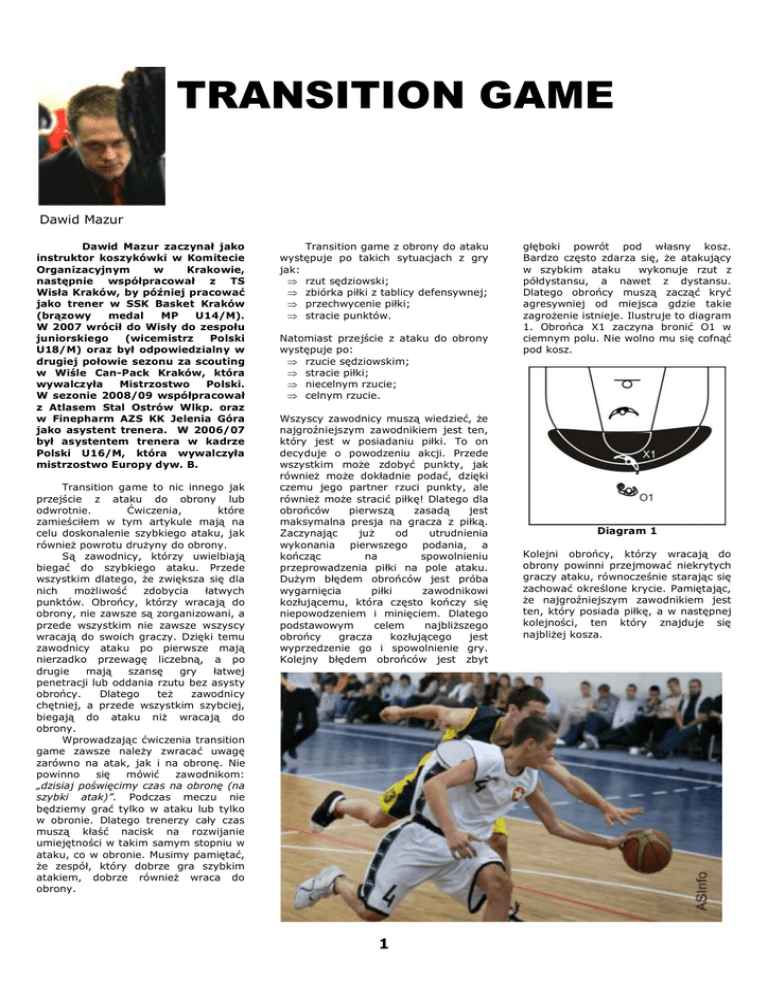 TRANSITION GAME Dawid Mazur Dawid Mazur zaczynał jako instruktor koszykówki w Komitecie Organizacyjnym w Krakowie, następnie współpracował z TS Wisła Kraków, by później pracować jako trener w SSK Basket Kraków (brązowy medal MP U14/M). W 2007 wrócił do Wisły do zespołu juniorskiego (wicemistrz Polski U18/M) oraz był odpowiedzialny w drugiej połowie sezonu za scouting w Wiśle Can-Pack Kraków, która wywalczyła Mistrzostwo Polski. W sezonie 2008/09 współpracował z Atlasem Stal Ostrów Wlkp. oraz w Finepharm AZS KK Jelenia Góra jako asystent trenera. W 2006/07 był asystentem trenera w kadrze Polski U16/M, która wywalczyła mistrzostwo Europy dyw. B. Transition game to nic innego jak przejście z ataku do obrony lub odwrotnie. Ćwiczenia, które zamieściłem w tym artykule mają na celu doskonalenie szybkiego ataku, jak również powrotu drużyny do obrony. Są zawodnicy, którzy uwielbiają biegać do szybkiego ataku. Przede wszystkim dlatego, że zwiększa się dla nich możliwość zdobycia łatwych punktów. Obrońcy, którzy wracają do obrony, nie zawsze są zorganizowani, a przede wszystkim nie zawsze wszyscy wracają do swoich graczy. Dzięki temu zawodnicy ataku po pierwsze mają nierzadko przewagę liczebną, a po drugie mają szansę gry łatwej penetracji lub oddania rzutu bez asysty obrońcy. Dlatego też zawodnicy chętniej, a przede wszystkim szybciej, biegają do ataku niż wracają do obrony. Wprowadzając ćwiczenia transition game zawsze należy zwracać uwagę zarówno na atak, jak i na obronę. Nie powinno się mówić zawodnikom: „dzisiaj poświęcimy czas na obronę (na szybki atak)”. Podczas meczu nie będziemy grać tylko w ataku lub tylko w obronie. Dlatego trenerzy cały czas muszą kłaść nacisk na rozwijanie umiejętności w takim samym stopniu w ataku, co w obronie. Musimy pamiętać, że zespół, który dobrze gra szybkim atakiem, dobrze również wraca do obrony. Transition game z obrony do ataku występuje po takich sytuacjach z gry jak: ⇒ rzut sędziowski; ⇒ zbiórka piłki z tablicy defensywnej; ⇒ przechwycenie piłki; ⇒ stracie punktów. Natomiast przejście z ataku do obrony występuje po: ⇒ rzucie sędziowskim; ⇒ stracie piłki; ⇒ niecelnym rzucie; ⇒ celnym rzucie. Wszyscy zawodnicy muszą wiedzieć, że najgroźniejszym zawodnikiem jest ten, który jest w posiadaniu piłki. To on decyduje o powodzeniu akcji. Przede wszystkim może zdobyć punkty, jak również może dokładnie podać, dzięki czemu jego partner rzuci punkty, ale również może stracić piłkę! Dlatego dla obrońców pierwszą zasadą jest maksymalna presja na gracza z piłką. Zaczynając już od utrudnienia wykonania pierwszego podania, a kończąc na spowolnieniu przeprowadzenia piłki na pole ataku. Dużym błędem obrońców jest próba wygarnięcia piłki zawodnikowi kozłującemu, która często kończy się niepowodzeniem i minięciem. Dlatego podstawowym celem najbliższego obrońcy gracza kozłującego jest wyprzedzenie go i spowolnienie gry. Kolejny błędem obrońców jest zbyt 1 głęboki powrót pod własny kosz. Bardzo często zdarza się, że atakujący w szybkim ataku wykonuje rzut z półdystansu, a nawet z dystansu. Dlatego obrońcy muszą zacząć kryć agresywniej od miejsca gdzie takie zagrożenie istnieje. Ilustruje to diagram 1. Obrońca X1 zaczyna bronić O1 w ciemnym polu. Nie wolno mu się cofnąć pod kosz. Diagram 1 Kolejni obrońcy, którzy wracają do obrony powinni przejmować niekrytych graczy ataku, równocześnie starając się zachować określone krycie. Pamiętając, że najgroźniejszym zawodnikiem jest ten, który posiada piłkę, a w następnej kolejności, ten który znajduje się najbliżej kosza. Uwaga: Aby uniknąć fauli, można wprowadzić zasadę faul – 1 punkt dla zawodnika/zespołu. atakujący na linii końcowej (diagram 4). Trener podaje piłkę do jednego z zawodników ataku (tutaj do O1). O1, O2 i O3 atakują przeciwko X2 i X3. X1 w tym czasie musi dotkać linii końcowej i jak najszybciej wrócić do obrony. Gra toczy się do celnego kosza. Drużyna, która zdobędzie punkty dalej jest w posiadaniu piłki. Rywalizacja: Zdobyty kosz to 2 lub 3 punkty. Ćwiczenie nr 1 Ćwiczenie nr 4 Opis: O1 z piłką, obok niego stoi obrońca X1 (diagram 2). O1 staruje kozłując wzdłuż linii bocznej. Celem X1 jest wyprzedzenie O1 i spowolnienie jego kozłowania. Rywalizacja: X1 otrzymuje 1 punkt, gdy wyprzedzi rywala i zatrzyma jego kozłowanie. Opis: Zawodnicy ćwiczą w trójkach. O1 i X2 początkowo grają w ataku przeciwko X1 (diagram 5). Gra 2x1 toczy się, aż gracze ataku przejdą z piłką na pole ataku. W tym momencie jeden z zawodników podaje do trenera i przebiega na drugą stronę boiska. Trener podaje z powrotem do gracza, od którego otrzymał piłkę (tutaj O1). O1 teraz gra na przeciwny kosz 1x2 przeciwko X1 i X2. Gra toczy się do celnego kosza lub do zbiórki defensywnej. Obrońca po zbiórce podaje do następnej dwójki, która jest w ataku. Rywalizacja: Zdobyty kosz liczy się za 2 lub 3 punkty. Ćwiczenie nr 5 Poniżej prezentuję ćwiczenia mające na celu doskonalenie transition game z wykorzystaniem elementów rywalizacji. Jakkolwiek należy pamiętać, że wszystkie zasady można modyfikować w zależności od tego na jaki element gry chcemy położyć szczególny nacisk. Ćwiczenie nr 2 Opis: Zawodnicy rywalizują w dwójkach, stojąc jak na diagramie 3. Trener podaje piłkę do O1 (lub O2). Obrońca gracza, który nie otrzymał piłki dotyka linii końcowej i wraca do obrony. W tym samym czasie atakujący O1 i O2 grają przeciwko X1. Gra toczy się do celnego kosza. Drużyna, która zdobędzie punkty dalej jest w posiadaniu piłki. Rywalizacja: Zdobyty kosz to 2 lub 3 punkty. Ćwiczenie nr 3 Opis: Zawodnicy mogą ćwiczyć 3x3, 4x4 lub 5x5. Obrońcy ustawieni są na przedłużeniu linii rzutów wolnych, zaś Diagram 2 Rywalizacja: Zdobyty kosz liczy się za 2 lub 3 