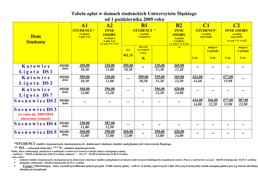 Tabela opłat w domach studenckich Uniwersytetu Śląskiego od 1 października 2009 roku A1 A2 B1 B2 C1 C2 STUDENCI * INNE OSOBY STUDENCI * INNE OSOBY STUDENCI* INNE OSOBY za pokój typu studio za pokój typu studio za miejsce w pok. 2-os. Dom Studenta za pokój 1-oosobowy za miejsce w pok. 2-os. (w tym 7% VAT) ** WL/N za pokój 1-osobowy ( w tym 7 % VAT) ,0, dla osób na wózkach *** N (w tym 7 % VAT) miejsce w pokoju 1-os. miejsce w pokoju 2-os 1-os. 2-os. miesiąc doba 309,00 10,30 330,00 11,00 309,00 10,30 _ 339,00 11,30 369,00 12,30 _ _ _ _ miesiąc doba 309,00 10,30 330,00 11,00 _ 309,00 10,30 339,00 11,30 369,00 12,30 432,00 14,40 _ 477,00 15,90 _ miesiąc doba 360,00 12,00 396,00 13,20 _ _ 396,00 13,20 420,00 14,00 _ _ _ _ miesiąc doba _ _ _ _ _ _ 444,00 14,80 366,00 12,20 477,00 15,90 387,00 12,90 S o s n o w i e c DS 4 miesiąc doba _ _ _ _ _ _ _ miesiąc doba 387,00 12,90 390,00 13,00 _ S o s n o w i e c DS 5 330,00 11,00 360,00 12,00 360,00 12,00 _ 390,00 13,00 420,00 14,00 _ _ _ _ Katowice L i g o t a DS 1 Katowice L i g o t a DS 2 Katowice L i g o t a DS 7 S o s n o w i e c DS 2 S o s n o w i e c DS 3 (w roku ak. 2009/2010 nieczynny-remont) *STUDENCI studiów stacjonarnych, niestacjonarnych , doktoranci i słuchacze studiów podyplomowych Uniwersytetu Śląskiego. ** WL – wskazanie lekarskie; *** N - studenci niepełnosprawni; Osoby, które zamieszkują pojedynczo w pokojach 2-osobowych wnoszą za drugie miejsce następującą opłatę: - studenci* - 150,00 zł miesięcznie (5,00 zł za dobę), studenci * – WL,/N – 102,00 zł miesięcznie (3,40 zł za dobę), - inne osoby: studenci studiów stacjonarnych, niestacjonarnych, doktoranci i słuchacze studiów podyplomowych innych szkół wyższych działających na podstawie ustawy Prawo o szkolnictwie wyższym - 160,50 zł miesięcznie (5,35 zł za dobę) niebędący studentami - 201,00 zł miesięcznie (6,70 zł za dobę) Uwaga ! Odwiedzający, który uzyskali przedłużenie pobytu po godz. 23.00 wnoszą opłatę – 6,50 zł za każdą z pierwszych 3 dób. Powyżej trzeciej doby każda następna płatna jest wg stawek określony odrębnymi przepisami.