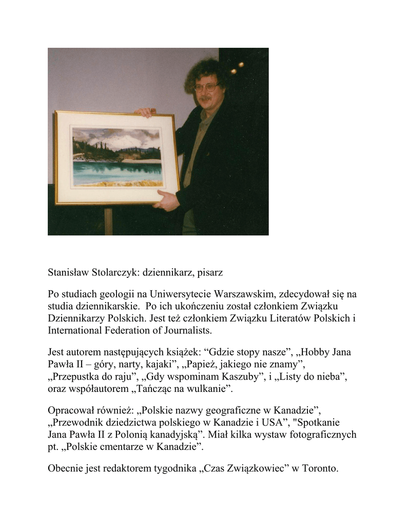 Stanisław Stolarczyk: dziennikarz, pisarz Po studiach geologii na Uniwersytecie Warszawskim, zdecydował się na studia dziennikarskie. Po ich ukończeniu został członkiem Związku Dziennikarzy Polskich. Jest też członkiem Związku Literatów Polskich i International Federation of Journalists. Jest autorem następujących książek: “Gdzie stopy nasze”, „Hobby Jana Pawła II – góry, narty, kajaki”, „Papież, jakiego nie znamy”, „Przepustka do raju”, „Gdy wspominam Kaszuby”, i „Listy do nieba”, oraz współautorem „Tańcząc na wulkanie”. Opracował również: „Polskie nazwy geograficzne w Kanadzie”, „Przewodnik dziedzictwa polskiego w Kanadzie i USA”, "Spotkanie Jana Pawła II z Polonią kanadyjską”. Miał kilka wystaw fotograficznych pt. „Polskie cmentarze w Kanadzie”. Obecnie jest redaktorem tygodnika „Czas Związkowiec” w Toronto.