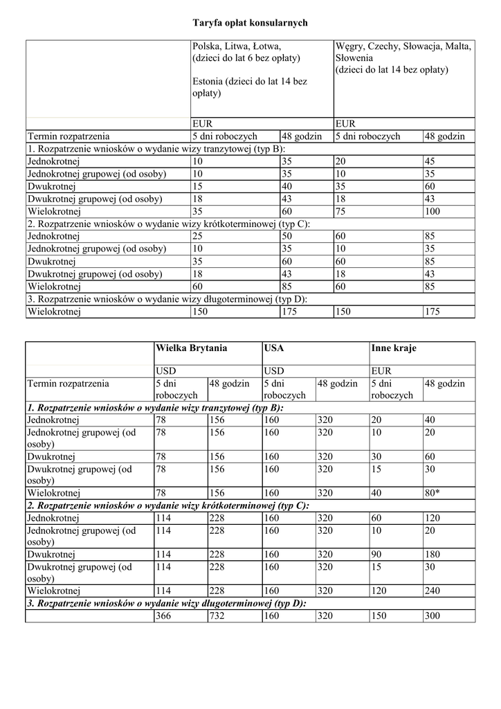 Taryfa opłat konsularnych Polska, Litwa, Łotwa, (dzieci do lat 6 bez opłaty) Węgry, Czechy, Słowacja, Malta, Słowenia (dzieci do lat 14 bez opłaty) Estonia (dzieci do lat 14 bez opłaty) EUR Termin rozpatrzenia 5 dni roboczych 48 godzin 1. Rozpatrzenie wniosków o wydanie wizy tranzytowej (typ B): Jednokrotnej 10 35 Jednokrotnej grupowej (od osoby) 10 35 Dwukrotnej 15 40 Dwukrotnej grupowej (od osoby) 18 43 Wielokrotnej 35 60 2. Rozpatrzenie wniosków o wydanie wizy krótkoterminowej (typ C): Jednokrotnej 25 50 Jednokrotnej grupowej (od osoby) 10 35 Dwukrotnej 35 60 Dwukrotnej grupowej (od osoby) 18 43 Wielokrotnej 60 85 3. Rozpatrzenie wniosków o wydanie wizy długoterminowej (typ D): Wielokrotnej 150 175 Wielka Brytania 48 godzin 20 10 35 18 75 45 35 60 43 100 60 10 60 18 60 85 35 85 43 85 150 175 USA USD USD 5 dni 48 godzin 5 dni roboczych roboczych 1. Rozpatrzenie wniosków o wydanie wizy tranzytowej (typ B): Jednokrotnej 78 156 160 Jednokrotnej grupowej (od 78 156 160 osoby) Dwukrotnej 78 156 160 Dwukrotnej grupowej (od 78 156 160 osoby) Wielokrotnej 78 156 160 2. Rozpatrzenie wniosków o wydanie wizy krótkoterminowej (typ C): Jednokrotnej 114 228 160 Jednokrotnej grupowej (od 114 228 160 osoby) Dwukrotnej 114 228 160 Dwukrotnej grupowej (od 114 228 160 osoby) Wielokrotnej 114 228 160 3. Rozpatrzenie wniosków o wydanie wizy długoterminowej (typ D): 366 732 160 Termin rozpatrzenia EUR 5 dni roboczych Inne kraje 48 godzin EUR 5 dni roboczych 48 godzin 320 320 20 10 40 20 320 320 30 15 60 30 320 40 80* 320 320 60 10 120 20 320 320 90 15 180 30 320 120 240 320 150 300