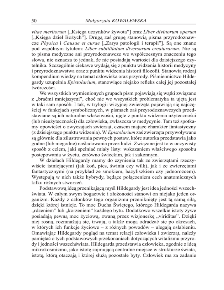 50 Małgorzata KOWALEWSKA vitae meritorum [„Księga uczynków żywota”] oraz Liber divinorum operum [„Księga dzieł Bożych”]. Drugą zaś grupę stanowią pisma przyrodoznawcze Physica i Causae et curae [„Zarys patologii i terapii”]. Są one znane pod wspólnym tytułem: Liber subtilitatum diversarum creaturarum. Nie są to pisma medyczne ani przyrodoznawcze we współczesnym znaczeniu tego słowa, nie oznacza to jednak, że nie posiadają wartości dla dzisiejszego czytelnika. Szczególnie ciekawe wydają się z punktu widzenia historii medycyny i przyrodoznawstwa oraz z punktu widzenia historii filozofii. Stanowią rodzaj kompendium wiedzy na temat człowieka oraz przyrody. Piśmiennictwo Hildegardy uzupełnia Epistolarium, stanowiące niejako refleks całej jej pozostałej twórczości. We wszystkich wymienionych grupach pism pojawiają się wątki związane z „braćmi mniejszymi”, choć nie we wszystkich problematyka ta ujęta jest w taki sam sposób. I tak, w trylogii wizyjnej zwierzęta pojawiają się najczęściej w funkcjach symbolicznych, w pismach zaś przyrodoznawczych przedstawiane są ich naturalne właściwości, ujęte z punktu widzenia użyteczności (lub nieużyteczności) dla człowieka, zwłaszcza w medycynie. Tam też spotkamy opowieści o zwyczajach zwierząt, czasem mające charakter fantastyczny (z dzisiejszego punktu widzenia). W Epistolarium zaś zwierzęta przywoływane są głównie dla zilustrowania pewnych postaw, które autorka przedstawia jako godne (lub niegodne) naśladowania przez ludzi. Związane jest to w oczywisty sposób z celem, jaki spełniać miały listy: wskazaniem właściwego sposobu postępowania w życiu, zarówno świeckim, jak i zakonnym. W dziełach Hildegardy mamy do czynienia tak ze zwierzętami rzeczywiście istniejącymi (jak koń, pies, świnia czy wilk), jak i ze zwierzętami fantastycznymi (na przykład ze smokiem, bazyliszkiem czy jednorożcem). Występują w nich także hybrydy, będące połączeniem cech anatomicznych kilku różnych stworzeń. Podstawową ideą przenikającą myśl Hildegardy jest idea jedności wszechświata. W całym swym bogactwie i złożoności stanowi on niejako jeden organizm. Każdy z członków tego organizmu przeniknięty jest tą samą siłą, dzięki której istnieje. To moc Ducha Świętego, którego Hildegarda nazywa „rdzeniem” lub „korzeniem” każdego bytu. Dodatkowo wszelkie istoty żywe posiadają pewną moc życiową, zwaną przez wizjonerkę „viriditas”. Dzięki niej rosną, rozmnażają się, trwają, a także mogą odradzać się po okresach, w których ich funkcje życiowe – z różnych powodów – ulegają osłabieniu. Omawiając Hildegardy pogląd na temat relacji człowieka i zwierząt, należy pamiętać o tych podstawowych przekonaniach dotyczących witalizmu przyrody i jedności wszechświata. Hildegarda przedstawia człowieka, zgodnie z ideą mikrokosmizmu, jako istotę zajmującą centralne miejsce w strukturze świata, istotę, którą otaczają i której służą pozostałe byty. Człowiek ma za zadanie Hildegarda z Bingen o człowieku i jego „braciach mniejszych” 51 kierować nimi i przewodniczyć im. Podlegając Bogu, panuje nad istotami od siebie niższymi, stanowi dla nich znak – reprezentuje potęgę Boga. Istoty te kochają człowieka i wzajemnie są przez niego kochane, bo chociaż ma on nimi kierować, to przecież także ich potrzebuje. Razem tworzą organiczną całość i jedność. „Człowiek jest niczym światło dla innych zwierząt przebywających na ziemi, które bardzo często przybywają do niego i które darzą go wielką miłością. Także i on pilnie poszukuje tych zwierząt, które kocha”20. „I tak jak człowiek nie byłby człowiekiem, gdyby nie było w nim układu połączonych żył, tak i nie mógłby żyć bez pozostałych stworzeń”21. Człowiek potrzebuje pozostałych stworzeń także i po to, by móc wypełniać swoje własne zadanie, jakim jest działanie w świecie, by stać się opus Dei: „Stworzenie jest chwałą Boga, a człowiek jest Jego dziełem. Jeśliby jednak stworzenia nie istniały, człowiek nie mógłby działać”22. Ważne jest też i to, że część władz, którymi człowiek dysponuje, podziela on ze zwierzętami. Władze te to zdolność odczuwania, płodzenia i rodzenia23. Całe stworzenie – przyroda nieożywiona, zwierzęta oraz człowiek – istnieje po to, by głosić chwałę Stwórcy: „Ogień ma płomień, który jest chwałą Boga, a wiatr płomień porusza, co jest chwałą Boga. A w dźwięku jest wszak słowo, zatem jest on chwałą Boga. A ponadto słowo słyszymy, co także jest chwałą Boga. Tak więc wszelkie stworzenie jest chwałą Boga”24. Hildegarda wielokrotnie podkreśla, że nie tylko istnienie człowieka, ale istnienie zwierząt wszystkich gatunków (a właściwie wszystkich stworzeń) jest wynikiem woli Bożej. Uważa także, że wszystkie stworzenia są światłami – odblaskiem światła transcendentnego, jakim jest Bóg25. Hildegardis Bingensis Liber divinorum operum, w: Corpus Christianorum Continuatio Mediaevalis, t. 92, red. A. Delorez, P. Dronke, Brepols, Turnhout 1996, s. 251 (tłumaczenie fragmentów dzieł Hildegardy na podstawie tekstów łacińskich – M.K.). 21 Tamże, t. 92, s. 257. Por. M. K o w a l e w s k a, Bóg – Kosmos – Człowiek w twórczości Hildegardy z Bingen, Wydawnictwo UMCS, Lublin 2007, s. 171. 22 Hildegardis Bingensis Epistolarium, 77, w: Corpus Christianorum Continuatio Mediaevalis, t. 91-91A, red. L. Van Acker, Turnhout 1991, 1993, s. 168. 23 Por. Hildegardis Bingensis Scivias, w: Corpus Christianorum Continuatio Mediaevalis, t. 43-43A, red. A. Fuhrkotter, A. Carlevaris, Turnhout 1996, s. 113. Por. K o w a l e w s k a, dz. cyt., s. 174. 24 Hildegardis Bingensis Epistolarium, 77, s. 168. Por. K o w a l e w s k a, dz. cyt., s. 154. 25 Por. tamże, s. 171. 20