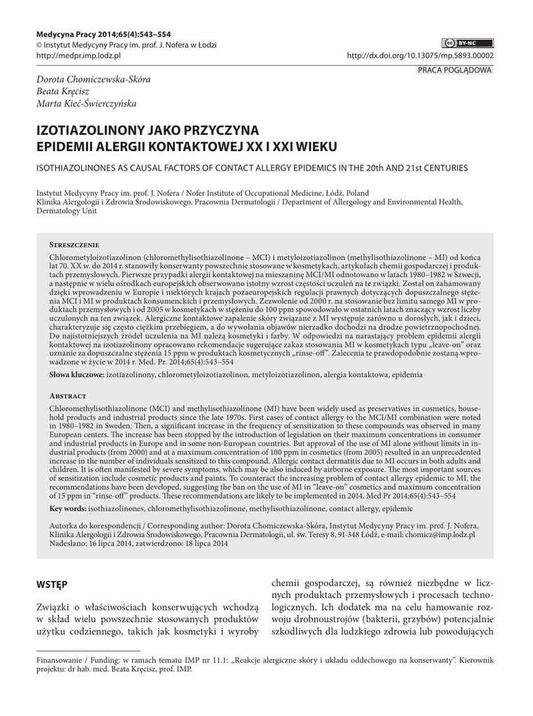Medycyna Pracy 2014;65(4):543–554 © Instytut Medycyny Pracy im. prof. J. Nofera w Łodzi http://medpr.imp.lodz.pl http://dx.doi.org/10.13075/mp.5893.00002 PRACA POGLĄDOWA Dorota Chomiczewska-Skóra Beata Kręcisz Marta Kieć-Świerczyńska IZOTIAZOLINONY JAKO PRZYCZYNA EPIDEMII ALERGII KONTAKTOWEJ XX I XXI WIEKU ISOTHIAZOLINONES AS CAUSAL FACTORS OF CONTACT ALLERGY EPIDEMICS IN THE 20th AND 21st CENTURIES Instytut Medycyny Pracy im. prof. J. Nofera / Nofer Institute of Occupational Medicine, Łódź, Poland Klinika Alergologii i Zdrowia Środowiskowego, Pracownia Dermatologii / Department of Allergology and Environmental Health, Dermatology Unit Streszczenie Chlorometyloizotiazolinon (chloromethylisothiazolinone – MCI) i metyloizotiazolinon (methylisothiazolinone – MI) od końca lat 70. XX w. do 2014 r. stanowiły konserwanty powszechnie stosowane w kosmetykach, artykułach chemii gospodarczej i produktach przemysłowych. Pierwsze przypadki alergii kontaktowej na mieszaninę MCI/MI odnotowano w latach 1980–1982 w Szwecji, a następnie w wielu ośrodkach europejskich obserwowano istotny wzrost częstości uczuleń na te związki. Został on zahamowany dzięki wprowadzeniu w Europie i niektórych krajach pozaeuropejskich regulacji prawnych dotyczących dopuszczalnego stężenia MCI i MI w produktach konsumenckich i przemysłowych. Zezwolenie od 2000 r. na stosowanie bez limitu samego MI w produktach przemysłowych i od 2005 w kosmetykach w stężeniu do 100 ppm spowodowało w ostatnich latach znaczący wzrost liczby uczulonych na ten związek. Alergiczne kontaktowe zapalenie skóry związane z MI występuje zarówno u dorosłych, jak i dzieci, charakteryzuje się często ciężkim przebiegiem, a do wywołania objawów nierzadko dochodzi na drodze powietrznopochodnej. Do najistotniejszych źródeł uczulenia na MI należą kosmetyki i farby. W odpowiedzi na narastający problem epidemii alergii kontaktowej na izotiazolinony opracowano rekomendacje sugerujące zakaz stosowania MI w kosmetykach typu „leave-on” oraz uznanie za dopuszczalne stężenia 15 ppm w produktach kosmetycznych „rinse-off”. Zalecenia te prawdopodobnie zostaną wprowadzone w życie w 2014 r. Med. Pr. 2014;65(4):543–554 Słowa kluczowe: izotiazolinony, chlorometyloizotiazolinon, metyloizotiazolinon, alergia kontaktowa, epidemia Abstract Chloromethylisothiazolinone (MCI) and methylisothiazolinone (MI) have been widely used as preservatives in cosmetics, household products and industrial products since the late 1970s. First cases of contact allergy to the MCI/MI combination were noted in 1980–1982 in Sweden. Then, a significant increase in the frequency of sensitization to these compounds was observed in many European centers. The increase has been stopped by the introduction of legislation on their maximum concentrations in consumer and industrial products in Europe and in some non-European countries. But approval of the use of MI alone without limits in industrial products (from 2000) and at a maximum concentration of 100 ppm in cosmetics (from 2005) resulted in an unprecedented increase in the number of individuals sensitized to this compound. Allergic contact dermatitis due to MI occurs in both adults and children. It is often manifested by severe symptoms, which may be also induced by airborne exposure. The most important sources of sensitization include cosmetic products and paints. To counteract the increasing problem of contact allergy epidemic to MI, the recommendations have been developed, suggesting the ban on the use of MI in “leave-on” cosmetics and maximum concentration of 15 ppm in “rinse-off” products. These recommendations are likely to be implemented in 2014. Med Pr 2014;65(4):543–554 Key words: isothiazolinones, chloromethylisothiazolinone, methylisothiazolinone, contact allergy, epidemic Autorka do korespondencji / Corresponding author: Dorota Chomiczewska-Skóra, Instytut Medycyny Pracy im. prof. J. Nofera, Klinika Alergologii i Zdrowia Środowiskowego, Pracownia Dermatologii, ul. św. Teresy 8, 91-348 Łódź, e-mail: [email protected] Nadesłano: 16 lipca 2014, zatwierdzono: 18 lipca 2014 WSTĘP Związki o właściwościach konserwujących wchodzą w skład wielu powszechnie stosowanych produktów użytku codziennego, takich jak kosmetyki i wyroby chemii gospodarczej, są również niezbędne w licznych produktach przemysłowych i procesach technologicznych. Ich dodatek ma na celu hamowanie rozwoju drobnoustrojów (bakterii, grzybów) potencjalnie szkodliwych dla ludzkiego zdrowia lub powodujących Finansowanie / Funding: w ramach tematu IMP nr 11.1: „Reakcje alergiczne skóry i układu oddechowego na konserwanty”. Kierownik projektu: dr hab. med. Beata Kręcisz, prof. IMP. 544 D. Chomiczewska-Skóra i wsp. Nr 4 szybkie niszczenie (psucie) produktu. Niektóre związki stosowane jako konserwanty wskutek bezpośredniego lub powietrznopochodnego kontaktu ze skórą mogą jednak wywoływać uczulenie w mechanizmie nadwrażliwości typu IV, stając się przyczyną alergicznego kontaktowego zapalenia skóry (AKZS). W ostatnich dekadach co najmniej kilka razy obserwowano gwałtowny lub stopniowy wzrost liczby przypadków AKZS spowodowanych konserwantami nowo wprowadzanymi do obrotu (1). Zjawisko określane mianem epidemii alergii kontaktowej dotyczyło np. formaldehydu w latach 50. i 60. XX w., mieszaniny chlorometyloizotiazolinonu i metyloizotiazolinonu w latach 80. oraz dibromoglutarylonitrylu będącego składnikiem biocydu Euksyl K 400 w latach 90. (2,3). Badania częstości uczuleń na różne alergeny kontaktowe od kilku lat jednoznacznie wskazują na wzrost znaczenia nadwrażliwości na metyloizotiazolinon, wywołujący AKZS w różnych grupach wiekowych, w tym u małych dzieci, często o ciężkim przebiegu i etiologii zawodowej (1,3). Celem niniejszej pracy jest przedstawienie skali problemu uczulenia na chlorometyloizotiazolinon i metyloizotiazolinon w przeszłoś