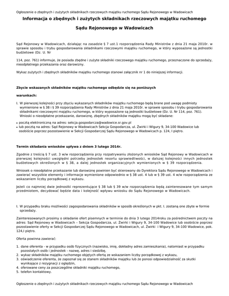 Ogłoszenie o zbędnych i zużytych składnikach rzeczowych majątku ruchomego Sądu Rejonowego w Wadowicach Informacja o zbędnych i zużytych składnikach rzeczowych majątku ruchomego Sądu Rejonowego w Wadowicach Sąd Rejonowy w Wadowicach, działając na zasadzie § 7 ust.1 rozporządzenia Rady Ministrów z dnia 21 maja 2010r. w sprawie sposobu i trybu gospodarowania składnikami rzeczowymi majątku ruchomego, w który wyposażone są jednostki budżetowe (Dz. U. Nr 114, poz. 761) informuje, że posiada zbędne i zużyte składniki rzeczowego majątku ruchomego, przeznaczone do sprzedaży, nieodpłatnego przekazania oraz darowizny. Wykaz zużytych i zbędnych składników majątku ruchomego stanowi załącznik nr 1 do niniejszej informacji. Zbycie wskazanych składników majątku ruchomego odbędzie się na poniższych warunkach: I. W pierwszej kolejności przy zbyciu wykazanych składników majątku ruchomego będą brane pod uwagę podmioty wymienione w § 38 i § 39 rozporządzenia Rady Ministrów z dnia 21 maja 2010r. w sprawie sposobu i trybu gospodarowania składnikami rzeczowymi majątku ruchomego, w który wyposażone są jednostki budżetowe (Dz. U. Nr 114, poz. 761). Wnioski o nieodpłatne przekazanie, darowiznę, zbędnych składników majątku mogą być składane: ● ● pocztą elektroniczną na adres: [email protected] lub pocztą na adres: Sąd Rejonowy w Wadowicach Sekcja Gospodarcza, ul. Żwirki i Wigury 9, 34-100 Wadowice lub osobiście poprzez pozostawienie w Sekcji Gospodarczej Sądu Rejonowego w Wadowicach p. 124, I piętro. Termin składania wniosków upływa z dniem 3 lutego 2014r. Zgodnie z treścią § 7 ust. 3 w/w rozporządzenia przy rozpatrywaniu złożonych wniosków Sąd Rejonowy w Wadowicach w pierwszej kolejności uwzględni potrzeby jednostek resortu sprawiedliwości, w dalszej kolejności innych jednostek budżetowych określonych w § 38, a dalej jednostek organizacyjnych wymienionych w § 39 rozporządzenia. Wniosek o nieodpłatne przekazanie lub darowiznę powinien być skierowany do Dyrektora Sądu Rejonowego w Wadowicach i zawierać wszystkie elementy i informacje wymienione odpowiednio w § 38 ust. 4 lub w § 39 ust. 4 w/w rozporządzenia ze wskazaniem liczby porządkowej z wykazu. Jeżeli co najmniej dwie jednostki reprezentujące § 38 lub § 39 w/w rozporządzenia będą zainteresowane tym samym przedmiotem, decydować będzie data i kolejność wpływu wniosku do Sądu Rejonowego w Wadowicach. I. W przypadku braku możliwości zagospodarowania składników w sposób określonych w pkt. I. zostaną one zbyte w formie sprzedaży. Zainteresowanych prosimy o składanie ofert pisemnych w terminie do dnia 3 lutego 2014roku za pośrednictwem poczty na adres: Sąd Rejonowy w Wadowicach – Sekcja Gospodarcza, ul. Żwirki i Wigury 9, 34-100 Wadowice lub osobiście poprzez pozostawienie oferty w Sekcji Gospodarczej Sądu Rejonowego w Wadowicach, ul. Żwirki i Wigury 9, 34-100 Wadowice, pok. 124,I piętro. Oferta powinna zawierać: 1. dane oferenta - w przypadku osób fizycznych (nazwisko, imię, dokładny adres zamieszkania), natomiast w przypadku pozostałych osób i jednostek - nazwę, adres i siedzibę, 2. wykaz składników majątku ruchomego objętych ofertą ze wskazaniem liczby porządkowej z wykazu, 3. oświadczenie oferenta, że zapoznał się ze stanem składników majątku lub że ponosi odpowiedzialność za skutki wynikające z rezygnacji z oględzin, 4. oferowane ceny za poszczególne składniki majątku ruchomego, 5. telefon kontaktowy. Ogłoszenie o zbędnych i zużytych składnikach rzeczowych majątku ruchomego Sądu Rejonowego w Wadowicach Ogłoszenie o zbędnych i zużytych składnikach rzeczowych majątku ruchomego Sądu Rejonowego w Wadowicach W przypadku wpływu co najmniej dwóch ofert dotyczących nabycia tego samego składnika rzeczowego majątku ruchomego Sąd Rejonowy w Wadowicach dodatkowo przeprowadzi aukcję, pomiędzy tymi osobami. Z osobą, która zaoferuje najwyższą cenę w trakcie aukcji, zostanie zawarta umowa sprzedaży. Sąd Rejonowy w Wadowicach zastrzega sobie prawo do odwołania oferty sprzedażowej (całej lub częściowo) bez podawania przyczyn, a w szczególności, gdy zbywane składniki majątku ruchomego znajdą zastosowanie wśród jednostek resortu sprawiedliwości, a w dalszej kolejności innych jednostek budżetowych określonych w § 38, a dalej jednostek organizacyjnych wymienionych w § 39 rozporządzenia Rady Ministrów z dnia 21 maja 2010r. w sprawie sposobu i trybu gospodarowania składnikami rzeczowymi majątku ruchomego, w który wyposażone są jednostki budżetowe (Dz. U. Nr 114, poz. 761). I. Szczegółowe informacje na temat składników rzeczowych majątku ruchomego można uzyskać w: ● Sekcji Gospodarczej Sądu Rejonowego w Wadowicach, pod nr tel.: 33 875 70 40, osoba do kontaktu Urszula Góra – Kierownik Sekcji Gospodarczej. Składniki rzeczowe majątku ruchomego można oglądać w siedzibie Ośrodka Kuratorskiego Nr 1 przy Sądzie Rejonowym w Wadowicach znajdującego się w Zespole Szkół nr 2 im. Ks. Stanisława Staszica, ul. Zegadłowicza 36, 34-100 Wadowice w terminie do dnia 3 lutego 2014r. w godzinach od 10.00 do 11. 00. po uprzednim zgłoszeniu telefonicznym pod nr tel.: 33 875 70 40. Ogłoszenie zostało umieszczone na tablicy ogłoszeń w siedzibie Sądu oraz na stronie internetowej www.wadowice.sr.gov.pl Ogłoszenie o zbędnych i zużytych składnikach rzeczowych majątku ruchomego Sądu Rejonowego w Wadowicach