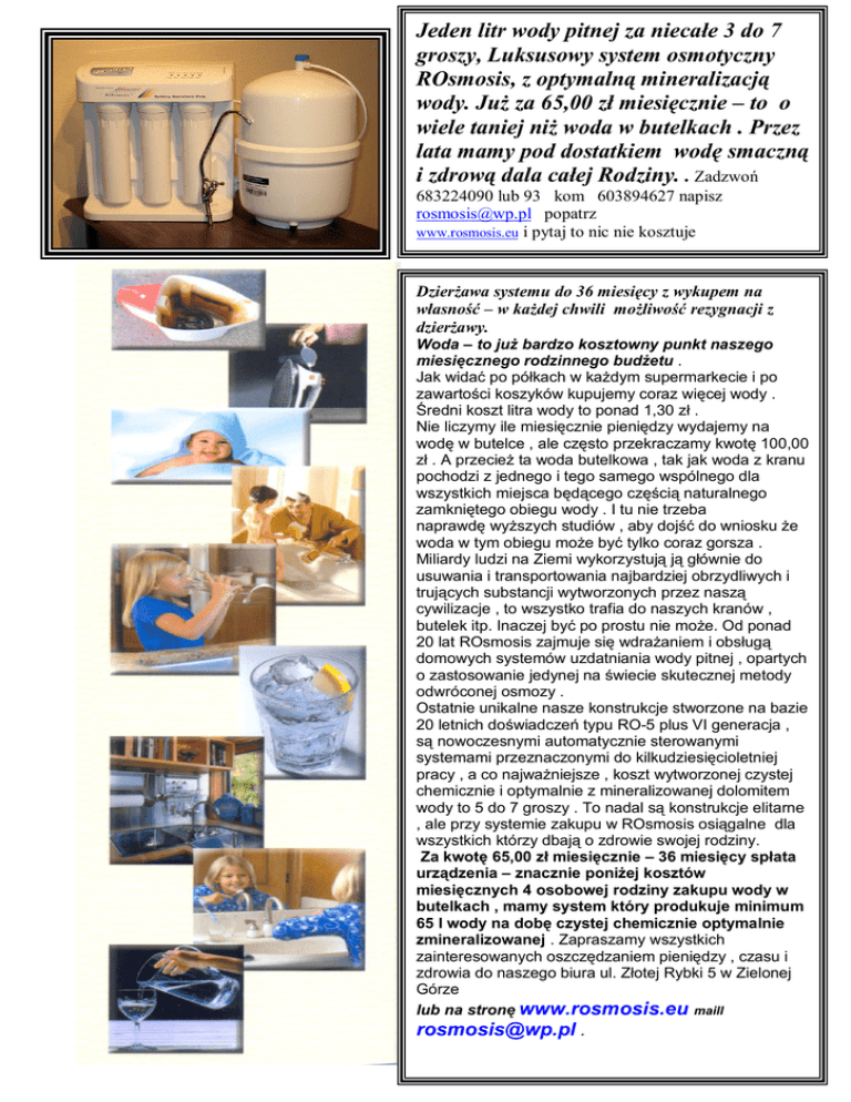 Jeden litr wody pitnej za niecałe 3 do 7 groszy, Luksusowy system osmotyczny ROsmosis, z optymalną mineralizacją wody. Już za 65,00 zł miesięcznie – to o wiele taniej niż woda w butelkach . Przez lata mamy pod dostatkiem wodę smaczną i zdrową dala całej Rodziny. . Zadzwoń 683224090 lub 93 kom 603894627 napisz [email protected] popatrz www.rosmosis.eu i pytaj to nic nie kosztuje Dzierżawa systemu do 36 miesięcy z wykupem na własność – w każdej chwili możliwość rezygnacji z dzierżawy. Woda – to już bardzo kosztowny punkt naszego miesięcznego rodzinnego budżetu . Jak widać po półkach w każdym supermarkecie i po zawartości koszyków kupujemy coraz więcej wody . Średni koszt litra wody to ponad 1,30 zł . Nie liczymy ile miesięcznie pieniędzy wydajemy na wodę w butelce , ale często przekraczamy kwotę 100,00 zł . A przecież ta woda butelkowa , tak jak woda z kranu pochodzi z jednego i tego samego wspólnego dla wszystkich miejsca będącego częścią naturalnego zamkniętego obiegu wody . I tu nie trzeba naprawdę wyższych studiów , aby dojść do wniosku że woda w tym obiegu może być tylko coraz gorsza . Miliardy ludzi na Ziemi wykorzystują ją głównie do usuwania i transportowania najbardziej obrzydliwych i trujących substancji wytworzonych przez naszą cywilizacje , to wszystko trafia do naszych kranów , butelek itp. Inaczej być po prostu nie może. Od ponad 20 lat ROsmosis zajmuje się wdrażaniem i obsługą domowych systemów uzdatniania wody pitnej , opartych o zastosowanie jedynej na świecie skutecznej metody odwróconej osmozy . Ostatnie unikalne nasze konstrukcje stworzone na bazie 20 letnich doświadczeń typu RO-5 plus VI generacja , są nowoczesnymi automatycznie sterowanymi systemami przeznaczonymi do kilkudziesięcioletniej pracy , a co najważniejsze , koszt wytworzonej czystej chemicznie i optymalnie z mineralizowanej dolomitem wody to 5 do 7 groszy . To nadal są konstrukcje elitarne , ale przy systemie zakupu w ROsmosis osiągalne dla wszystkich którzy dbają o zdrowie swojej rodziny. Za kwotę 65,00 zł miesięcznie – 36 miesięcy spłata urządzenia – znacznie poniżej kosztów miesięcznych 4 osobowej rodziny zakupu wody w butelkach , mamy system który produkuje minimum 65 l wody na dobę czystej chemicznie optymalnie zmineralizowanej . Zapraszamy wszystkich zainteresowanych oszczędzaniem pieniędzy , czasu i zdrowia do naszego biura ul. Złotej Rybki 5 w Zielonej Górze lub na stronę www.rosmosis.eu maill [email protected] .