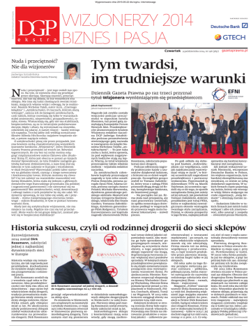 Dodatek informacyjno-promocyjny Wygenerowano dnia 2015-05-22 dla loginu: internetowagp e k s t r a wizjonerzy 2014 biznes i pasja Czwartek Nuda i przeciętność? Nie dla wizjonerów Jadwiga Sztabińska redaktor naczelna Dziennika Gazety Prawnej N uda i przeciętność – jest tego wokół nas sporo. Na tyle, że niewielu chce się przebijać przez skorupę. Skorupę szarości, przeciętniactwa. Ale tak się składa, że nie wszystkich ona oblepia. Nie ima się ludzi chodzących swoimi ścieżkami, mających własne wizje i odwagę, by je realizować. Nassim Nicholas Taleb, autor m.in. „Czarnego łabędzia” i „Antykruchości. O rzeczach, którym służą wstrząsy”, zalicza ich do kategorii antykruchych, czyli takich, którzy rozwijają się tylko w warunkach stałej zmienności, niepewności, przypadkowości, ryzyka, stresu. Wzmacniają się, gdy nie ma stabilizacji, bezpieczeństwa, są za to intuicyjnie podejmowane decyzje, błędy i ofiary. Są wytrzymali na wszystko, cokolwiek się zdarzy. A nawet więcej – każdy wstrząs ich napędza. Trochę jakby żyli według scenariuszy filmów Alfreda Hitchcocka: najpierw trzęsienie ziemi, a potem napięcie rośnie. O antykruchości piszę nie przez przypadek. Jest ona bowiem cechą charakterystyczną wszystkich laureatów konkursu „Wizjonerzy”, który Dziennik Gazety Prawna prowadzi od trzech lat. Również tegorocznych. Bo czy bez tej cechy można osiągnąć międzynarodowy sukces filmowy albo zbudować firmę IT, która jest obecna w ponad 40 krajach świata? Spowodować, że tylu Polaków zastąpiło gotówkę kartami zbliżeniowymi, a nasz kraj stał się liderem w tym zakresie w Europie i wiceliderem w skali światowej? Wprowadzić polski tabor szynowy na globalny rynek, czyniąc z niego nowoczesny i konkurencyjny towar, którym możemy się chwalić? Czy też założyć na warmińsko-mazurskiej wsi farmę ślimaków, która stała się jednym z głównych dostawców tego francuskiego przysmaku dla polskiej i zagranicznej gastronomii i nie zatrzymać się na gastronomii? Bez antykruchości, wizji, determinacji i odwagi żaden z tych projektów by się nie udał. Wizjonerzy sprawiają, że nie tylko się udały, ale i przyniosły – mimo niesprzyjającego otoczenia rynkowego – sukces finansowy, w tym w postaci wzrostu wartości firm. Kiedy jest się antykruchym wizjonerem, nie ma miejsca na nudę. Nigdzie nie czai się też przeciętność. Może warto do tej grupy dołączyć, zamiast pławić się w bezpiecznej stabilizacji? partnerzy dodatku 9 października 2014, nr 196 (3837) gazetaprawna.pl Tym twardsi, im trudniejsze warunki Dziennik Gazeta Prawna po raz trzeci przyznał tytuł Wizjonera wyróżniającym się przedsiębiorcom Jakub Kapiszewski [email protected] nagrody jak zwykle zostały wręczone podczas uroczystości w sopockim hotelu Sheraton, tuż przed galą zamykającą europejskie Forum nowych Idei. przedsiębiorców uhonorowanych tytułem Wizjonera redaktor naczelna dGp Jadwiga Sztabińska podczas przemówienia otwierającego galę nazwała w nawiązaniu do książki nassima nicholasa taleba „antykruchymi”. – to jest taka cecha u ludzi, która sprawia, że pod wpływem negatywnych bodźców stają się lepsi. Wierzę, że tytuł wizjonera przyznajemy takim właśnie osobom – wyjaśniła redaktor naczelna. za antykruchych członkowie kapituły przyznającej nagrodę w tym roku uznali: piotra dzięcioła, prezesa zarządu opus Film; adama Górala, prezesa zarządu asseco poland; Michała Skowronka, dyrektora generalnego polskiego oddziału MasterCard europa; Grzegorza Skalmowskiego, właściciela eko Snails Garden; tomasza zaboklickiego, dyrektora generalnego peSa Bydgoszcz. tytułem eurowizjonera zaś kapituła nagrody uhonorowała dirka rossmana, założyciela popularnej sieci drogerii. podczas odbierania nagrody praktycznie każdy z laureatów dziękował ludziom, z którymi na co dzień współpracuje. Szczególnie gorąco zrobił to tomasz zaboklicki, który wraz z załogą peSa przeszedł długą drogę od firmy, kompletnego bankruta, do branżowej potęgi. – na początku lat 90. firma stała nad przepaścią, ale nasi pracownicy uwierzyli, że spółka remontująca drewniane podłogi w wagonach do przewozu węgla może budować lokomotywy – mówił prezes. po gali odbyła się debata pod hasłem „Indywidualizm czy współpraca, czyli jak najskuteczniej wprowadzać wizję w życie”, w której uczestniczyli nagrodzeni przedsiębiorcy i partnerzy wydarzenia. poprowadził ją dziennikarz tVn 24 Marek tejchman. Jej uczestnicy zgodzili się co do tego, że sposób zarządzania firmą jest zależy od jej sytuacji. Jak powiedział tomasz zaboklicki, dobrym przykładem jest tutaj peSa, która w najbardziej newralgicznym okresie wymagała twardego stylu zarządzania. dzisiaj, w okresie prosperity w jego firmie, najlepiej jednak sprawdza się bardziej koncyliacyjny styl zarządzania. Jak jednak wskazywał Leszek niemycki, wiceprezes deutsche Banku w polsce, im większa organizacja, tym bardziej skomplikowaną ma strukturę, co niesie ze sobą dodatkowe zagrożenia. W takich firmach często pojawiają się ludzie, którzy nie wierząc w wizję lidera stojącego na czele organizacji, „sieją ferment” i obniżają morale zespołu. – zadaniem liderów w takich firmach jest takich ludzi wyłapać i albo ich zmotywować, albo usunąć z zespołu – stwierdził prezes niemycki. Historia sukcesu, czyli od rodzinnej drogerii do sieci sklepów Eurowizjonerem 2014 został Dirk Rossmann, założyciel jednej z najbardziej dynamicznych sieci w Europie Historia wydaje się romantyczna, ale tak naprawdę jest przykładem dochodzenia do wyników dzięki właściwemu przygotowaniu i codziennej pracy. dirk rossmann urodził się 7 września 1946 roku w Hanowerze. Idea przedsiębiorczości nie była mu obca od dzieciństwa – jego ojciec był właścicielem małej drogerii, tradycje prowadzenia małego bi