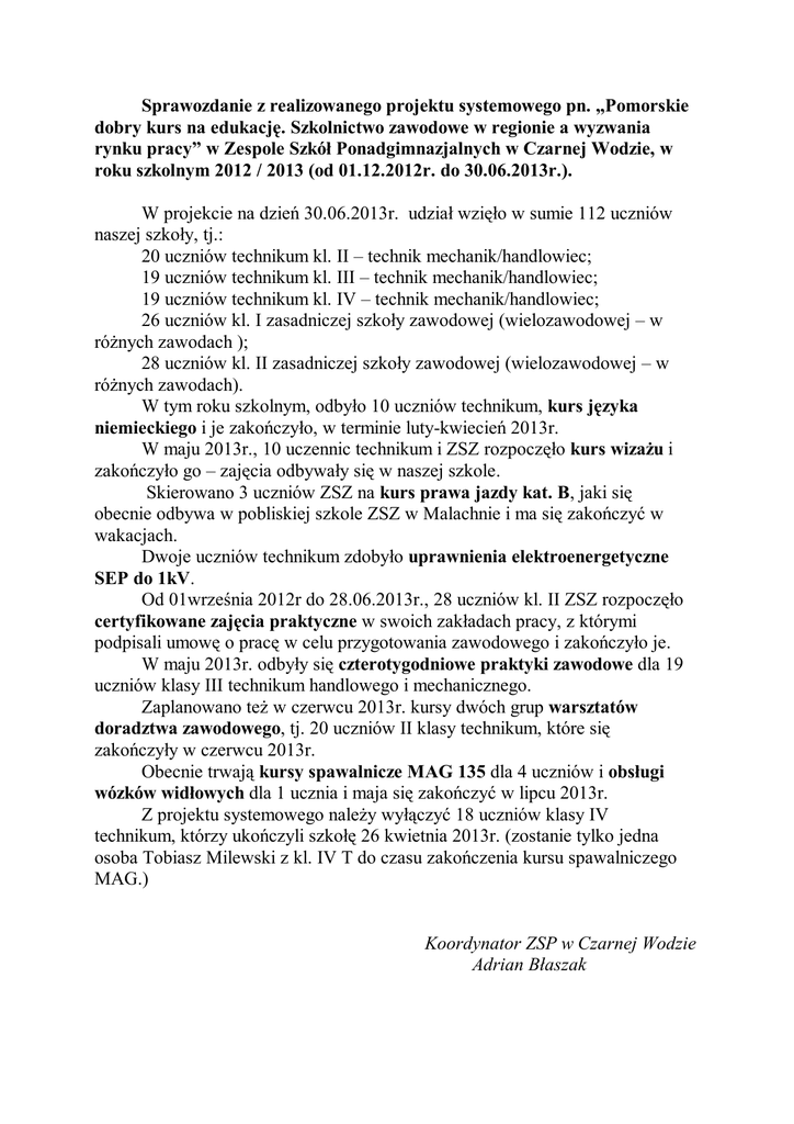 Sprawozdanie z realizowanego projektu systemowego pn. „Pomorskie dobry kurs na edukację. Szkolnictwo zawodowe w regionie a wyzwania rynku pracy” w Zespole Szkół Ponadgimnazjalnych w Czarnej Wodzie, w roku szkolnym 2012 / 2013 (od 01.12.2012r. do 30.06.2013r.). W projekcie na dzień 30.06.2013r. udział wzięło w sumie 112 uczniów naszej szkoły, tj.: 20 uczniów technikum kl. II – technik mechanik/handlowiec; 19 uczniów technikum kl. III – technik mechanik/handlowiec; 19 uczniów technikum kl. IV – technik mechanik/handlowiec; 26 uczniów kl. I zasadniczej szkoły zawodowej (wielozawodowej – w różnych zawodach ); 28 uczniów kl. II zasadniczej szkoły zawodowej (wielozawodowej – w różnych zawodach). W tym roku szkolnym, odbyło 10 uczniów technikum, kurs języka niemieckiego i je zakończyło, w terminie luty-kwiecień 2013r. W maju 2013r., 10 uczennic technikum i ZSZ rozpoczęło kurs wizażu i zakończyło go – zajęcia odbywały się w naszej szkole. Skierowano 3 uczniów ZSZ na kurs prawa jazdy kat. B, jaki się obecnie odbywa w pobliskiej szkole ZSZ w Malachnie i ma się zakończyć w wakacjach. Dwoje uczniów technikum zdobyło uprawnienia elektroenergetyczne SEP do 1kV. Od 01września 2012r do 28.06.2013r., 28 uczniów kl. II ZSZ rozpoczęło certyfikowane zajęcia praktyczne w swoich zakładach pracy, z którymi podpisali umowę o pracę w celu przygotowania zawodowego i zakończyło je. W maju 2013r. odbyły się czterotygodniowe praktyki zawodowe dla 19 uczniów klasy III technikum handlowego i mechanicznego. Zaplanowano też w czerwcu 2013r. kursy dwóch grup warsztatów doradztwa zawodowego, tj. 20 uczniów II klasy technikum, które się zakończyły w czerwcu 2013r. Obecnie trwają kursy spawalnicze MAG 135 dla 4 uczniów i obsługi wózków widłowych dla 1 ucznia i maja się zakończyć w lipcu 2013r. Z projektu systemowego należy wyłączyć 18 uczniów klasy IV technikum, którzy ukończyli szkołę 26 kwietnia 2013r. (zostanie tylko jedna osoba Tobiasz Milewski z kl. IV T do czasu zakończenia kursu spawalniczego MAG.) Koordynator ZSP w Czarnej Wodzie Adrian Błaszak