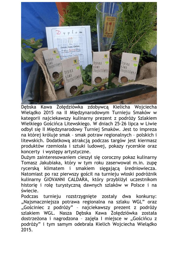 Dębska Kawa Żołędziówka zdobywcą Kielicha Wojciecha Wielądko 2015 na II Międzynarodowym Turnieju Smaków w kategorii najciekawszy kulinarny prezent z podróży Szlakiem Wielkiego Gościńca Litewskiego. W dniach 25-26 lipca w Liwie odbył się II Międzynarodowy Turniej Smaków. Jest to impreza na której króluje smak – smak potraw regionalnych – polskich i litewskich. Dodatkową atrakcją podczas targów jest kiermasz produktów rzemiosła i sztuki ludowej, pokazy rycerskie oraz koncerty i występy artystyczne. Dużym zainteresowaniem cieszył się coroczny pokaz kulinarny Tomasz Jakubiaka, który w tym roku zaserwował m.in. zupę rycerską klimatem i smakiem sięgającą średniowiecza. Natomiast po raz pierwszy gościł na turnieju włoski podróżnik kulinarny GIOVANNI CALDARA, który przybliżył uczestnikom historię i rolę turystyczną dawnych szlaków w Polsce i na świecie. Podczas turnieju rozstrzygnięte zostały dwa konkursy: „Najsmaczniejsza potrawa regionalna na szlaku WGL” oraz „Gościniec z podróży” – najciekawszy prezent z podróży szlakiem WGL. Nasza Dębska Kawa Żołędziówka została dostrzeżona i nagrodzona – zajęła I miejsce w „Gościńcu z podróży” i tym samym odebrała Kielich Wojciecha Wielądko 2015. Więcej info tutaj: http://www.wielkigoscinieclitewski.pl Spośród 80 uczestników konkursu wyłoniono zwycięzców, oto oni: