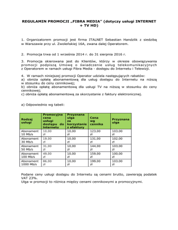 REGULAMIN PROMOCJI „FIBRA MEDIA” (dotyczy usługi INTERNET + TV HD) 1. Organizatorem promocji jest firma ITALNET Sebastian Handzlik z siedzibą w Warszawie przy ul. Zwoleńskiej 16A, zwana dalej Operatorem. 2. Promocja trwa od 1 września 2014 r. do 31 sierpnia 2016 r. 3. Promocja skierowana jest do Klientów, którzy w okresie obowiązywania promocji podpiszą Umowę o świadczenie usług telekomunikacyjnych z Operatorem w ramach usługi Fibra Media - dostępu do Internetu i Telewizji. 4. W ramach niniejszej promocji Operator udziela następujących rabatów: a) obniża opłatę abonamentową dla usług dostępu do Internetu na niższą w stosunku do ceny cennikowej; b) obniża opłatę abonamentową dla usługi TV na niższą w stosunku do ceny cennikowej; c) obniża opłatę abonamentową za skorzystanie z faktury elektronicznej. a) Odpowiednio wg tabeli: Abonament 10 Mb/s Promocyjna cena usługi dostępu do Internetu 10,00 zł Przyznana ulga za korzystanie z efaktury 10,00 zł Abonament 30 Mb/s 19,00 zł Abonament 50 Mb/s Cena wg cennika Przyznana ulga 123,00 zł 103,00 zł 10,00 zł 131,00 zł 102,00 zł 31,00 zł 10,00 zł 144,00 zł 103,00 zł Abonament 100 Mb/s 49,00 zł 10,00 zł 159,00 zł 100,00 zł Abonament 1000 Mb/s 86,00 zł 10,00 zł 199,00 zł 103,00 zł Rodzaj usługi Podane ceny usługi dostępu do Internetu są cenami brutto, zawierają podatek VAT 23%. Ulga w promocji to różnica między cenami cennikowymi a promocyjnymi. b) Odpowiednio wg tabeli: Rodzaj usługi -nazwy Pakietów Promocyjna cena usługi TV Cena wg cennika Przyznana ulga Ulga za zamówienie Pakietu Extra HD Standard 83,00 zł 83,37 zł 0,37 zł 5, 00 zł Premium Sport+ 29,90 zł 34,90 zł 5,00 zł nd Premium Film+ 29,90 zł 34,90 zł 5,00 zł nd Premium Sport&Film 48,90 zł 59,90 zł 11,00 zł nd Podane ceny usługi TV są cenami brutto, zawierają podatek VAT 8%. Ulga w promocji to różnica między cenami cennikowymi a promocyjnymi. Oferta dotyczy usługi Fibra Media (Internet+ TV) Pakietu Standard. Warunkiem zamówienia Pakietu Extra HD jest wybór oferty łączonej z Pakietem Standard. Cennik brutto pozostałych Pakietów Premium¹ dostępnych w usłudze Fibra Media (płatne dodatkowo): Nazwa Pakietu Cena wg cennika Bajki 7,90 zł Muzyka 8,90 zł Sport 10,90 zł Filmy i seriale 16,90 zł Rodzinny 9,90 zł Nauka i podróże 10,90 zł Świat 5,90 zł Erotyka 23,90 zł Promocyjna cena usługi TV nd ¹ Warunkiem udostępniania Abonentowi kanałów tematycznych w Pakiecie Premium jest wykupienie abonamentu na Pakiet Extra HD. Opłaty jednorazowe 5. Opłata aktywacyjna Przy podpisaniu Umowy na czas określony, tj. 24 miesięcy, koszt Pakietu Standard wynosi 99 zł. Przy zamówieniu Pakietów: Standard i Extra HD, koszt aktywacji dla nowych klientów to 1 zł - dodatkowo oferujemy 4 kanały Volleyball z możliwością oglądania Mistrzostw w Siatkówce za 1 zł. 6 . Opłata instalacyjna zależna jest od odległości nieruchomości Klienta od magistrali Operatora. 6.1. Przy płatności jednorazowej opłata instalacyjna przedstawia się następująco: Odległość od magistrali do 20m 20-70m 70-200m > 200 m Płatność jednorazowa 549,00 zł 1099,00 zł 1849,00 zł wg kosztorysu 6.2. Opłata instalacyjna może zostać rozłożona na miesięczne raty doliczane do wystawianych faktur zgodnie z tabelą poniżej: Odległość od magistrali Umowa na 24 mc, opłata za 1 mc do 20m 29,00 zł 20-70m 59,00 zł 70-200m 99,00 zł > 200 m wg kosztorysu 6.3. Przy odległości powyżej 200 m wysokość rat miesięcznych jest ustalana po sporządzeniu kosztorysu. 6.4. Opłata instalacyjna rozłożona na raty będzie doliczana do faktur przez pierwsze 24 miesiące trwania Umowy. Po upływie okresu obowiązywania Umowy na czas określony opłata nie będzie pobierana. 7. Po okresie obowiązywania Umowy na czas określony Umowa przechodzi na czas nieokreślony, bez zmiany wysokości opłat abonamentowych. Opłata instalacyjna zgodnie z punktem 6.4. 8. Operator w ramach zawartej Umowy promocyjnej, udostępnia abonentowi wszystkie niezbędne urządzenia potrzebne do świadczenia usługi. 9. Klient może zawrzeć Umowę promocyjną, jeżeli: a) istnieją warunki techniczne na podłączenie lokalizacji klienta do sieci Operatora i jest możliwość świadczenia wybranej przez klienta usługi w tej lokalizacji. Jeżeli wcześniej zawarto umowę promocyjną, a nie ma możliwości świadczenia jej w lokalizacji klienta, umowa ulega wygaśnięciu bez przysługujących jakichkolwiek roszczeń z tego tytułu Klientowi, b) nie zalega z opłatami na rzecz Operatora. 10. Abonent może zmieniać usługi w czasie trwania promocji na wyższe, wybierając spośród usług dostępnych w tej promocji. Postanowienia Końcowe 1. W przypadku jednostronnego rozwiązania Umowy przez Abonenta lub przez Operatora z winy Abonenta przed upływem terminu na jaki została ona zawarta, Operatorowi przysługuje roszczenie o zwrot przyznanych Abonentowi ulg, pomniejszonych o proporcjonalną ich wartość za okres od dnia zawarcia Umowy do dnia jej rozwiązania. Roszczenie to nie przysługuje w przypadku rozwiązania Umowy przez Abonenta przed rozpoczęciem świadczenia usług, chyba że przedmiotem ulgi jest telekomunikacyjne urządzenie końcowe. 2. W przypadku jednostronnego rozwiązania Umowy przez Abonenta lub przez Operatora z winy Abonenta przed upływem terminu na jaki została ona zawarta, Operatorowi przysługuje roszczenie o zapłatę za instalację przyłącza, pomniejszoną o raty spłacone do dnia rozwiązania Umowy. 3. Klient może w każdym czasie cofnąć akceptację otrzymywania faktur w postaci elektronicznej. W przypadku rezygnacji z otrzymywania faktur w postaci elektronicznej przed upływem okresu, na jaki została zawarta Umowa, Operatorowi przysługuje roszczenie o zwrot przyznanych Abonentowi ulg z tego tytułu, pomniejszonych o proporcjonalną ich wartość za okres od dnia zawarcia Umowy do dnia jej rozwiązania. Roszczenie to 