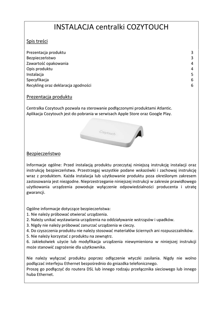 INSTALACJA centralki COZYTOUCH Spis treści Prezentacja produktu Bezpieczeństwo Zawartość opakowania Opis produktu Instalacja Specyfikacja Recykling oraz deklaracja zgodności 3 3 4 4 5 6 6 Prezentacja produktu Centralka Cozytouch pozwala na sterowanie podłączonymi produktami Atlantic. Aplikacja Cozytouch jest do pobrania w serwisach Apple Store oraz Google Play. Bezpieczeństwo Informacje ogólne: Przed instalacją produktu przeczytaj niniejszą instrukcję instalacji oraz instrukcję bezpieczeństwa. Przestrzegaj wszystkie podane wskazówki i zachowaj instrukcję wraz z produktem. Każda instalacja lub użytkowanie produktu poza określonym zakresem zastosowania jest niezgodne. Nieprzestrzeganie niniejszej instrukcji w zakresie prawidłowego użytkowania urządzenia powoduje wyłączenie odpowiedzialności producenta i utratę gwarancji. Ogólne informacje dotyczące bezpieczeństwa: 1. Nie należy próbować otwierać urządzenia. 2. Należy unikać wystawiania urządzenia na oddziaływanie wstrząsów i upadków. 3. Nigdy nie należy próbować zanurzać urządzenia w cieczy. 4. Do czyszczenia produktu nie należy stosować materiałów ściernych ani rozpuszczalników. 5. Nie należy korzystać z produktu na zewnątrz. 6. Jakiekolwiek użycie lub modyfikacja urządzenia niewymieniona w niniejszej instrukcji może stanowić zagrożenie dla użytkownika. Nie należy wyłączać produktu poprzez odłączenie wtyczki zasilania. Nigdy nie wolno podłączać interfejsu Ethernet bezpośrednio do gniazdka telefonicznego. Proszę go podłączyć do routera DSL lub innego rodzaju przełącznika sieciowego lub innego huba Ethernet. Zawartość opakowania 1 x Centralka 1 x Zasilacz 1 x Kabel Ethernet 1 x Instrukcja Opis Produktu Przycisk PROG Przycisk RESET RJ45 łącze Ethernet Port zasilania Dioda LED Dioda LED wskazuje tryb pracy centralki: - Zielone światło: aktywne połączenie internetowe - Czerwone światło: brak połączenia internetowego - Migająca dioda LED (zielona, pomarańczowa lub czerwona): połączenie w toku Przyciski PROG i RESET nie mają na razie funkcji w aplikacji Cozytouch. Wymagania instalacyjne Niezbędne do instalacji są: połączenie internetowe, router DSL wyposażoną w port Ethernet. Centralkę Cozytouch należy umieścić w minimalnej odległości 30 cm od modemu internetowego. Nie należy umieszczać centralki na metalowej powierzchni. Instalacja Podłącz centralkę do routera DSL, podłączając kabel Ethernet na złączu Ethernet przedstawionym przez logo . Podłącz załączony zasilacz do złącza przedstawionego przez logo . Konwerter jest bezużyteczny dla niektórych krajów; można bezpośrednio podłączyć USB do gniazda internetowego w celach zasilania energii. Następnie zaświeci się dioda LED zmieniając kolor przez kilkadziesiąt sekund i ostatecznie pozostanie zielona. Konfiguracja Utworzenie konta i połączenia centralki z kompatybilnymi produktami dokonywane jest za pomocą aplikacji Cozytouch. W celu konfiguracji oraz wykorzystania Cozytouch, należy odnieść się do instrukcji obsługi urządzeń i instrukcji stosowania COZYTOUCH. Konieczne będzie wprowadzenie numeru PIN centralki (ten numer znajduje się na dolnej etykiecie urządzenia i będzie on wymagany podczas tworzenia konta). Specyfikacja Cozytouch: - IP30. - Temperatura pracy + 5 ° C to 35 ° C. - Maksymalna wysokość pracy: <2000m. - Kategoria zanieczyszczenia : Klasa 2. - Wilgotność: 30% do 85%. - Wymiary (L x W x H) 110 x 71.25 x 28.13 mm. - Plastikowa skrzynka ABS-PC. - Pobór mocy w normalnym trybie pracy: DC 5V 120mA Radio Fale Radiowe: - Częstotliwość Radiowa 868.25MHz, 868.95MHz oraz 869.85MHz zgodnie ze standardem. Zasilanie zasilacz AC: - 230V ~ 50Hz. - Zasilanie 5V DC 0.5A. Recykling i deklaracja zgodności Urządzenia z takim symbolem nie należy wyrzucać wraz z odpadami domowymi, muszą one być zbierane osobno i poddawane recyklingowi. Zbieranie i recycling produktu zużytego musi być wykonany zgodnie z przepisami i lokalnymi rozporządzeniami (DEEE 2002/96/CE). Oświadczamy, że urządzenie jest zgodne z wymaganiami i innymi stosownymi postanowieniami Dyrektywy 1999/5 / EC.