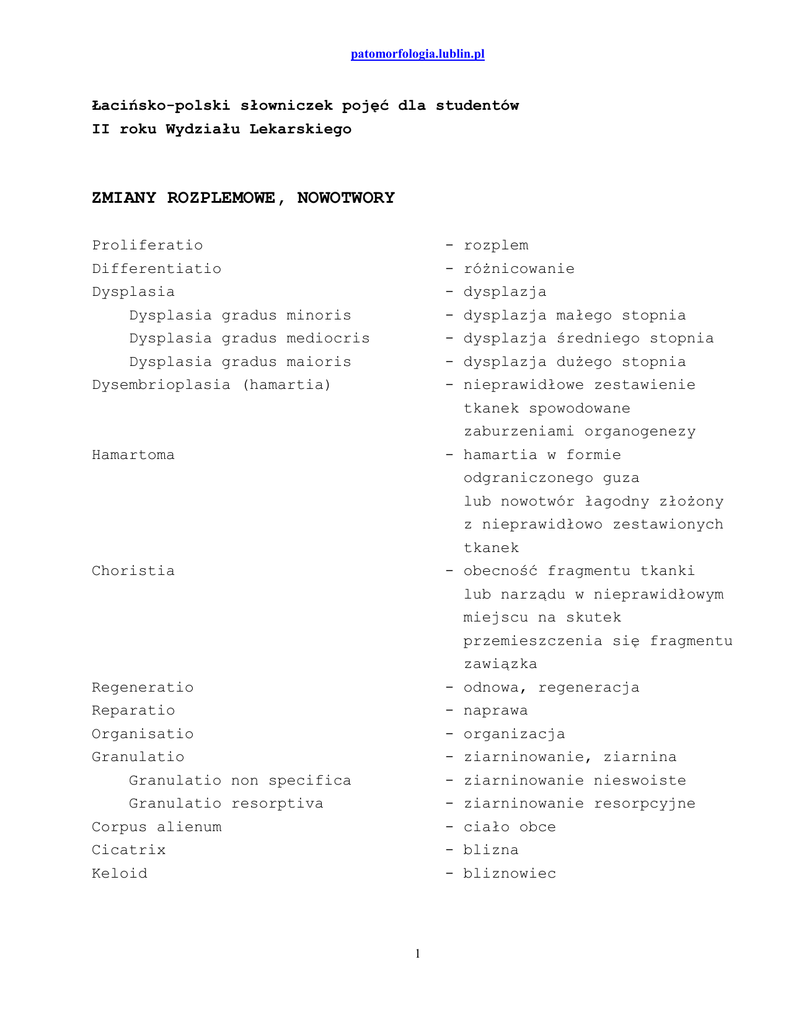 patomorfologia.lublin.pl Łacińsko-polski słowniczek pojęć dla studentów II roku Wydziału Lekarskiego ZMIANY ROZPLEMOWE, NOWOTWORY Proliferatio Differentiatio Dysplasia Dysplasia gradus minoris Dysplasia gradus mediocris Dysplasia gradus maioris Dysembrioplasia (hamartia) - Hamartoma - Choristia - Regeneratio Reparatio Organisatio Granulatio Granulatio non specifica Granulatio resorptiva Corpus alienum Cicatrix Keloid - 1 rozplem różnicowanie dysplazja dysplazja małego stopnia dysplazja średniego stopnia dysplazja dużego stopnia nieprawidłowe zestawienie tkanek spowodowane zaburzeniami organogenezy hamartia w formie odgraniczonego guza lub nowotwór łagodny złożony z nieprawidłowo zestawionych tkanek obecność fragmentu tkanki lub narządu w nieprawidłowym miejscu na skutek przemieszczenia się fragmentu zawiązka odnowa, regeneracja naprawa organizacja ziarninowanie, ziarnina ziarninowanie nieswoiste ziarninowanie resorpcyjne ciało obce blizna bliznowiec patomorfologia.lublin.pl Vulnus Reunio per primam intentionem Reunio per secundam intentionem Hypertrophia Hypertrophia spontanea Hypertrophia secundaria Hypertrophia vicaria Hypertrophia compensatoria Hyperplasia Hyperplasia compensatoria Hyperplasia nodularis prostatae Hyperplasia endometrii Metaplasia Metaplasia planoepithelialis Metaplasia intestinalis Myositis ossificans Kataplasia Anaplasia Neoplasma Neoplasma benignum Neoplasma malignum Neoplasma malignum indifferentiatum (non differentiatum) N. m. male differentiatum - rana - zrośnięcie (rany) przez rychłozrost - zrośnięcie (rany) przez ziarninowanie - przerost - przerost samoistny - przerost wtórny - przerost zastępczy - przerost wyrównawczy - rozrost - rozrost wyrównawczy - rozrost guzkowy stercza - rozrost błony śluzowej jamy macicy - metaplazja, przemiana zróżnicowanej tkanki w zróżnicowaną tkankę innego typu - metaplazja płaskonabłonkowa - metaplazja jelitowa - kostniejące zapalenie mięśni - brak dojrzewania czynnościowego komórek nowotworowych przy zachowanym podobieństwie morfologicznym do komórek prawidłowych - brak zróżnicowania komórek nowotworowych - nowotwór - nowotwór łagodny - nowotwór złośliwy - nowotwór złośliwy niezróżnicowany (G4) - n. z. nisko zróżnicowany (G3) 2 patomorfologia.lublin.pl - nowotwór złośliwy o pośrednim stopniu zróżnicowania (G2) - n. z. wysoko zróżnicowany (G1) - nowotwór półzłośliwy (miejscowo złośliwy) Cellulae suspectae - komórki podejrzane Cellulae neoplasmaticae - komórki nowotworowe Morbus neoplasmaticus - choroba nowotworowa Cachexia neoplasmatica - wyniszczenie nowotworowe Status praecancerosus - stan przedrakowy Carcinoma - rak, nowotwór złośliwy pochodzenia nabłonkowego Sarcoma - mięsak, nowotwór złośliwy pochodzenia mezenchymalnego Tumor - guz, obrzmienie Infiltratio (invasio) - naciekanie Infiltratio macrofocalis - naciekanie wielkoogniskowe Infiltratio microfocalis - naciekanie drobnoogniskowe Infiltratio dispersa - naciekanie rozproszone Implantatio - wszczepienie Recidiva - wznowa Metastasis - przerzut Neoplasma malignum metastaticum - nowotwór złośliwy przerzutowy Morbus neoplasmaticus disseminatus- rozsiana choroba nowotworowa Metastases lymphogenes - przerzuty drogą naczyń chłonnych Lymphangiosis carcinomatosa - zajęcie naczyń chłonnych przez raka Metastases hematogenes - przerzuty drogą naczyń krwionośnych Carcinosis (carcinomatosis) - rozsiew raka w otrzewnej peritonei Atypia - atypia Mitoses atypicae - nieprawidłowe podziały mitotyczne Neoplasma malignum mediocriter differentiatum N. m. bene differentiatum Neoplasma semimalignum 3 patomorfologia.lublin.pl Polypus Polypositas, polyposis Poliposis adenomatosa coli Adenoma Adenoma tubulare intestini crassi Adenoma tubulo-villosum i. crassi Adenoma villosum intestini crassi Adenoma pleomorphicum glandulae salivariae Adenoma hepatocellulare Adenoma folliculare glandulae thyroideae Cystadenoma Papilloma Papilloma planoepitheliale Papilloma uroepitheliale (transitionale) „Carcinoma praeinvasivum” („c. intraepitheliale”, „c. in situ)” Carcinoma solidum Carcinoma anaplasticum Carcinoma scirrhosum Desmoplasia Carcinoma medullare Carcinoma planoepitheliale Carcinoma planoepitheliale keratodes Carcinoma planoepitheliale akeratodes Carcinoma basocellulare cutis 4 - polip - polipowatość - polipowatość gruczolakowa jelita grubego - gruczolak - gruczolak cewkowy jelita grubego - gruczolak cewkowo-kosmkowy jelita grubego - gruczolak kosmkowy j. grubego - gruczolak wielopostaciowy ślinianki - gruczolak wątrobowokomórkowy - gruczolak pęcherzykowy tarczycy - gruczolakotorbielak - brodawczak - brodawczak płaskonabłonkowy - brodawczak z nabłonka przejściowego dróg moczowych - „rak przedinwazyjny” („rak śródnabłonkowy”, „rak w miejscu”) - rak lity - rak anaplastyczny - rak włóknisty - włóknienie zrębu stymulowane przez naciek nowotworowy - rak rdzeniasty - rak płaskonabłonkowy - rak płaskonabłonkowy rogowaciejący – rak płaskonabłonkowy nierogowaciejący - rak podstawnokomórkowy skóry patomorfologia.lublin.pl - rak z nabłonka przejściowego dróg moczowych - rak drobnokomórkowy - rakowiak - gruczolakorak, rak gruczołowy - gruczolakorak śluzowy - rak śluzowokomórkowy (sygnetowatokomórkowy) Linitis plastica - obraz makroskopowy rozległego śródściennego nacieku raka śluzowokomórkowego żołądka („skórzana butelka”) Carcinoma hepatocellulare - rak wątrobowokomórkowy Cholangiocarcinoma - rak z nabłonka przewodów żółciowych wewnątrzwątrobowych Adenocarcinoma ductale pancreatis - gruczolakorak przewodowy trzustki Cystadenocarcinoma - gruczolakotorbielakorak Carcinoma ductale mammae - rak przewodowy piersi Carcinoma intraductale - rak wewnątrzprzewodowy (carcinoma ductale in situ) (rak przewodowy przedinwazyjny) Carcinoma lobulare mammae - rak zrazikowy piersi Carcinoma clarocellulare renis - rak jasnokomórkowy nerki Car