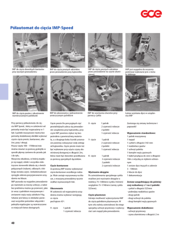 Półautomat do cięcia IMP-Speed IMP do cięcia dowolnych konturów przy ręcznym prowadzeniu IMP do cięcia prostych odcinków przez prowadzenie przy kątowniku IMP do cięcia prostych odcinków przez prowadzenie na szynie aluminiowej IMP jest wygodne do noszenia ponieważ wykonane jest z metalu lekkiego IMP do cięcia pasów z obustronnie rozmieszczonymi palnikami IMP do ukosowania z jednostronnie umieszczonym palnikiem IMP do wycinania otworów przy pomocy cyrkla Łatwa wymiana dysz w urządzeniu IMP Cięcie proste Do precyzyjnych cięć prostolinijnych zaleca się prowadzenie urządzenia przy kątowniku, przy czym IMP powinno stykać się bezpośrednio z powierzchnią materiału, a z drugiego boku liczniki ystansowe powinny wskazywać stały odstęp od kątownika. Cięcie proste może też być wykonane przy użyciu szyny aluminiowej dostępnej w długości 2m, która może być dowolnie przedłużana za pomocą specjalnych łączników. X- cięcie Przy pomocy półautomatu do cięcia IMP Speed , który w zależności od potrzeby może być wyposażony w 1 lub 2 palniki maszynowe można bez potrzeby dodatkowej obróbki wykonać czyste cięcia proste, konturowe, ukośne, pasy i okręgi. Posuw rzędu 100 - 1700mm/min można stawiać za pomocą pokrętła w sposób płynny zarówno do przodu jak i do tyłu. Masywna obudowa, w której znajduje się napęd, silniki i wszystkie elektryczne sterowniki składa się z dwóch połączonych śrubami, odlanych z lekkiego metalu części. Jednokierunkowe sprzęgło ułatwia pozycjonowanie urządzenia na blasze. IMP pozwala na wygodne prowadzenie po materiale za mocny uchwyt, a także bez problemu można go przenosić, jako że wraz z palnikiem maszynowym i zestawem węży waży zaledwie 9 kg. Sekator jest łatwy w obsłudze ponieważ wszystkie potrzebne włączniki i pokrętła regulacyjne są rozmieszczone w miejscach łatwo dostępnych. 40 Cięcie konturowe Za pomocą IMP można wykonywać cięcia konturowe wszelkiego rodzaju. Wzór zostaje wyrysowany na blasze, a maszynę prowadzimy ręcznie wzdłuż wyznaczonych linii. Ukosowanie W zależności od wyposażenia urządzenia można wykonać następujące cięcia pod kątem 45º: V- cięcie 1 palnik 1 czynność robocza 1 palnik 2 czynności robocze 2 palniki 1 czynność robocza Y- cięcie 1 palnik 2 czynności robocze 2 palniki 1 czynność robocza K- cięcie 1 palnik 3 czynności robocze 2 palniki 2 czynności robocze Wycinanie okręgów Po zainstalowaniu specjalnego cyrkla możliwe jest wycinanie okręgów o średnicy 75-1380mm (cyrkla 342mm) względnie 75-1740mm (ramię cyrkla 525mm). Zastrzega się zmiany techniczne i poprawki! Wyposażenie standardowe: 1 palnik maszynowy 1 napęd 1 cyrkiel o długości 342 mm 1 rozdzielacz gazów 1 uchwyt palnika 1 komplet węży gazowych 1 kabel przyłącza do sieci o długości 10m z wtyczką ze stykiem ochronnym 1 zestaw dysz tnących o zakresie 3 - 100mm 2 klucze do dysz 1 dokumentacja Zestaw uzupełniający do późniejszej rozbudowy z 1 na 2 palniki: - cyrkiel o długości 525mm - podwójny rozdzielacz gazów - drugi palnik - drugi uchwyt do palnika - drugi komplet węży gazowych Cięcie plazmowe Istnieje możliwość wykorzystania IMP do cięcia palnikiem plazmowym. W tym celu należy zainstalować do niego specjalny uchwyt pryzmowy i wykorzy- Wyposażenie dodatkowe: stać sam napęd jako prowadzenie. - uchwyt pryzmowy - szyna aluminiowa o długości 2 m