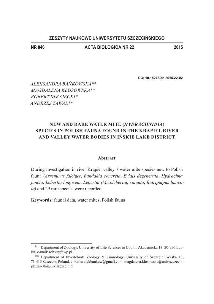 ZESZYTY NAUKOWE UNIWERSYTETU SZCZECIŃSKIEGO NR 846 Acta Biologica nr 22 2015 DOI 10.18276/ab.2015.22-02 Aleksandra Bańkowska** Magdalena Kłosowska** Robert Stryjecki* Andrzej Zawal** New and rare water mite (Hydrachnidia) species in Polish fauna found in the Krąpiel River and valley water bodies in Ińskie Lake District Abstract During investigation in river Krąpiel valley 7 water mite species new to Polish fauna (Arrenurus falciger, Bandakia concreta, Eylais degenerata, Hydrachna juncta, Lebertia longiseta, Lebertia (Mixolebertia) sinuata, Rutripalpus limicola) and 29 rare species were recorded. Keywords: faunal data, water mites, Polish fauna * Department of Zoology, University of Life Sciences in Lublin, Akademicka 13, 20-950 Lublin, e-mail: [email protected] ** Department of Invertebrate Zoology & Limnology, University of Szczecin, Wąska 13, 71-415 Szczecin, Poland, e-mails: [email protected]; [email protected]. pl; [email protected] 16 A. Bańkowska, M. Kłosowska, R. Stryjecki, A. Zawal Introduction In the years 2008–2011 the occurrence of water mites (Hydrachnidia) was studied in current and marginal pool environments of the Krąpiel River and in water bodies of the river valley: peat bogs, oxbow lakes, springs, fish ponds and temporary pools. The Krąpiel, with a length of 70 km, is a right-bank tributary of the Ina River. In its upper and in part its middle course it has the character of a mountain river with a fast current and a bottom of rocks, gravel or sand. In its upper course it flows through two eutrophic lakes. The landscape of the river valley is varied – mixed forests, meadows and farmland. In the Krąpiel and the valley water bodies 116 water mite species were recorded, including 7 species new to Polish fauna and 29 rare species. Below we present descriptions of the sampling sites in which new or rare water mite species were recorded. The site codes were taken from earlier publication (Stryjecki et al. 2016). Study area K1 – N 53o27’18.6” E 15o28’0.21”, a site at the sources of the Krąpiel, river width about 1.5 m. Situated among meadows, with arable fields nearby: K1/5 – relatively fast current, sand and silt bottom with a large quantity of organic matter from withered herbaceous plants growing on the shores, depth 0.2 m., sunlit; K1/6 – marginal pool, sand, silt, thin layer of mud, covered with Glyceria aquatica. K2 – N 53o28’16.37” E 15o24’54.77”, situated among forests, before Lake Kamienny Most, river width 1.5–3 m; K2/2 – marginal pool, depth 0.2 m., sand with a small admixture of mud; K2/3 – fast current, depth up to 0.5 m., sand with a small admixture of organic matter (twigs, mud and leaves). K3 – N 53o27’53.45” E 15o22’45.37”, village of Lublino, site situated among meadows surrounded by arable fields beyond Lake Kamienny Most, river width about 2.5 m; K3/1 – marginal pools, Sparganium, Carex, admixture of leaves, sunlit, depth about 0.2 m, sandy and muddy bottom; K3/4 – gravel in a very fast current, sunlit, depth 1 m. K4 – N 53o27’44.33” E 15o19’50.38”, Chociwel, site situated beyond Lake Chociwel and under its strong influence (severely eutrophic), lies among meadows and near built-up areas, river width about 3 m; K4/1 – plants in the current, Potamogeton perfoliatus, Elodea canadensis, sunlit, depth 1 m, rapid current; New and rare water mite (Hydrachnidia) species in Polish fauna… 17 K4/3 – marginal pools, Glyceria, Phragmites, Sparganium, Carex, sunlit, depth 0.5 m. K6 – N 53o27’55.82” E 15o14’54.79”, Rosowo, site situated on the boundary between meadows and forests, river width about 4 m; K6/3 – river with relatively slow current, in the form of a canal in a peat substrate, yellow water-lily in slow current, depth 1 m, bottom-packed peat with a thin layer of mud; K6/6 – steep river bank, dense peat washed by a light current, depth 1 m; K6/8 – Berula erecta floating on the water surface and bordering on osiers, light current, depth 0.5 m. K7 – N 53o27’28.17” E 15o11”49.98, site situated among forests, between Chlebowo and Chlebówko, river width about 5–5.5 m; K7/1 – gravel and large stones in a fast current, depth 0.5 m, shaded; K7/2 – large marginal pools, sand with a thin layer of mud, depth 0.2 m, shaded; K7/3 – sand with organic matter (twigs, leaves) in a fast current, depth 0.2 m, shaded; K7/6 – Sparganium in a fast current, only ribbon-like leaves, partially sunlit, depth 0.2 m. K8 – N 53o26’48” E 15o10’56.24, Rokicie, site situated near damming, by an electric plant, among meadows, surrounded by farmland, river width about 5 m; K8/3 – vast marginal pool with Glyceria aquatica and a large amount of decaying organic matter, sunlit, depth 0.2 m; K8/6 – fast current, sand, some Carex, depth up to 0.7 m. K9 – N 53o26’7.27” E 15o11’42.57”, site beyond Dzwonowo on the old bed of the Krąpiel, among periodically flooded meadows surrounded by small forests, river width about 3 m; K9/1 – muddy bottom, depth about 0.1 m, weak current, sunlit; K9/3 – Berula and Glyceria in weak current, depth about 0.1 m. K10 – N 53o23’9.69” E 15o10’19.34”, Dalewo, site among meadows, river width 5–6 m; K10/1 – oxbow covered with Glyceria and Lemna, with young alders near the shore, completely filled with water and connected to the river, depth up to 0.5 m; K10/2 – ecotone on the boundary between Glyceria and grasses, fallen leaves, Lemna; K10/3 – marginal pool, Glyceria, Phalaris arundinacea, depth up to 0.5 m; K10/4 – weak current, ribbon-like leaves of Sagittaria, muddy bottom, depth up to 1 m. K11 – N 53o20’17.33” E 15o9’10.43”, site among forests downstream from Pęzino, steep valley walls, river width about 10 m; K11/3 – marginal pool, sand and a thin layer of mud, shaded, depth 0.2 m; K11/4 – plants in the current, ribbon-like leaves of Sparganium, sand, depth 0.5 m. K12 – N 53o19’56.25” E 15o7’