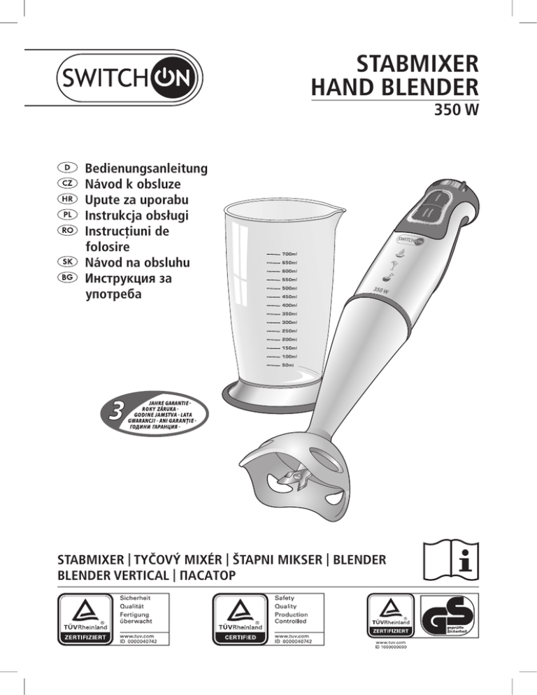 STABMIXER HAND BLENDER 350 W Bedienungsanleitung Návod k obsluze Upute za uporabu Instrukcja obsługi Instrucţiuni de folosire Návod na obsluhu Инструкция за употреба STABMIXER | TYČOVÝ MIXÉR | ŠTAPNI MIKSER | BLENDER BLENDER VERTICAL | ПАСАТОР Klappen Sie vor dem Lesen die Seite mit den Abbildungen aus und machen Sie sich anschließend mit allen Funktionen des Gerätes vertraut. Před čtením si otevřete stranu s obrázky a potom se seznamte se všemi funkcemi přístroje. Prije nego što pročitate tekst, otvorite stranicu sa slikama i upoznajte se na osnovu toga sa svim funkcijama uređaja. Przed przeczytaniem proszę rozłożyć stronę z ilustracjami, a następnie proszę zapoznać się z wszystkimi funkcjami urządzenia. Înainte de a citi instrucţiunile, priviţi imaginile şi familiarizaţi-vă cu toate funcţiile aparatului. Pred čítaním si odklopte stranu s obrázkami a potom sa oboznámte so všetkými funkciami prístroja. Преди да прочетете отворете страницата с фигурите и след това се запознайте с всички функции на уреда. D CZ HR PL RO SK BG Bedienungs- und Sicherheitshinweise Pokyny pro obsluhu a bezpečnostní pokyny Upute za uporabu i za Vašu sigurnost Wskazówki dotyczące obsługi i bezpieczeństwa Instrucţiuni de utilizare şi de siguranţă Pokyny pre obsluhu a bezpečnostné pokyny Инструкции за употреба и безопасност 4 11 18 25 33 40 47 Sehr geehrte Kundin, sehr geehrter Kunde! Wir beglückwünschen Sie zum Kauf Ihres neuen Gerätes. Sie haben sich für ein Produkt mit hervorragendem Preis-/Leistungsverhältnis entschieden, das Ihnen viel Freude bereiten wird. Machen Sie sich vor der Benutzung des Gerätes mit allen Bedienungs- und Sicherheitshinweisen vertraut. Benutzen Sie das Gerät nur wie beschrieben und für die angegebenen Einsatzbereiche. Händigen Sie alle Unterlagen bei Weitergabe des Gerätes an Dritte mit aus. Lieferumfang - Handgerät (A) Kunststoff-Mixstab (B) Mix-/Messbecher (C) Wandhalter (inkl. Montagematerial) Bedienungsanleitung Kontrollieren Sie, ob alle Teile vorhanden sind und überprüfen Sie das Gerät auf Transportschäden. Nehmen Sie ein beschädigtes Gerät nicht in Betrieb! Im Schadensfall wenden Sie sich bitte an eine Kaufland-Filiale. Sicherheit Lesen Sie die folgenden Sicherheitshinweise sorgfältig, bevor Sie das Gerät zum ersten Mal verwenden. Für einen sicheren Gebrauch, befolgen Sie alle nachfolgenden Sicherheitshinweise. Bestimmungsgemäße Verwendung - Das Gerät ist ausschließlich für die Verarbeitung von Lebensmitteln in haushaltsüblichen Mengen bestimmt. - Verwenden Sie das Gerät nicht im Freien. - Das Gerät ist nur für den Einsatz in privaten Haushalten bestimmt. Es ist nicht für den gewerblichen Gebrauch vorgesehen. - Benutzen Sie das Gerät nur für den beschriebenen Anwendungsbereich und mit dem originalen Zubehör. Jede andere Verwendung oder Veränderung des Gerätes gilt als nicht bestimmungsgemäß. Für aus bestimmungswidriger Verwendung oder falscher Bedienung entstandene Schäden wird keine Haftung übernommen. 4 Sicherheit von Kindern und Personen Warnung! Erstickungsgefahr für Kinder beim Spielen mit Verpackungsmaterial! Verpackungsmaterial unbedingt von Kindern fernhalten. - Das Gerät darf nicht von Kindern benutzt werden. - Dieses Gerät können Personen mit verminderten physischen, sensorischen oder mentalen Fähigkeiten oder Mangel an Erfahrung und Wissen benutzen, wenn sie beaufsichtigt werden oder bezüglich des sicheren Gebrauchs des Gerätes unterwiesen wurden und die daraus resultierenden Gefahren verstanden haben. - Kinder sollen nicht mit dem Gerät spielen. - Reinigung und Benutzerwartung dürfen nicht von Kindern durchgeführt werden. - Kinder sind vom Gerät und der Anschlussleitung fernzuhalten. Allgemeine Sicherheit - Das Gerät darf nicht verwendet werden, wenn Netzkabel oder Gehäuse beschädigt sind. - Ist das Netzkabel beschädigt, darf es nur durch eine autorisierte Reparaturdienststelle ersetzt werden, um Gefährdungen zu vermeiden. - Das Gerät darf nur mit den mitgelieferten Zubehörteilen betrieben werden. - Das scharfe, rotierende Messer des Mixstabes kann zu schweren Verletzungen führen. Greifen Sie nie in das Messer. Reinigen Sie das Messer nie mit bloßen Händen, sondern verwenden Sie eine Bürste. - Trennen Sie das Gerät immer vom Stromnetz, wenn Sie es unbeaufsichtigt lassen, bevor Sie Zubehörteile aufsetzen oder entfernen und bevor Sie das Gerät reinigen. - Lassen Sie das Gerät nicht länger als 60 Sekunden ununterbrochen eingeschaltet. Lassen Sie es zwischendurch einige Minuten abkühlen. - Tauchen Sie das Handgerät nicht in Wasser oder in andere Flüssigkeiten und reinigen Sie es nicht unter fließendem Wasser. - Das Handgerät darf nicht im Geschirrspüler gereinigt werden. - Beachten Sie den Abschnitt „Reinigen und Pflegen“. Sicherheit beim Anschließen - Schließen Sie das Gerät nur an eine Stromversorgung an, deren Spannung und Frequenz mit den Angaben auf dem Typenschild übereinstimmen! Das Typenschild befindet sich an der Unterseite des Handgerätes. 5 - Schließen Sie das Gerät nur an eine unbeschädigte, vorschriftsmäßig installierte Schutzkontaktsteckdose an. Sicherheit während des Betriebes - Das Mixgefäß muss auf einer stabilen, ebenen Fläche stehen, wenn Sie das Gerät verwenden. - Das Gerät und sein Zubehör dürfen nicht auf einer heißen Fläche oder in der Nähe einer Wärmequelle abgelegt werden. - Stecken Sie den Netzstecker erst dann in die Steckdose, wenn die Zubehörteile komplett zusammengebaut und mit dem Handgerät verbunden sind. - Lassen Sie das Gerät nie unbeaufsichtigt, solange es betriebsbereit ist. - Ziehen Sie nach jedem Gebrauch den Netzstecker. Sicherheit bei der Reinigung - Schalten Sie das Gerät vor jeder Reinigung aus und trennen Sie es vom Stromnetz. Vor